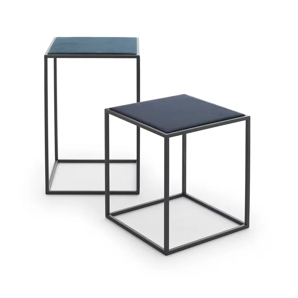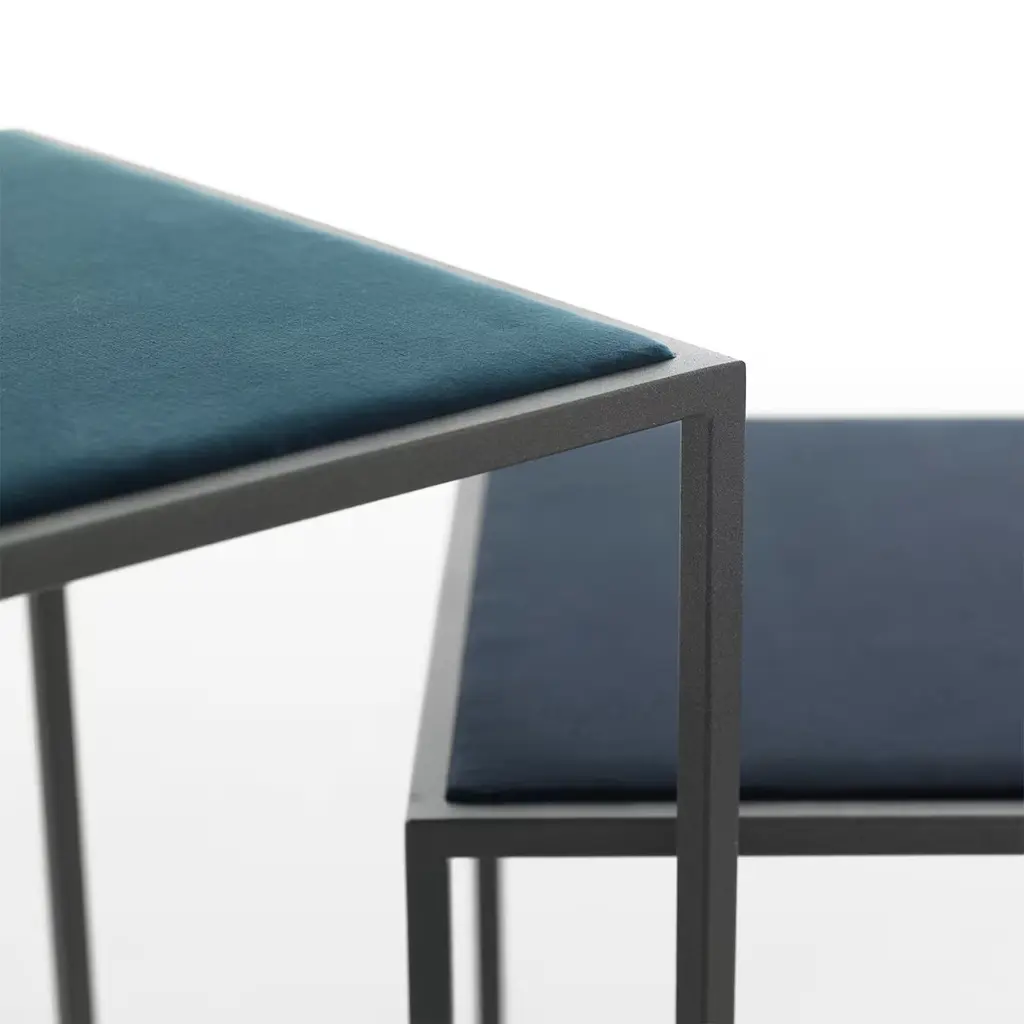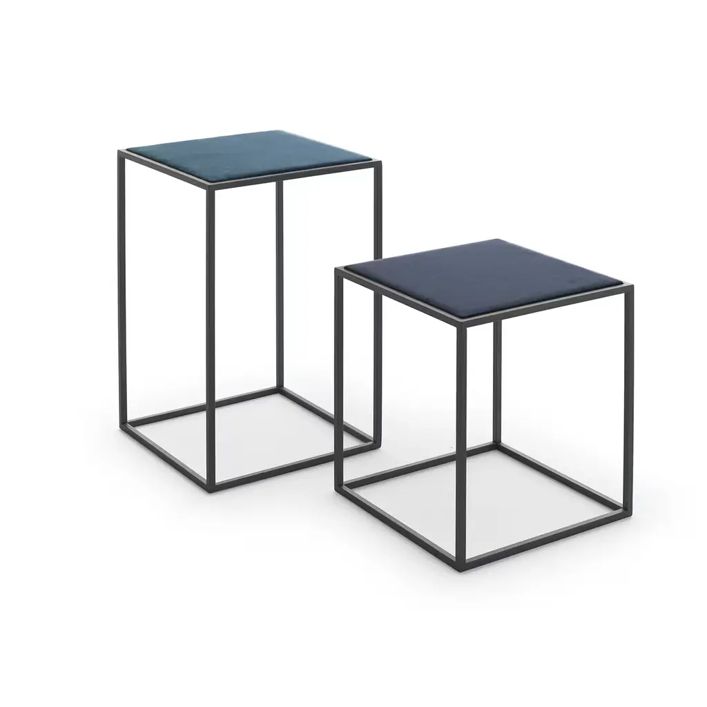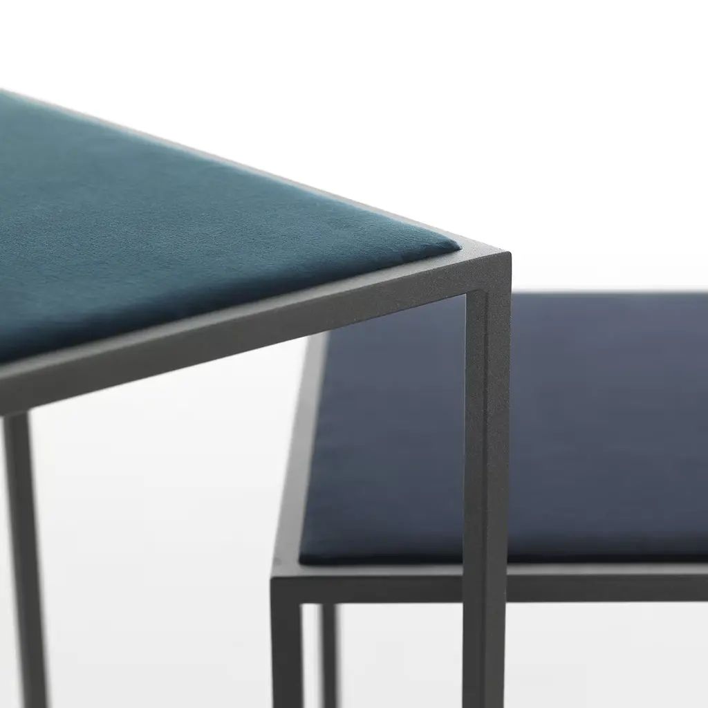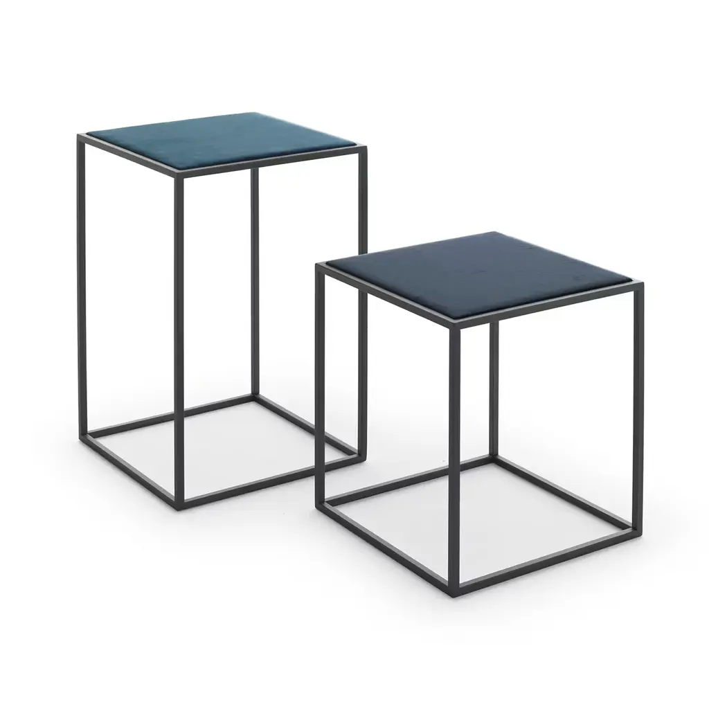 Part of the Gotham collection designed in 2015 by Federico Carandini, this tall side table will add elegance and sophistication to a contemporary living room, entryway, or bedroom. A striking piece, this object of functional decor is light and versatile and can be displayed alone or with the Gotham Low Side Table for a dynamic effect. Its steel structure is painted in grey, while the top is upholstered in blue cotton velvet for a sumptuous final effect. The color of the velvet can be changed - please ask the concierge for details.