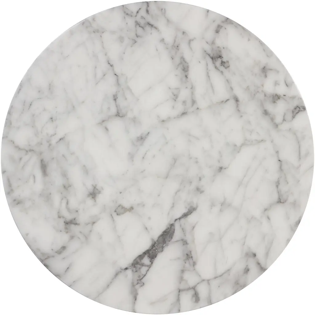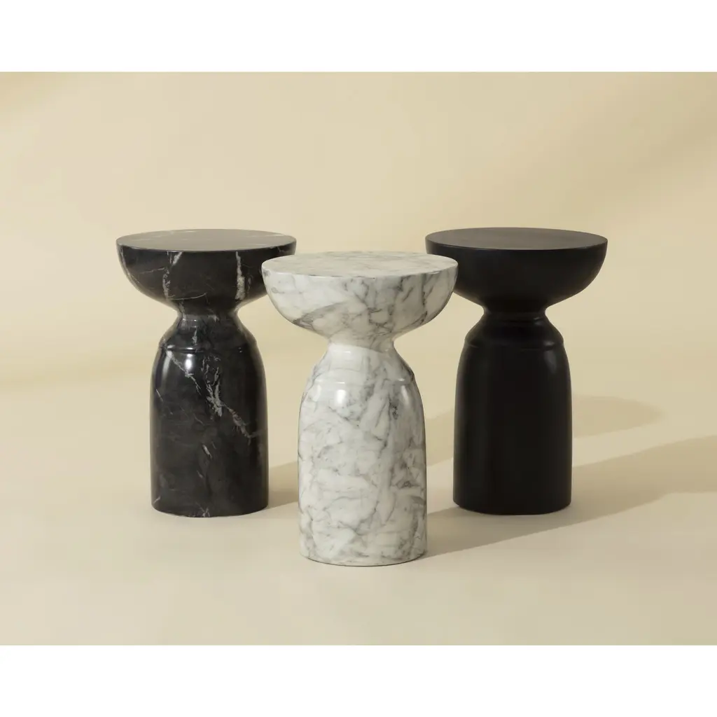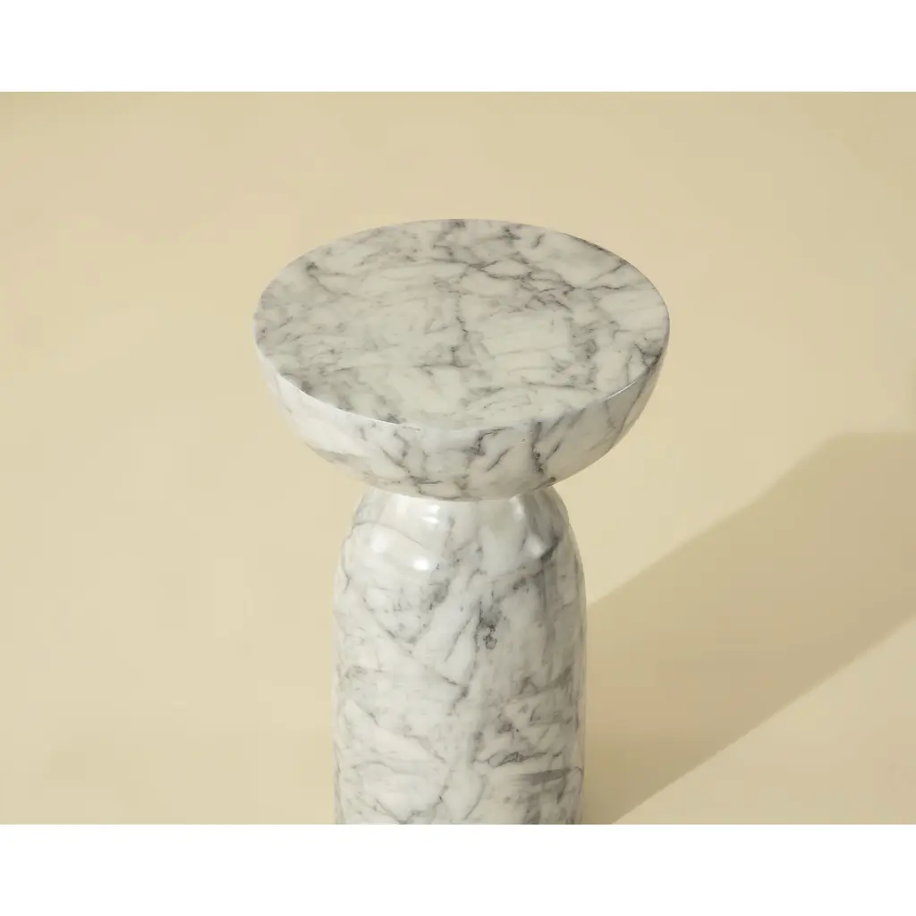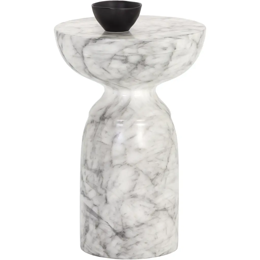 A compact and gracefully sculpted end table. Made from concrete with a white marble look finish, this versatile and attractive piece is