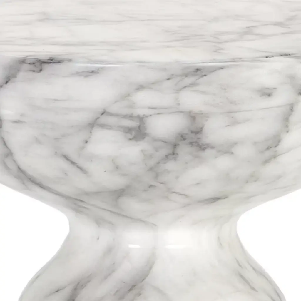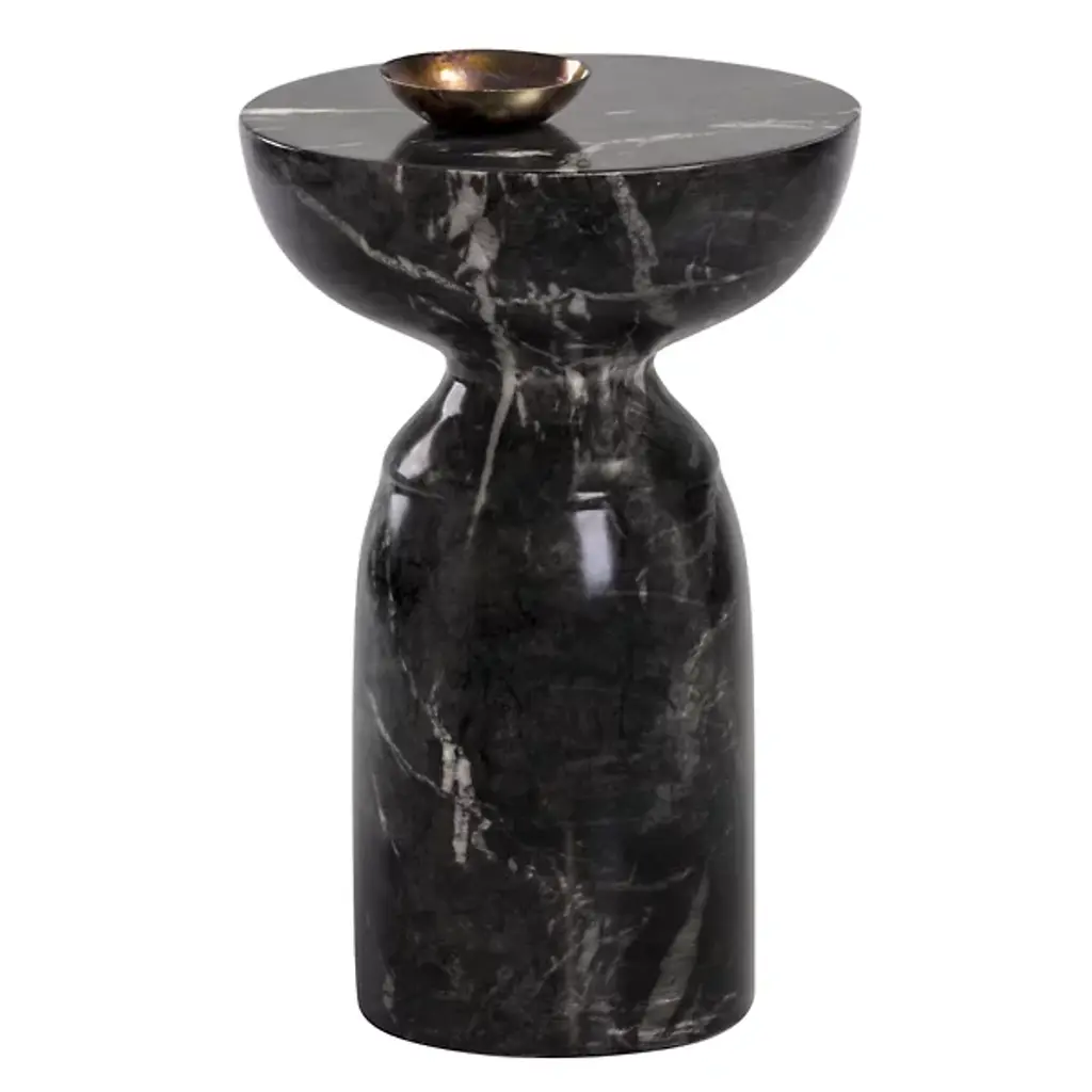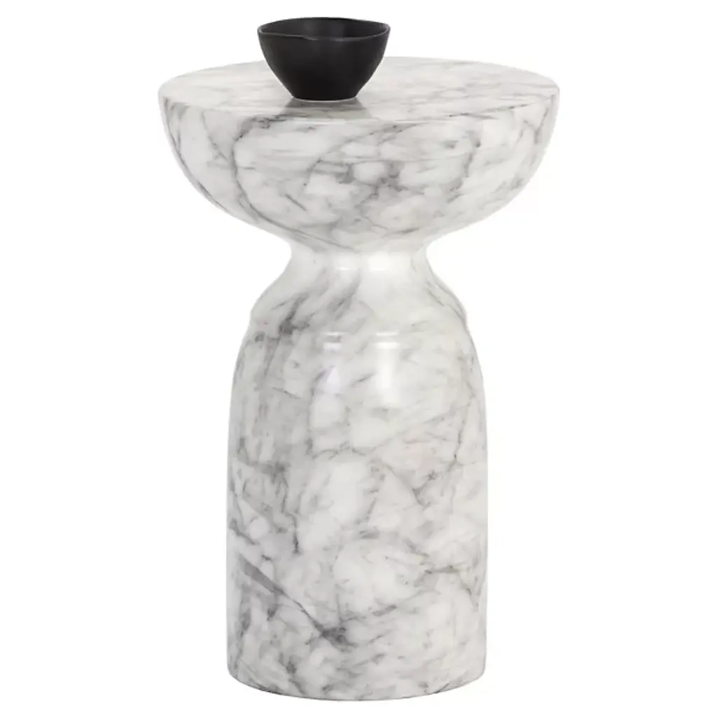 The Goya Indoor/Outdoor End Table by Sunpan offers a compact and elegantly sculpted design. Crafted from concrete, it features a sophisticated marble look, finished with an acrylic coating. This stylish and practical piece is well-suited for both indoor and covered outdoor spaces. The design features a tall cylinder with an inverted dome as a tabletop, contrasting curving surfaces, and durable materials to make it an ideal addition to the decor, whether inside or in covered outdoor areas.