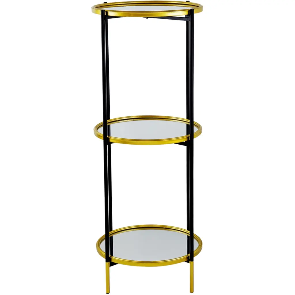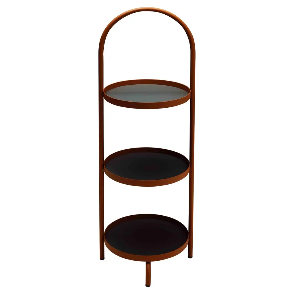This tiered side table is designed with a sturdy steel frame and three circular surfaces for displaying favorite accents.