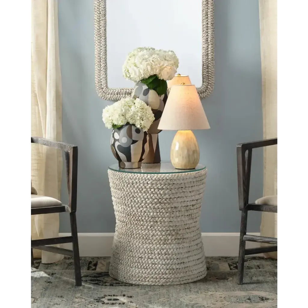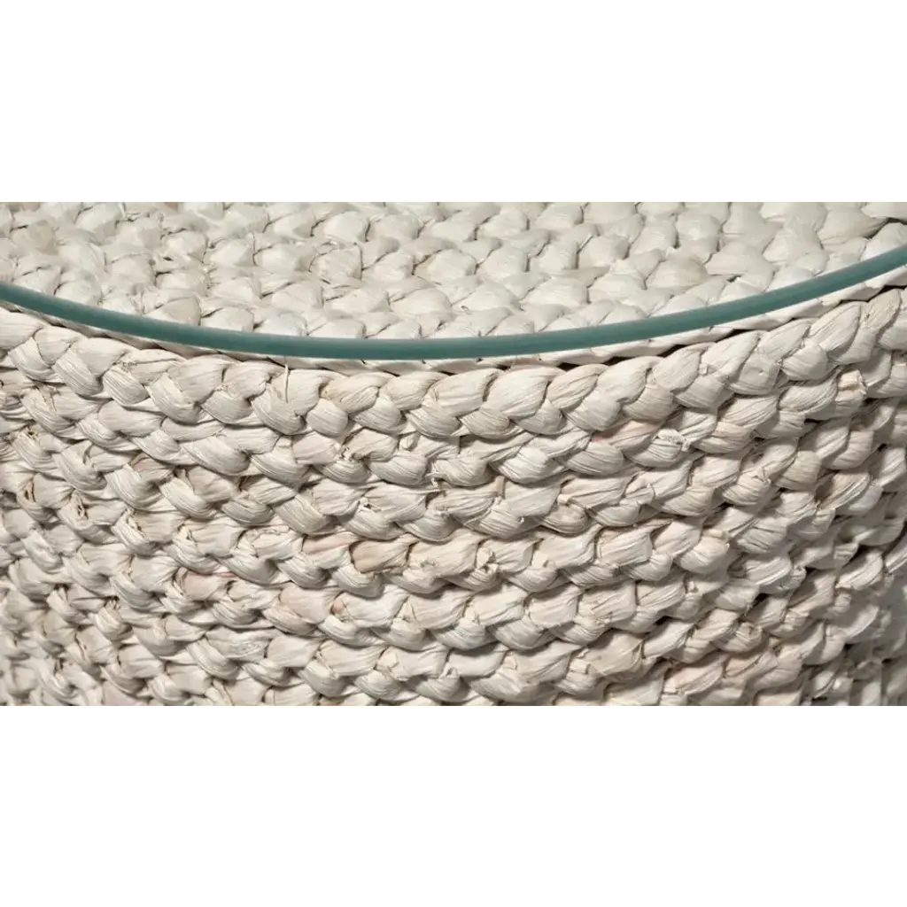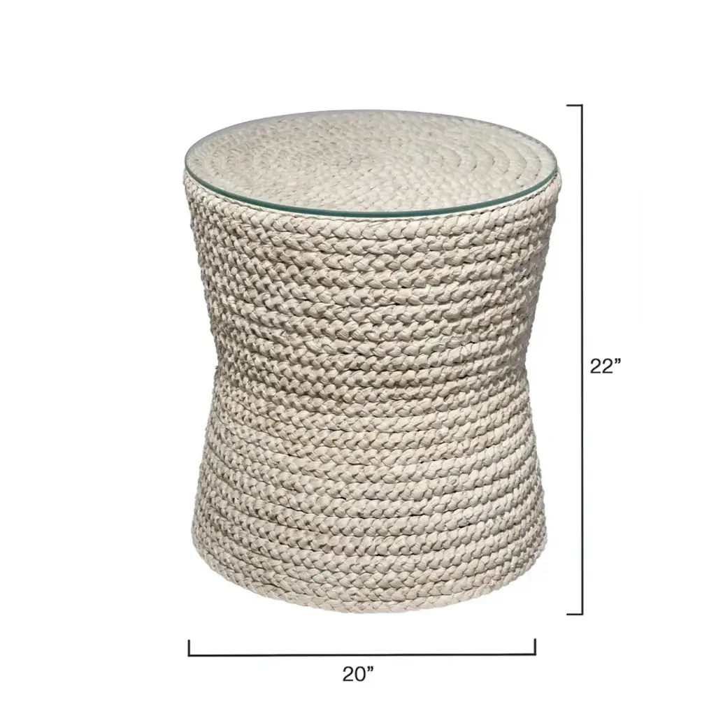 Elegantly wrapped in rows of braided corn husk, this small side table features a sturdy tempered glass top, making it a perfect fit for any casually refined decor. The unfinished husk showcases a variety of colors, adding unexpected depth to its neutral palette. The result is a beautifully refined tropical piece that enhances any space.
