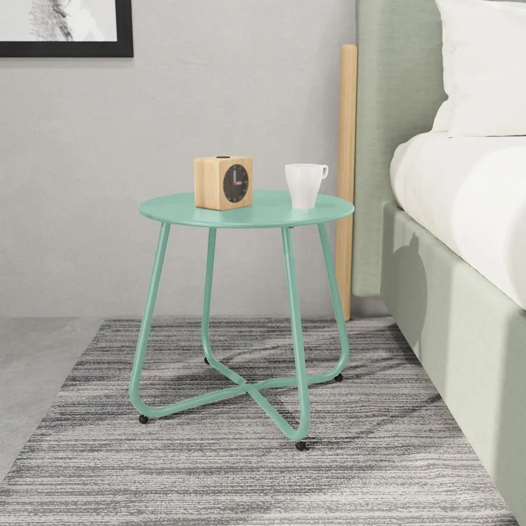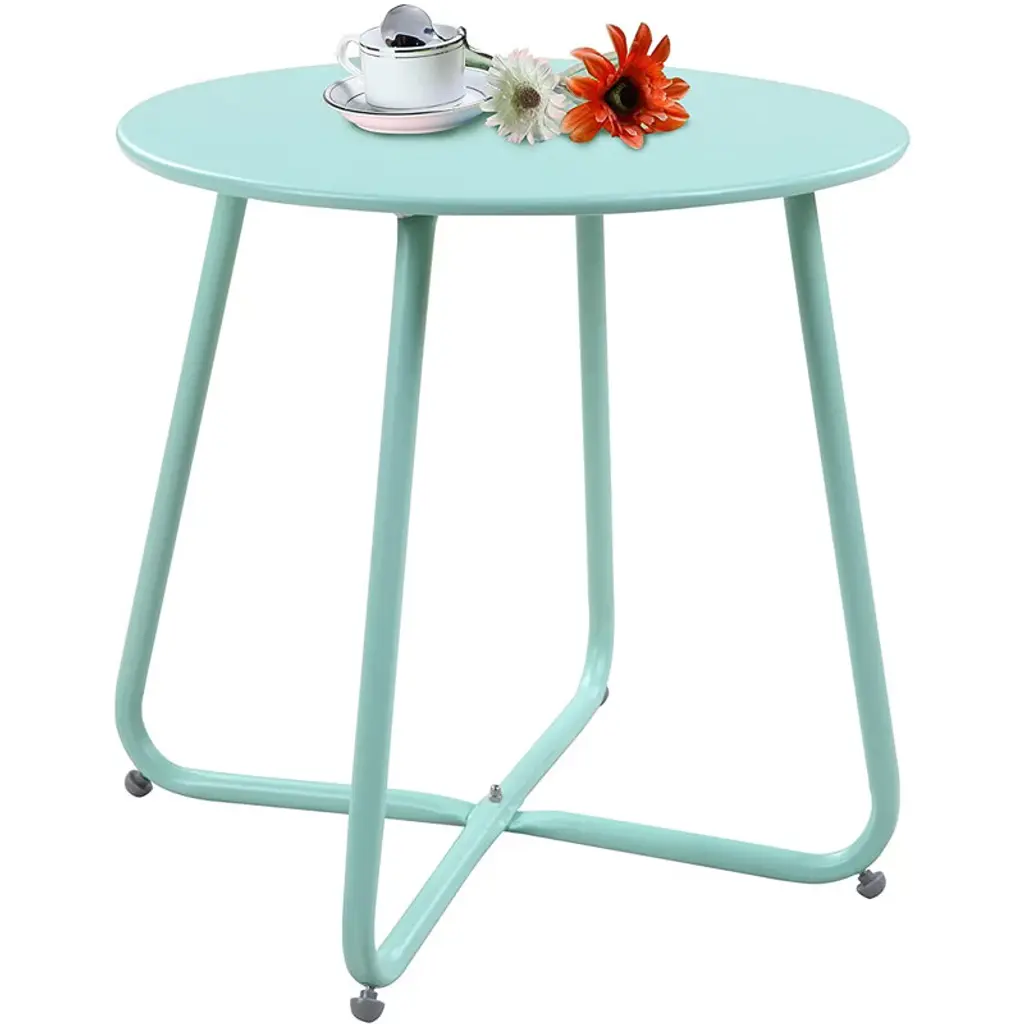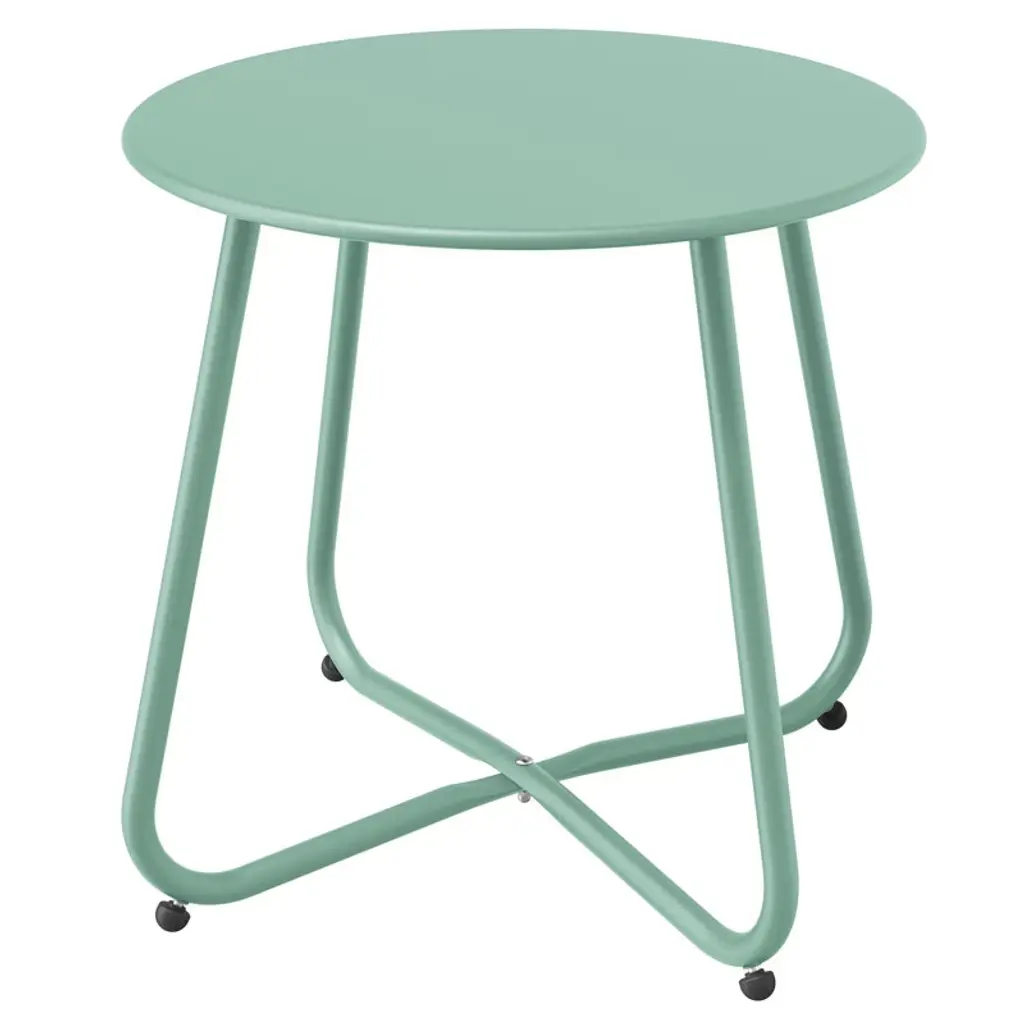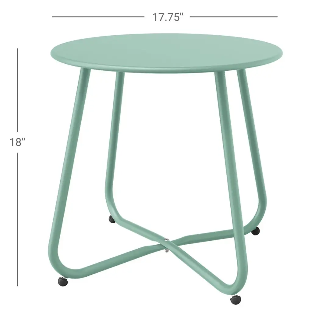 This patio side table adds a pop of color and practicality to your outdoor space. Crafted from metal with a steel top, this round table is both weather- and UV-resistant, making it a great choice for your patio or garden. Its lightweight design allows for easy rearranging, while four-foot caps ensure stability and protect your floors from scratches. Ideal for holding drinks or snacks, this table is easy to clean with just a damp cloth. Whether you're enjoying a morning coffee or evening cocktail, this table is ready to be your trusty companion.