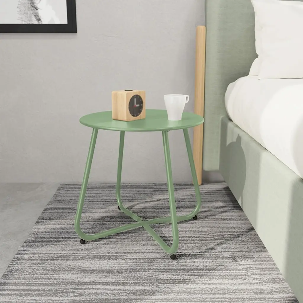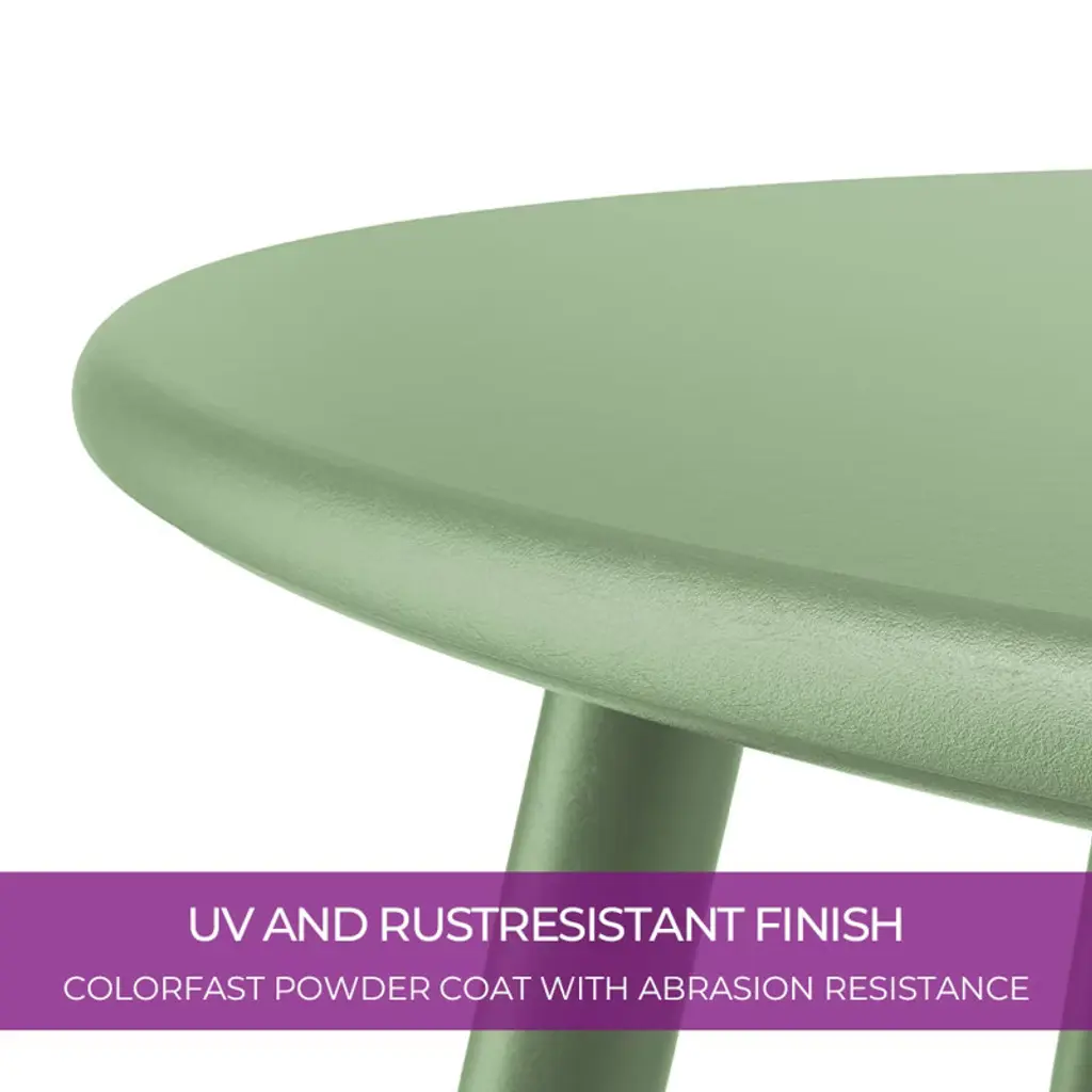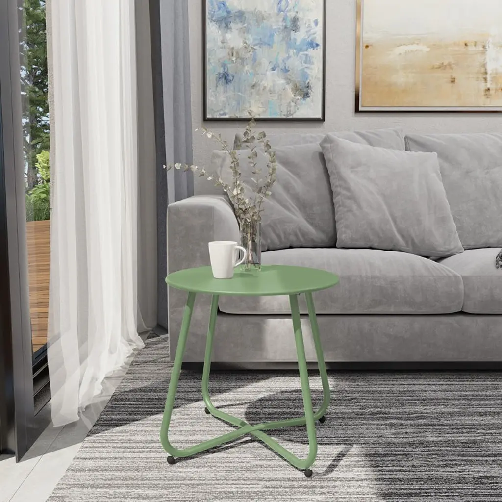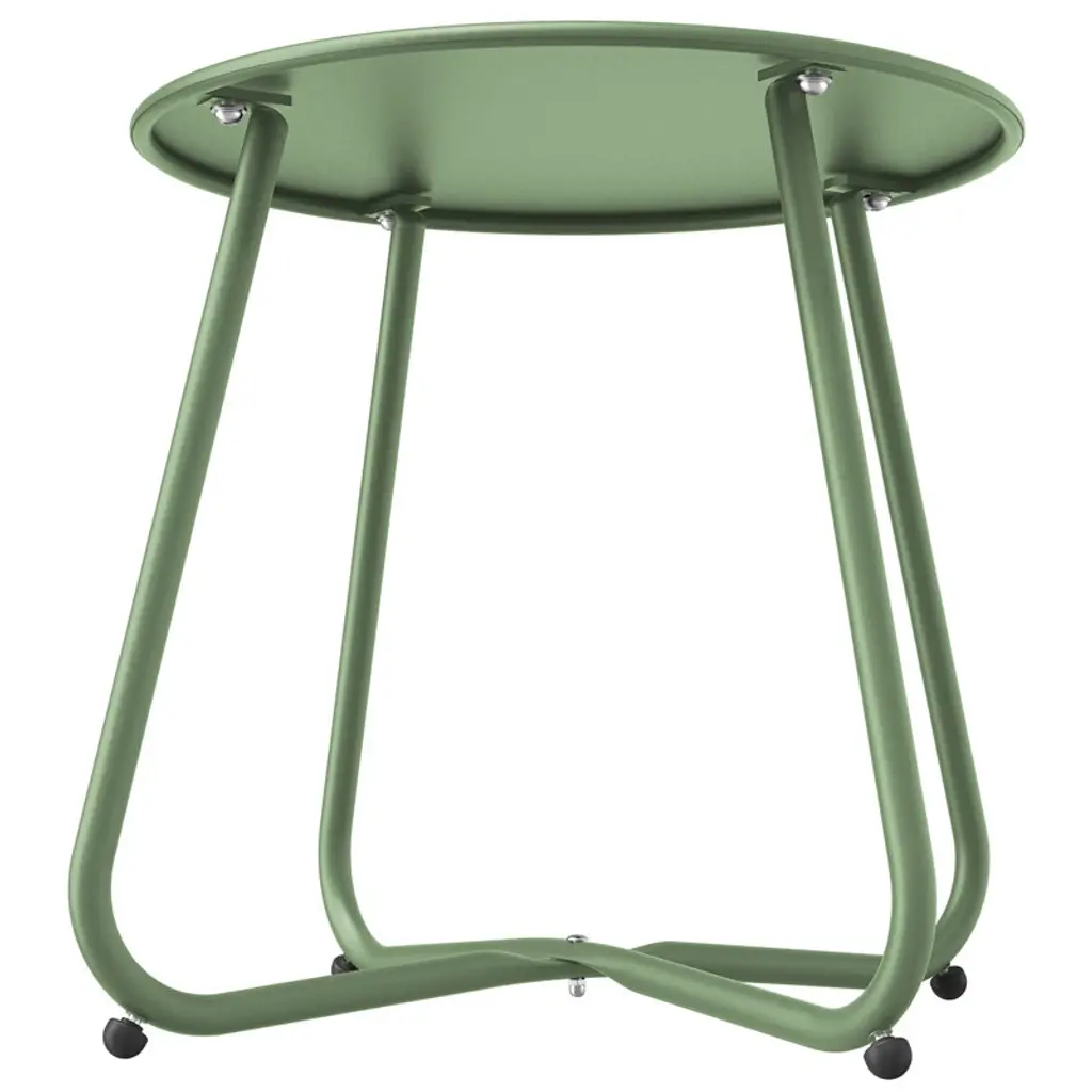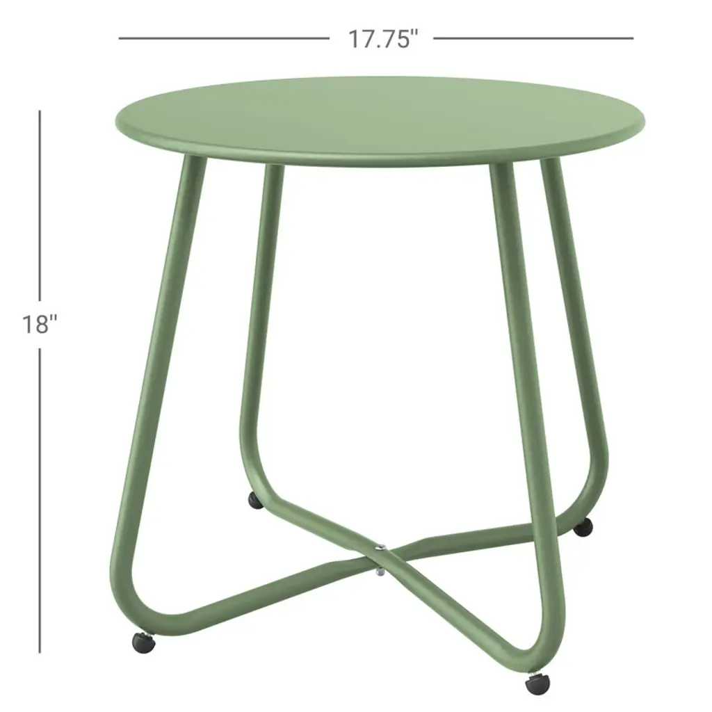 This patio side table adds a pop of color and practicality to your outdoor space. Crafted from metal with a steel top, this round table is both weather- and UV-resistant, making it a great choice for your patio or garden. Its lightweight design allows for easy rearranging, while four-foot caps ensure stability and protect your floors from scratches. Ideal for holding drinks or snacks, this table is easy to clean with just a damp cloth. Whether you're enjoying a morning coffee or evening cocktail, this table is ready to be your trusty companion.