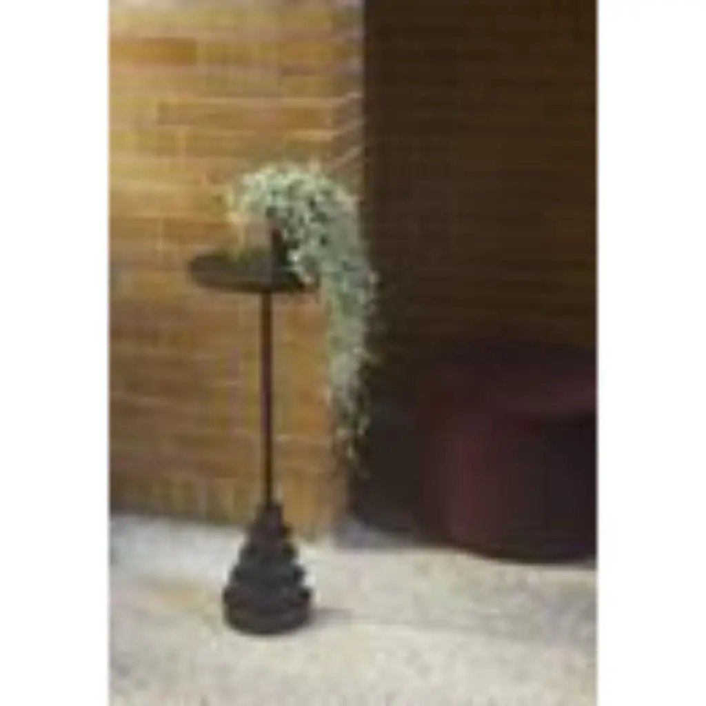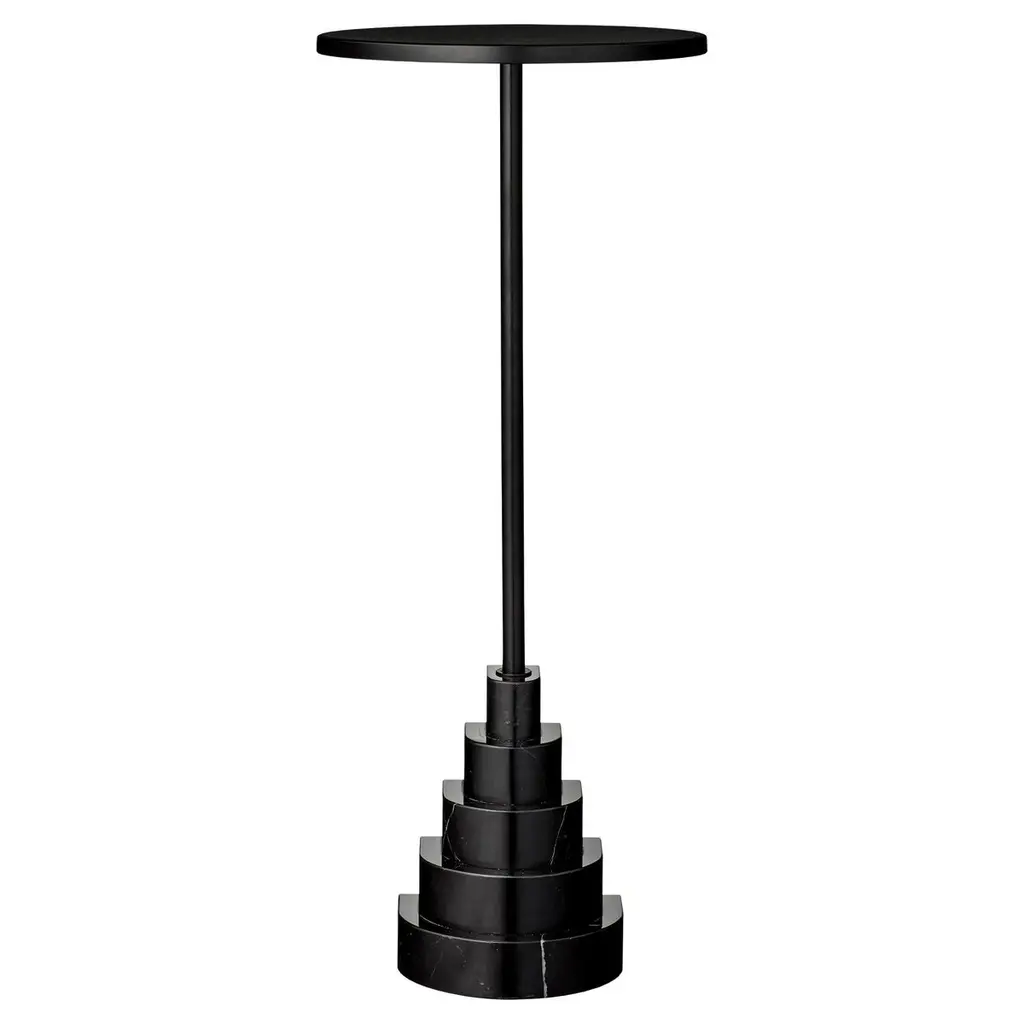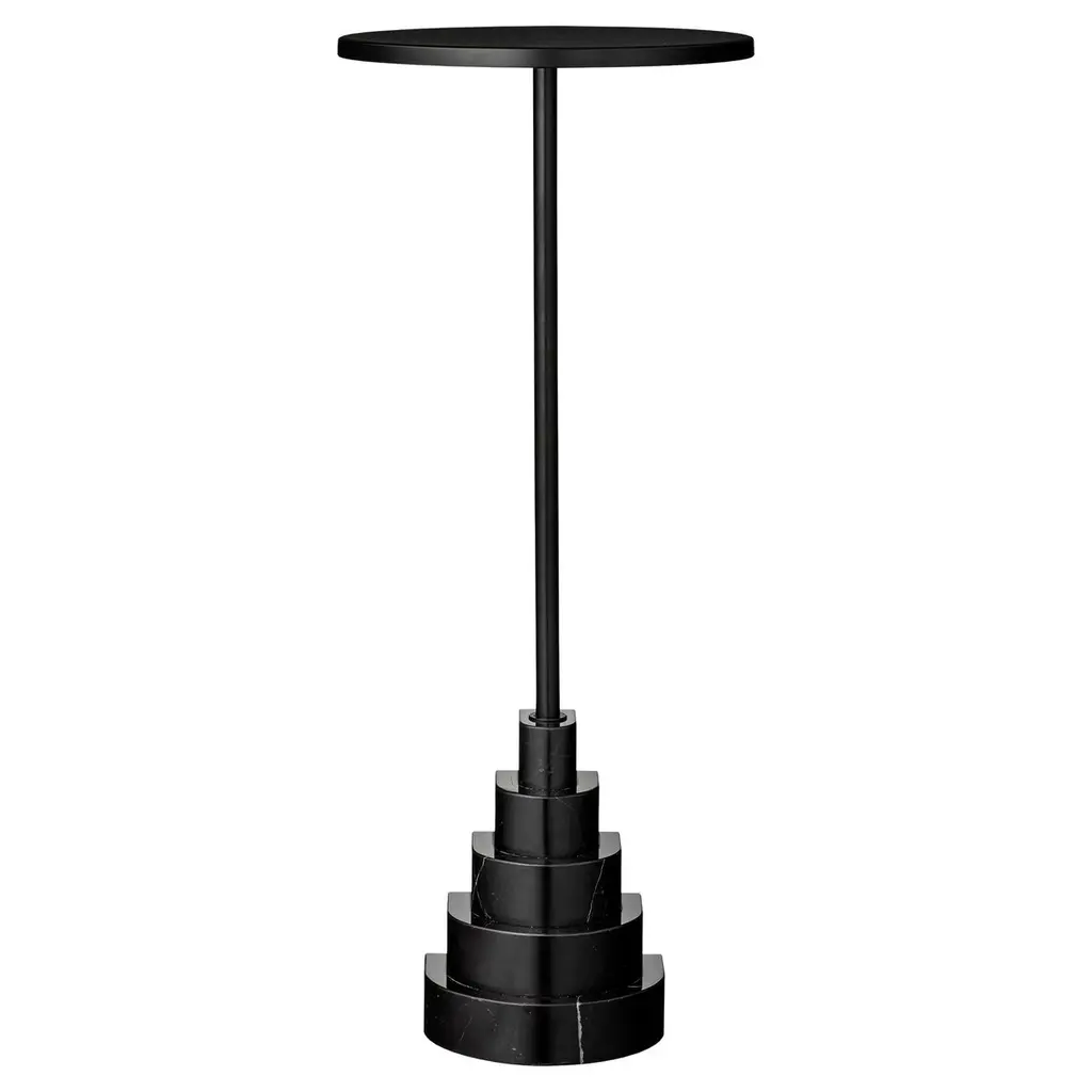 Granite and steel gold side tableDimensions: Ø 32 x H 78 cmMaterials: Steel, granite baseThe unique shape will make them stand out in any room in the home and truly appear as pieces of art. The tables are made of a foot in marble or granite in a graphic design fitted with an elegant tabletop in black or gold.