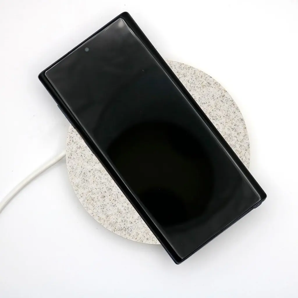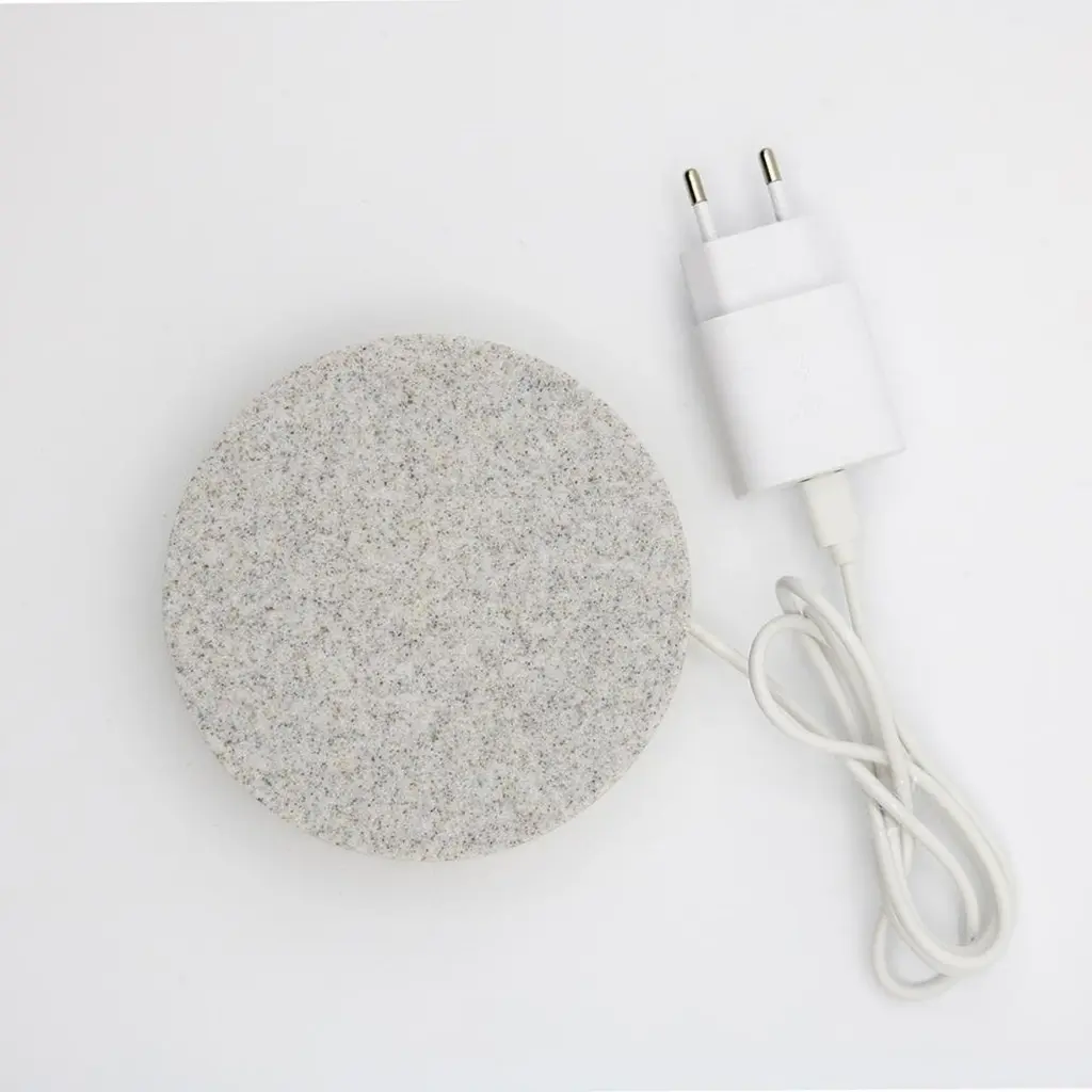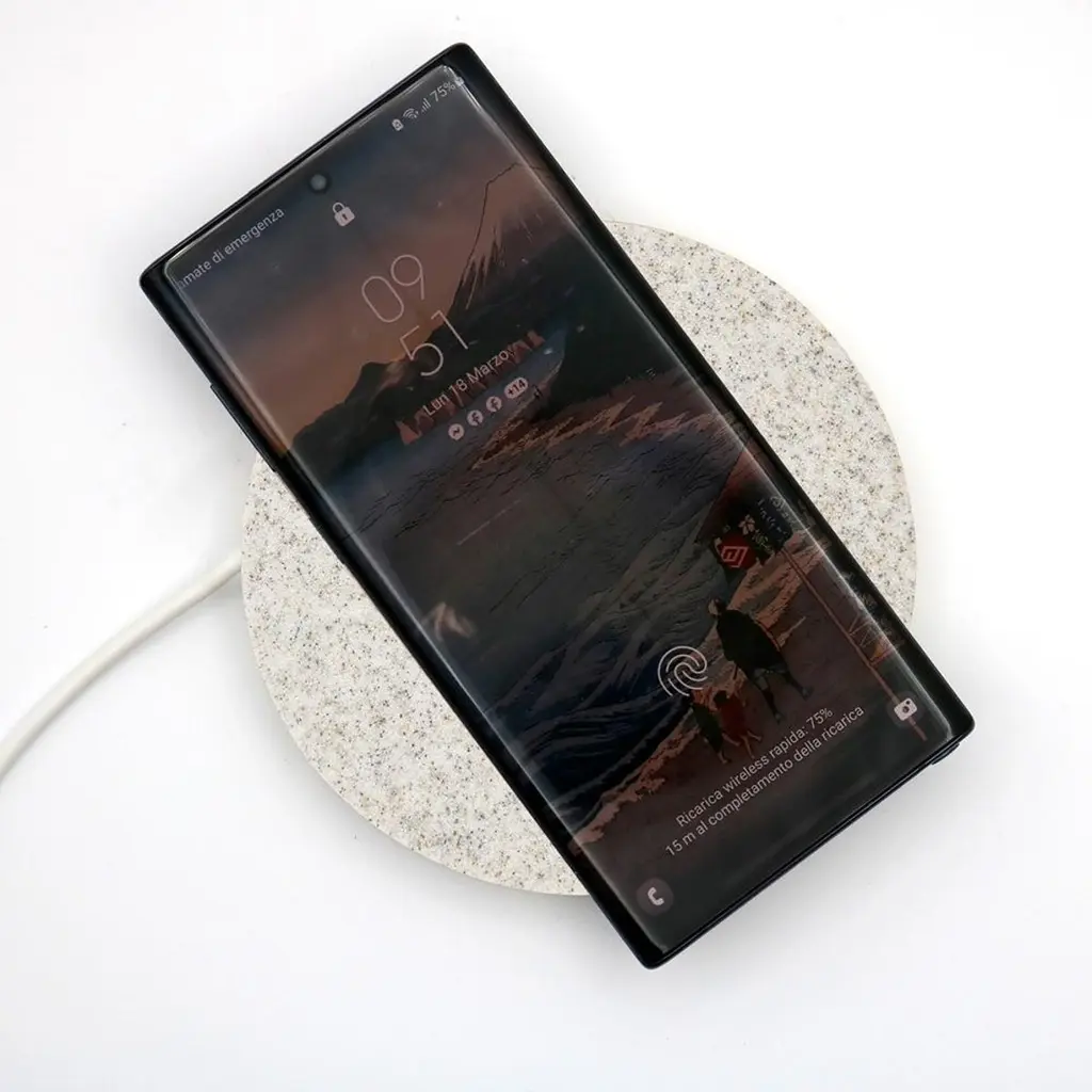A corian base,that quickly charges your phone, with a touch of magic. A circle, a corian, realized with the care that marble requires.A powerful wireless charging technology ensures an efficient and reliable power delivery.The result is a magical object, with a natural feeling,a piece of art that wonderfully fits on any table or bedside table,or everywhere you imagine.The color reminds of rocks, but it is only a part of thecomposition, one-third acrylic resin and two-thirds natural materials, creating a resistant, modern, and pleasant material.Designed and manufactured in Italy, 100% Italian marble, 0% plastics.- 15W power supply included in the box.- Measures: Integrated cable: 90cm (3ft)- Base diameter Ø 12cm (4.72in) Compatible with all Qi-enabled devices.
