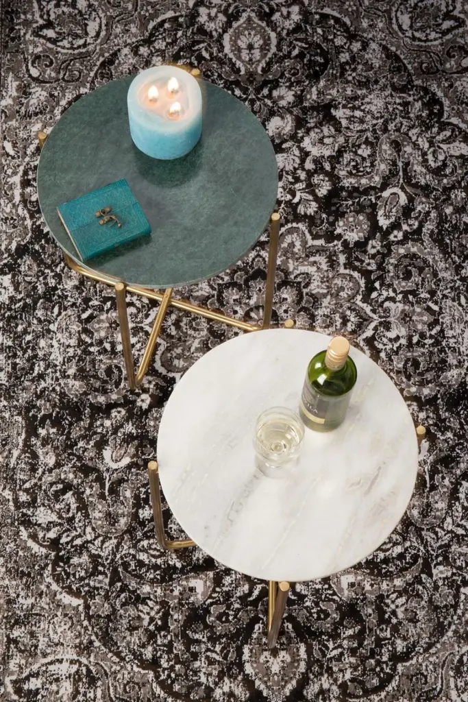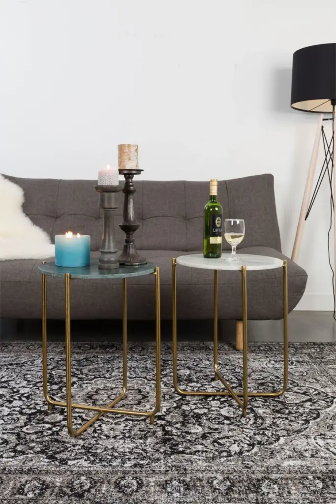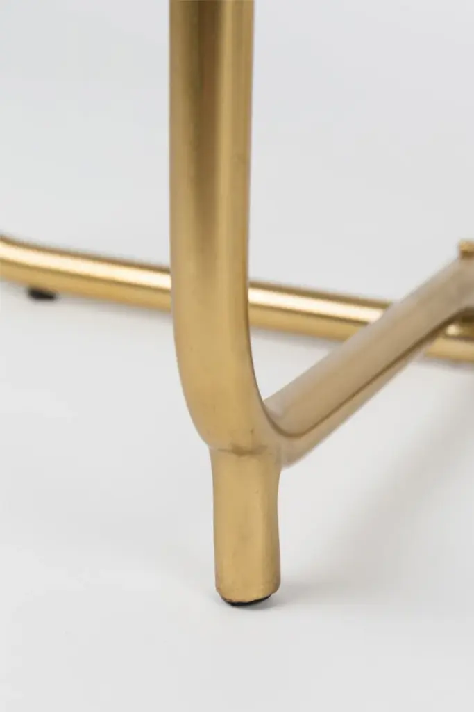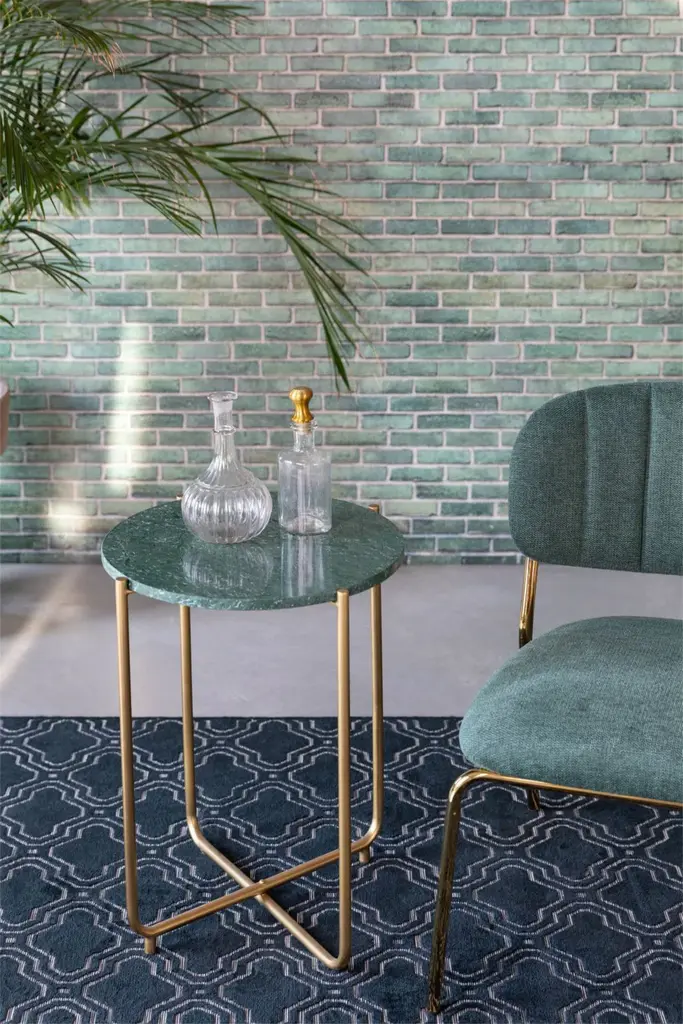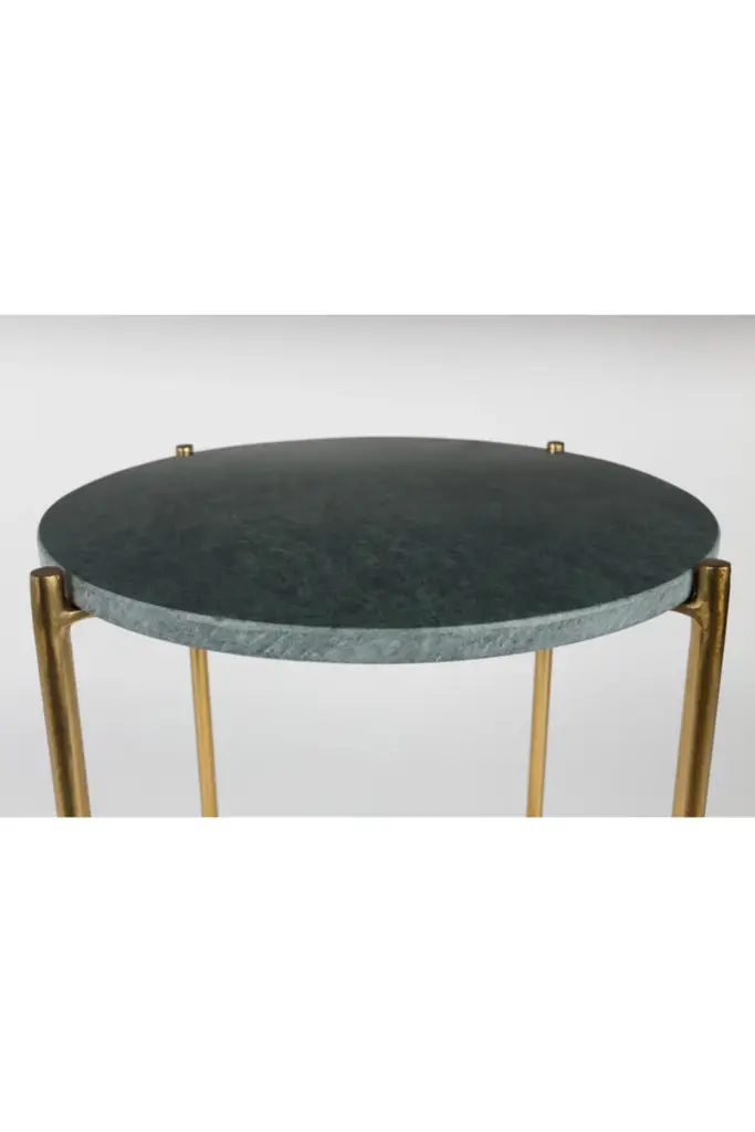 The Timpa Marble Side Table in Green by Dutch Furniture has a luxurious quality that enhances your home beautifully. With it's green marble table top and brass plated iron tube frame, it accentuates sophistication while serving in functionality.