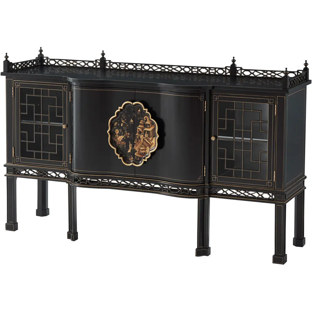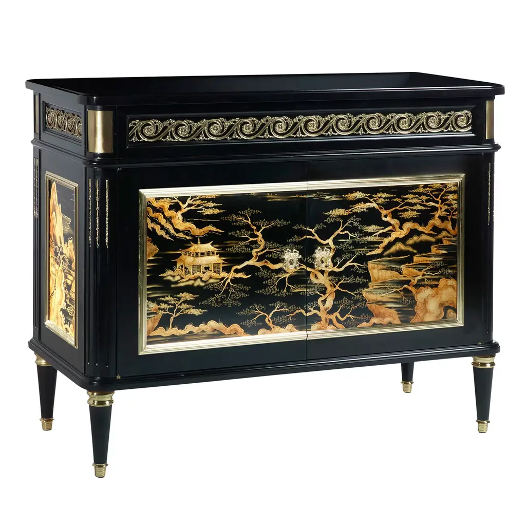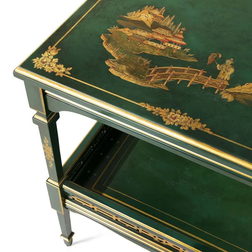 A stunning addition to a modern or eclectic decor, this unique solid wood side table is elegant and versatile, providing two levels of storage and display for small everyday items or collectibles. Either in a living room or entryway, or as colorful nightstand, this piece will enliven a room with its exquisite, hand painted decor over the vivid green background. The top is decorated with a chinoiserie motif, which occurs also in the carved sides of the bottom tray.