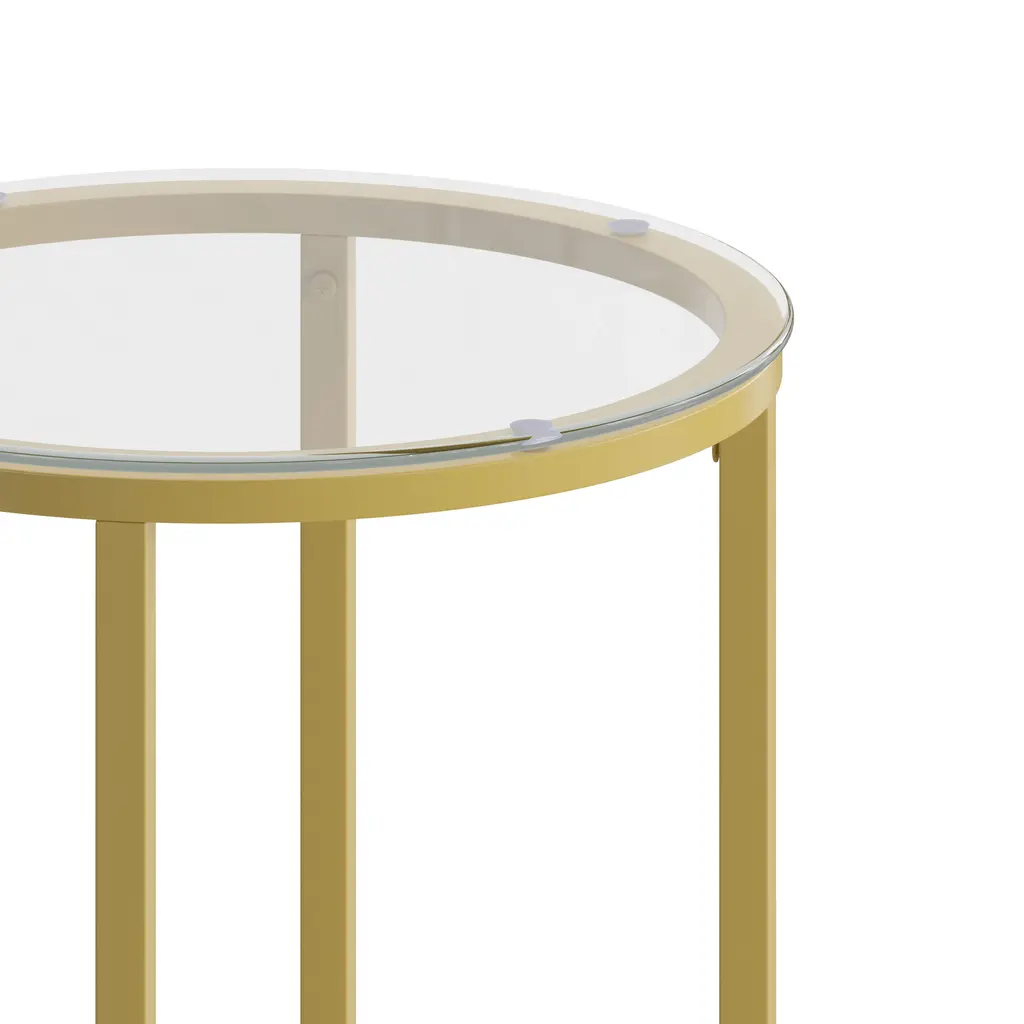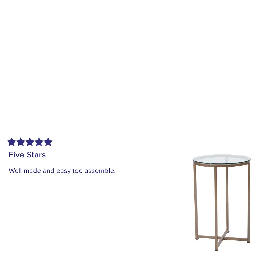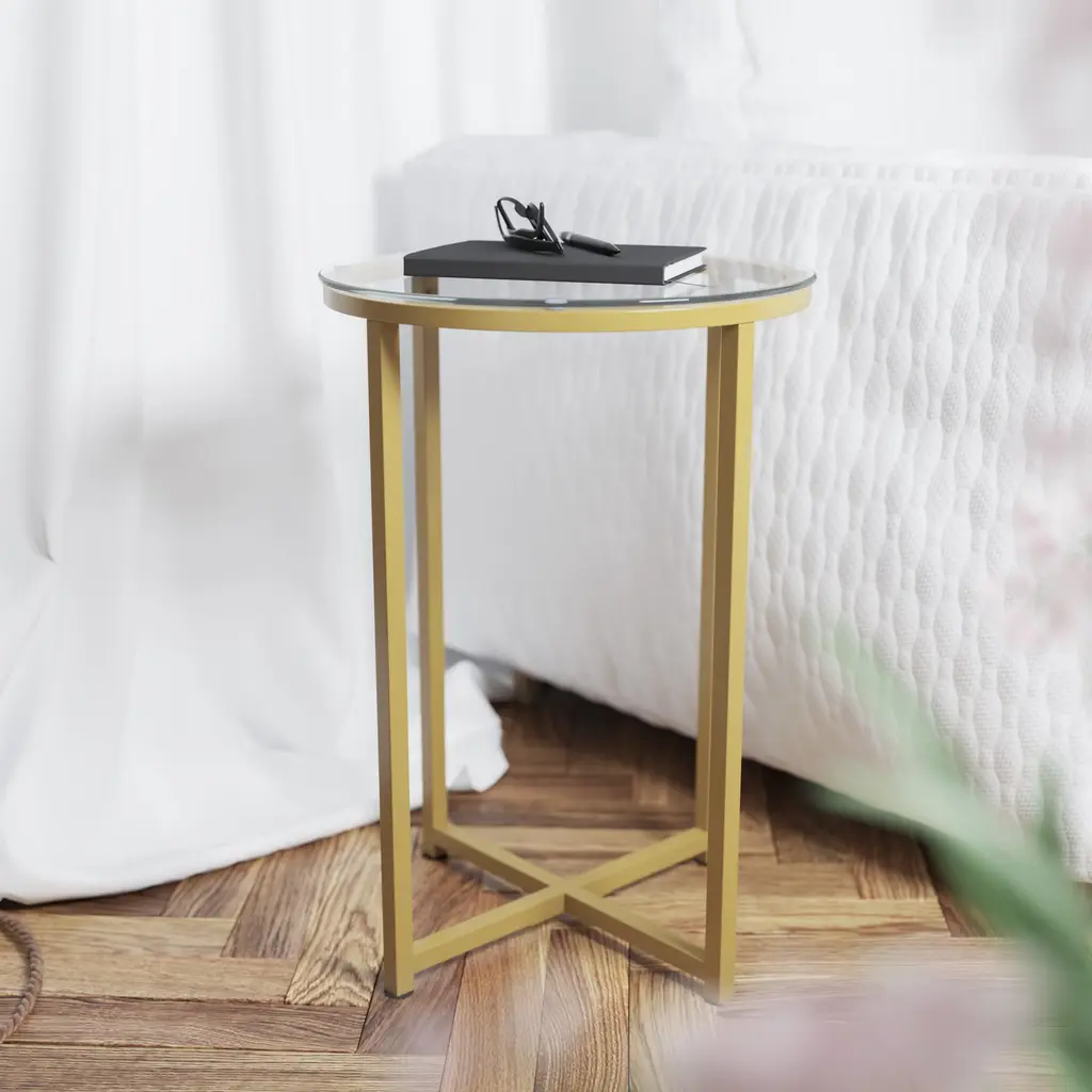 Lend your home or office sitting area a sophisticated, polished look with this round glass end table with metal legs.. This table combines a glass top with straight legs to provide a contemporary look that's sure to tie any trendy room's presentation together. The surface area serves as a convenient space for holding belongings or displaying magazines, newspapers, and brochures. Meanwhile, its compact construction allows it to fit perfectly between sofas and loveseats, or in corners of rooms. Plus, the glass offers a distinct, upscale look, and is tempered for superior strength to ensure it won't break even after heavy use.