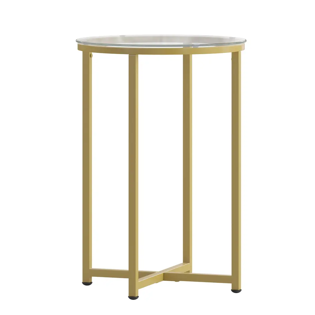 Lend your home or office sitting area a sophisticated, polished look with this round glass end table with metal legs.. This table combines a glass top with straight legs to provide a contemporary look that's sure to tie any trendy room's presentation together. The surface area serves as a convenient space for holding belongings or displaying magazines, newspapers, and brochures. Meanwhile, its compact construction allows it to fit perfectly between sofas and loveseats, or in corners of rooms. Plus, the glass offers a distinct, upscale look, and is tempered for superior strength to ensure it won't break even after heavy use.