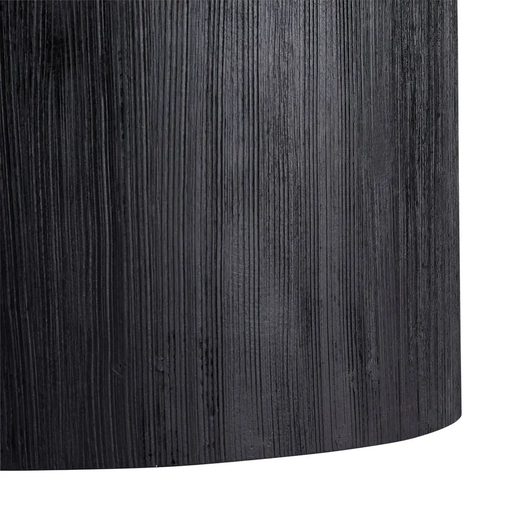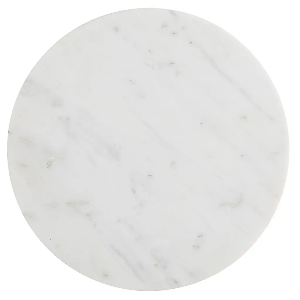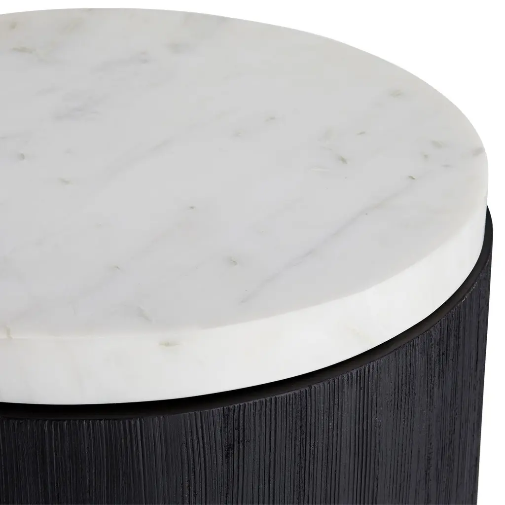 A round slab of white marble rests atop a wood base given a black finish. The result is simple yet sophisticated—organic elegance at its finest.