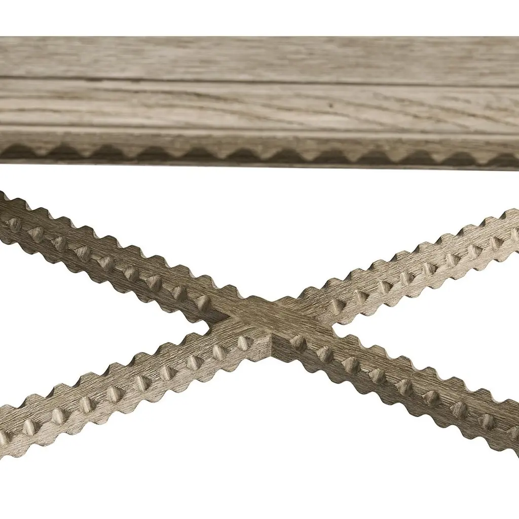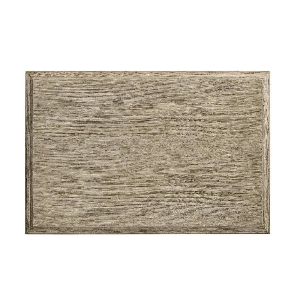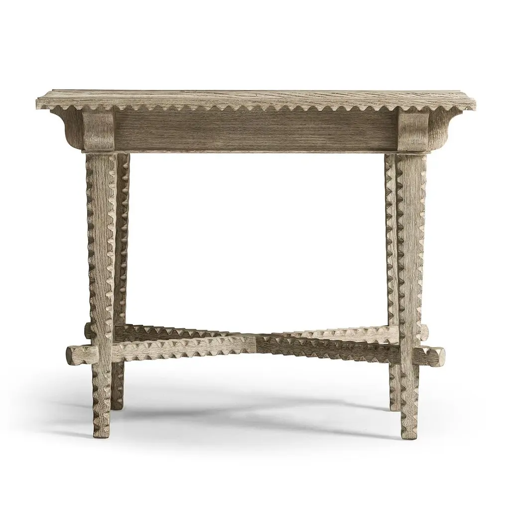 Featuring tramp-style carvings that add a touch of artisanal detail, this table showcases a greyed oak finish for a relaxed, airy feel. Its finely detailed legs and subtle cross-stretcher design enhance its rustic appeal, making it an exquisite addition to any refined living space. The light, versatile design seamlessly complements a variety of interiors, whether placed beside a luxurious sofa or as a stand-alone statement piece.Handcrafted from premium oak, this end table balances durability with aesthetic charm. Its thoughtfully carved edges add a sense of heritage and tradition while maintaining a contemporary edge. Dimensions: 28" W x 18.625" D x 23" H