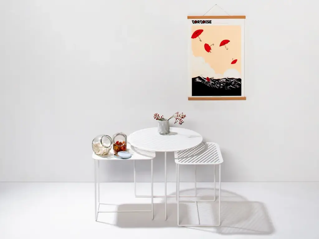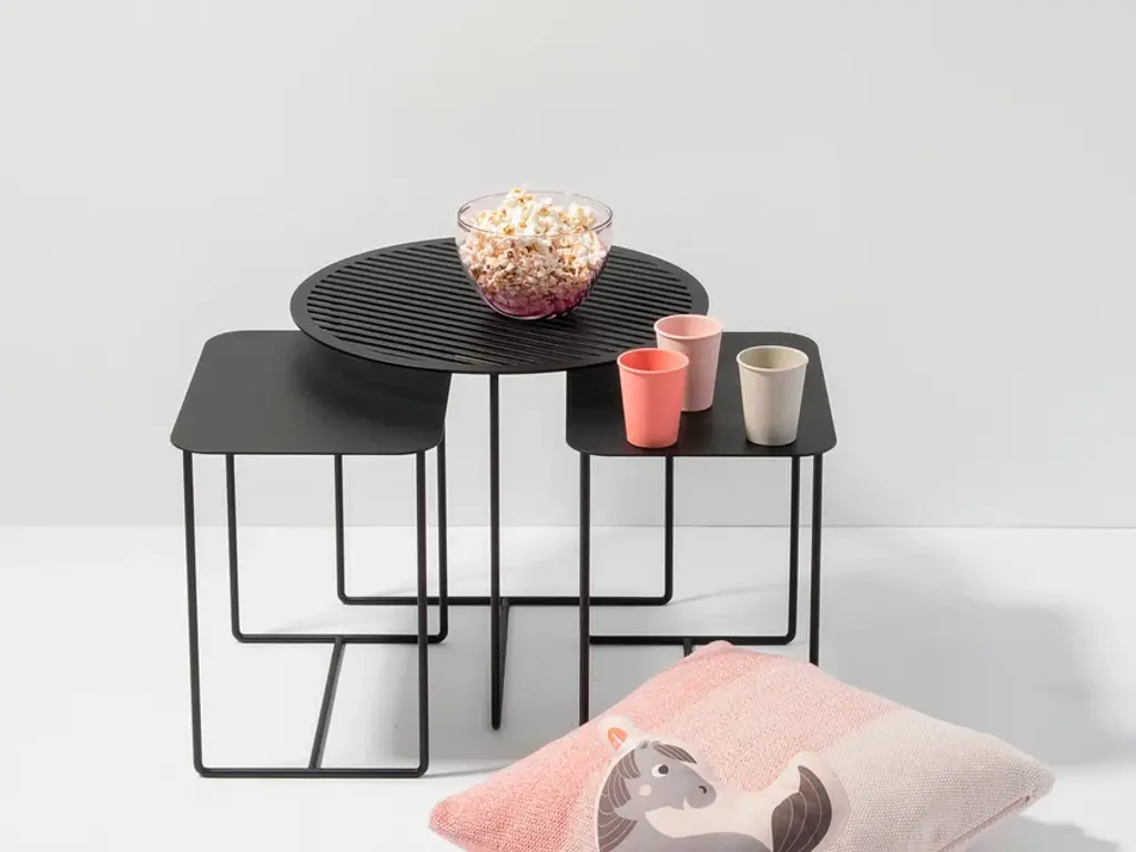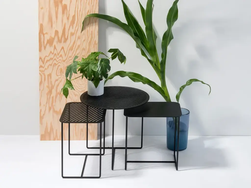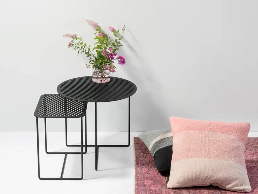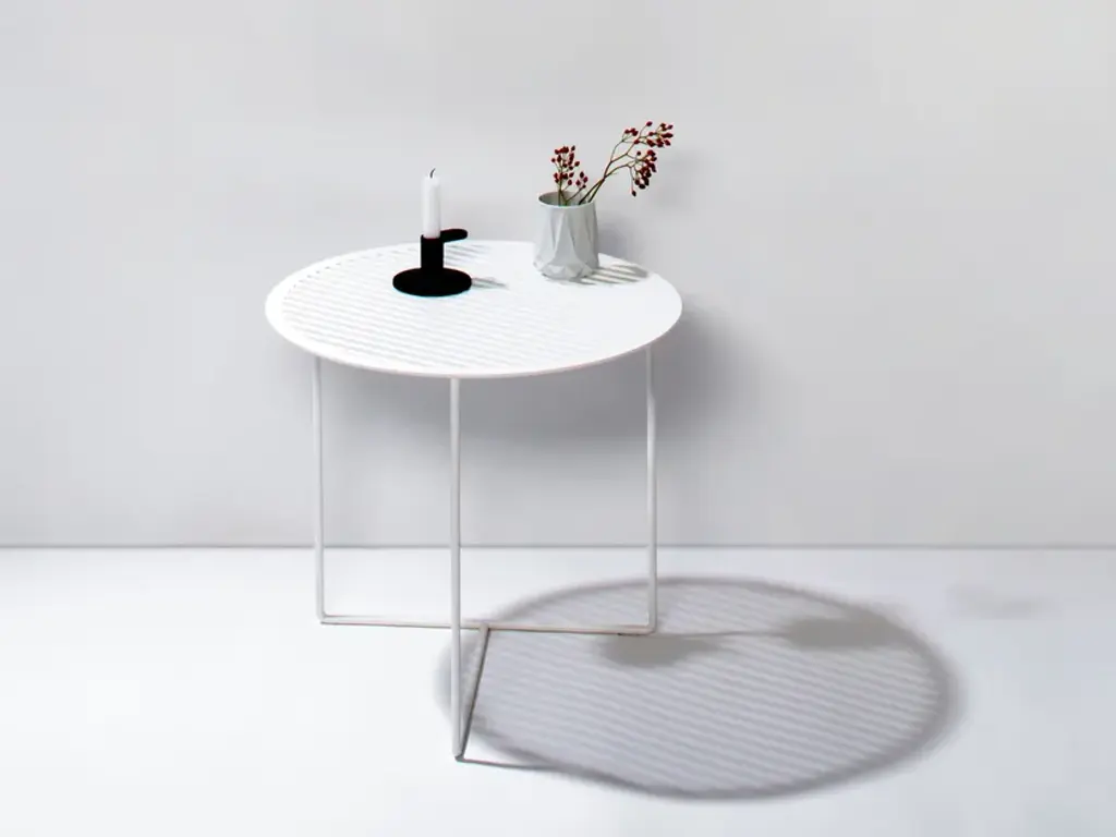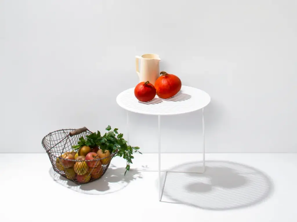 The distinctive structure of the Grid tabletop creates an attractive pattern of light and shadow that will draw all eyes to the Grid 01 Side Table. Especially when grouped with the rectangular side tables of the Solid & Grid collection, this small table is a design superstar. The frame is made of round iron bars that underscore the graceful character of the table. Its u-shaped legs makes the Grid 01 Side Table suitable for patios and balconies as well. Available in black and in white.Material: Sheet steel and round iron bars with powder coatingPurchase includes: Side tableIn designing our Solid & Grid collection, we set out to create a style-defining, recurring graphical structure for furniture and home accessories. We were aiming for a pattern that looks light and elegant while offering sturdy durability. And we achieved this with a diagonally cut grid made of steel. After we came up with our first models featuring diagonal slits, we designed several solid versions as well. All furniture and home accessories in the Solid & Grid collection are precisely cut using a laser and covered with a durable powder coating.