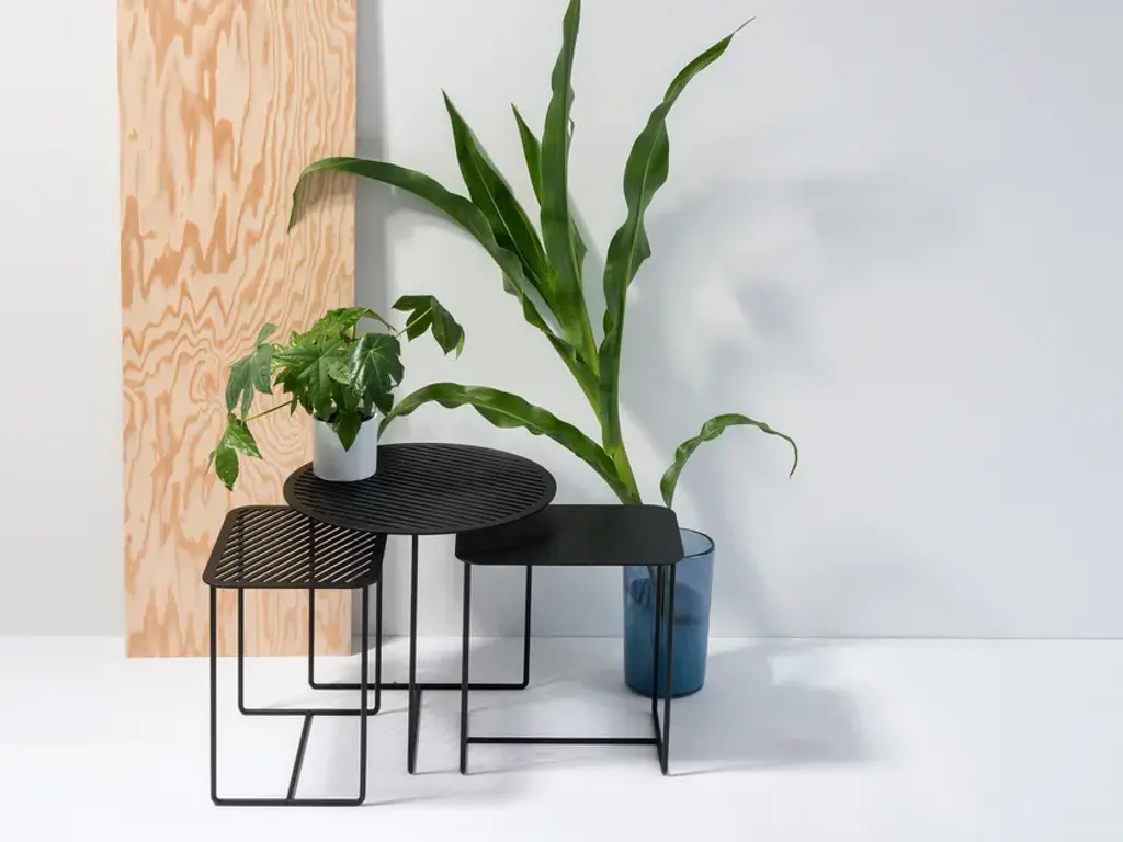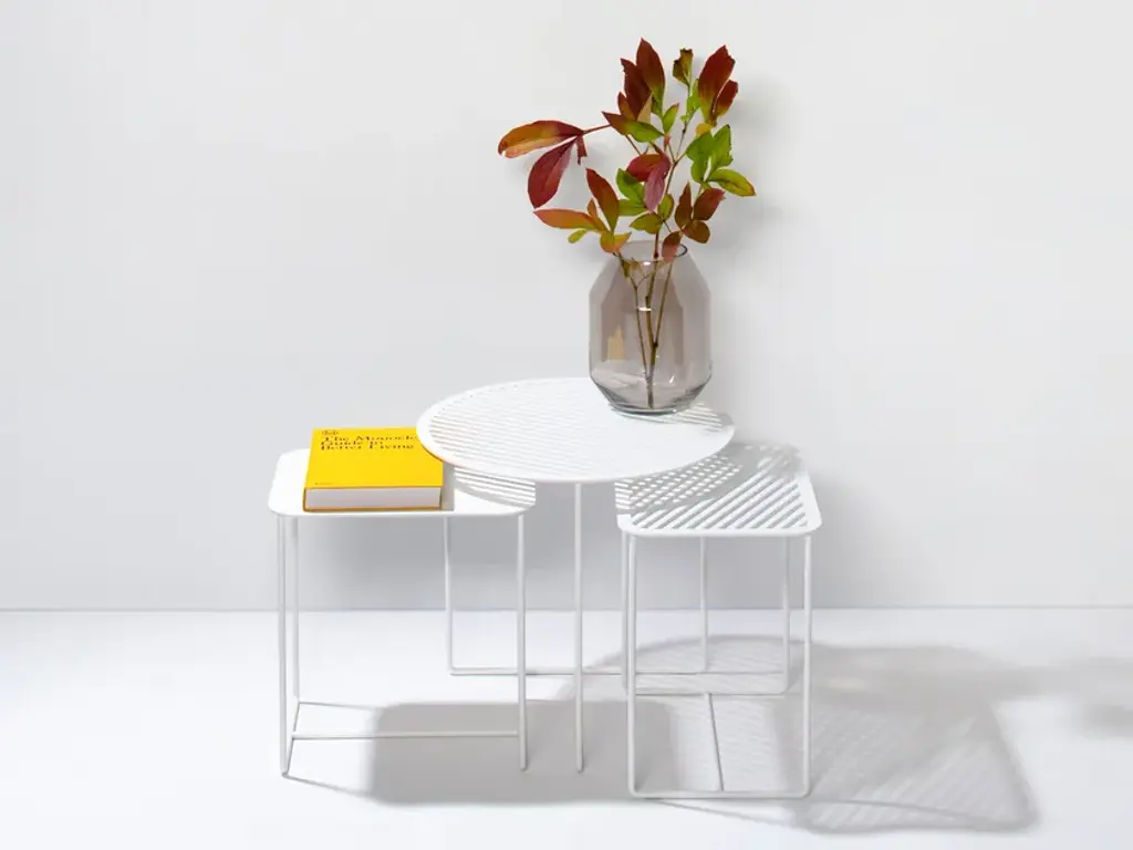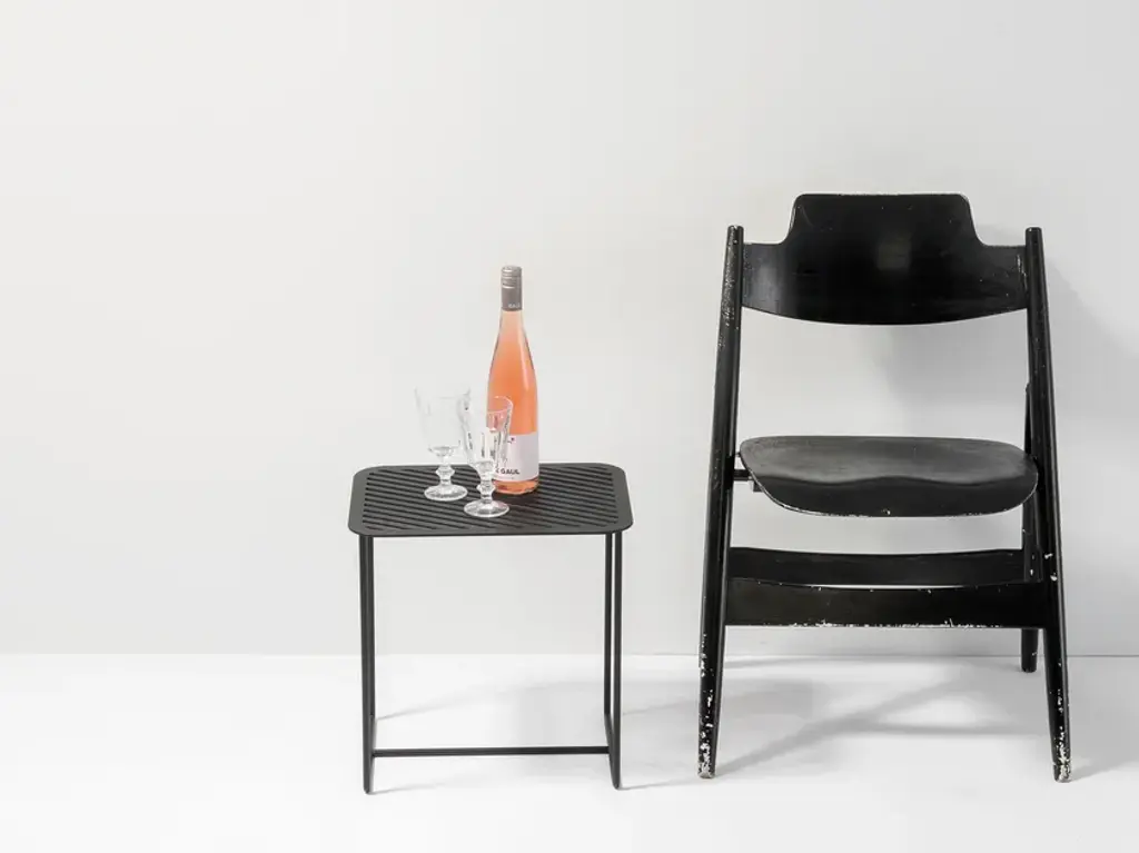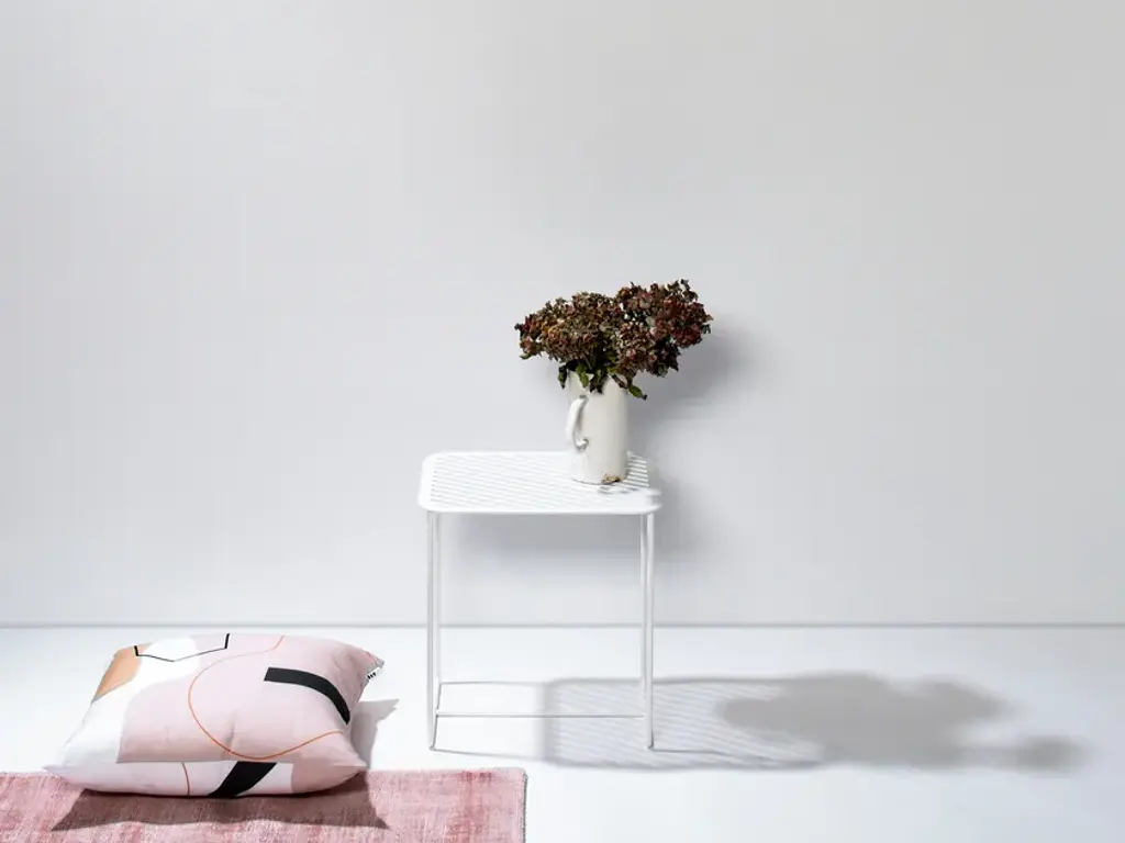 The distinctive structure of the Grid tabletop creates an attractive pattern of light and shadow that will draw all eyes to the Grid 02 Side Table. Especially when grouped with the rectangular side tables of the Solid & Grid collection, this small table is a design superstar.The frame is made of round iron bars that underscore the graceful character of the table. Its u-shaped legs makes the Grid 02 Side Table suitable for patios and balconies as well. Available in black and in white.Material: Sheet steel and round iron bars with powder coatingPurchase includes: Side tableIn designing our Solid & Grid collection, we set out to create a style-defining, recurring graphical structure for furniture and home accessories. We were aiming for a pattern that looks light and elegant while offering sturdy durability. And we achieved this with a diagonally cut grid made of steel. After we came up with our first models featuring diagonal slits, we designed several solid versions as well. All furniture and home accessories in the Solid & Grid collection are precisely cut using a laser and covered with a durable powder coating.