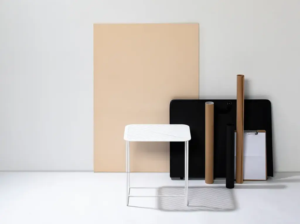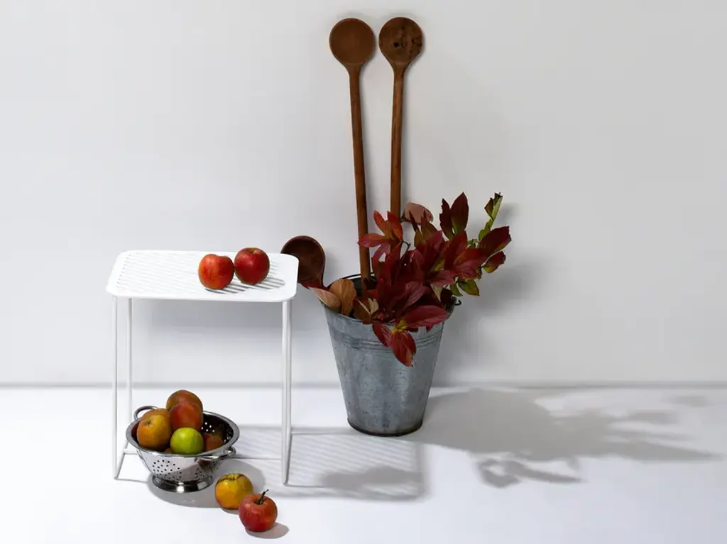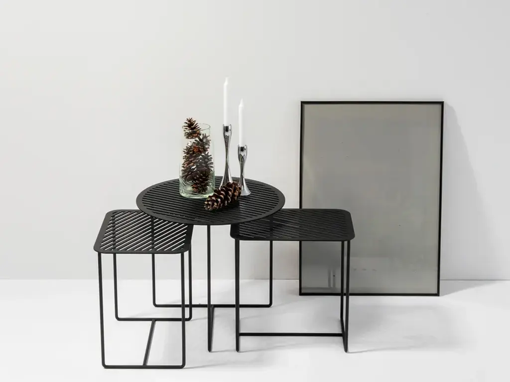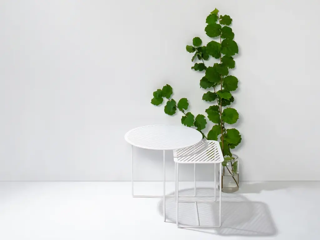 The distinctive structure of the Grid tabletop creates an attractive pattern of light and shadow that will draw all eyes to the Grid 02 Side Table. Especially when grouped with the rectangular side tables of the Solid & Grid collection, this small table is a design superstar.The frame is made of round iron bars that underscore the graceful character of the table. Its u-shaped legs makes the Grid 02 Side Table suitable for patios and balconies as well. Available in black and in white.Material: Sheet steel and round iron bars with powder coatingPurchase includes: Side tableIn designing our Solid & Grid collection, we set out to create a style-defining, recurring graphical structure for furniture and home accessories. We were aiming for a pattern that looks light and elegant while offering sturdy durability. And we achieved this with a diagonally cut grid made of steel. After we came up with our first models featuring diagonal slits, we designed several solid versions as well. All furniture and home accessories in the Solid & Grid collection are precisely cut using a laser and covered with a durable powder coating.