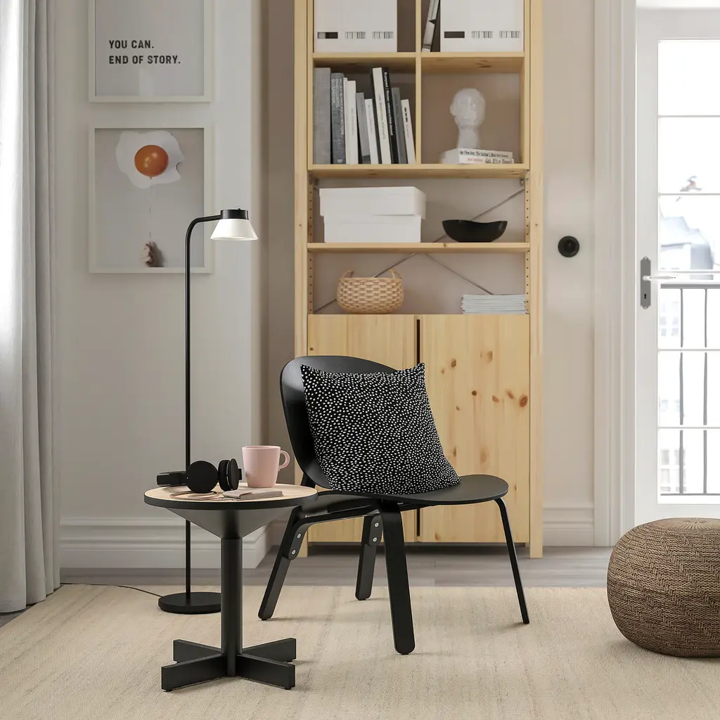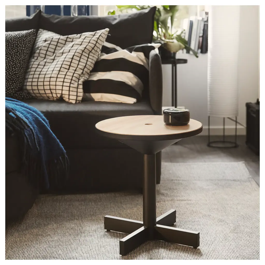 GRIMSARBO Side table - pine plywood/black. Under the table top you can store things you use often like eyeglasses and books, which helps you keep things in order and the table surface clean and tidy. You can easily lift and move the entire table, for example from the sofa to the reading chair.