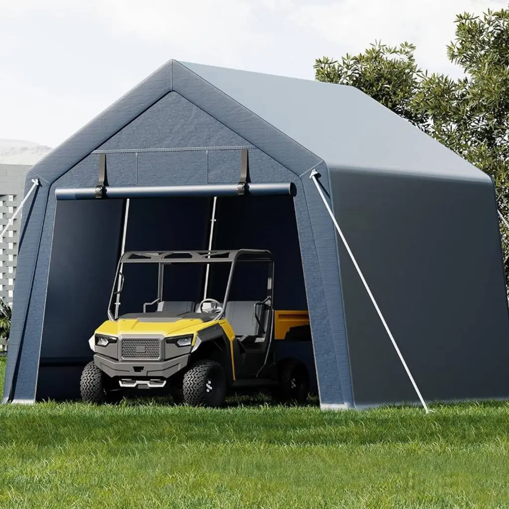 This 13'x25' carport offers spacious storage with removable side walls and doors, allowing versatile use for vehicle shelter or outdoor events, enhanced by roll-up windows and doors for improved ventilation and weather protection. Built with a heavy-duty, rust-resistant steel frame and sturdy legs, it provides durable, all-season shelter designed to withstand various weather conditions.