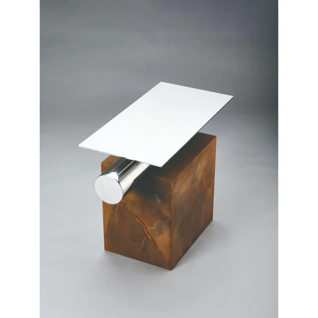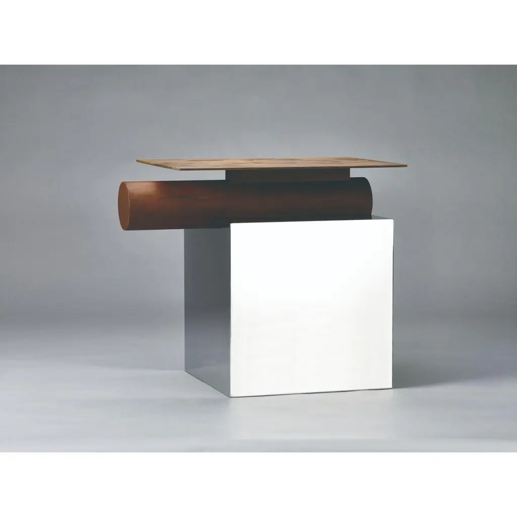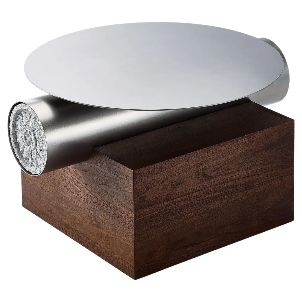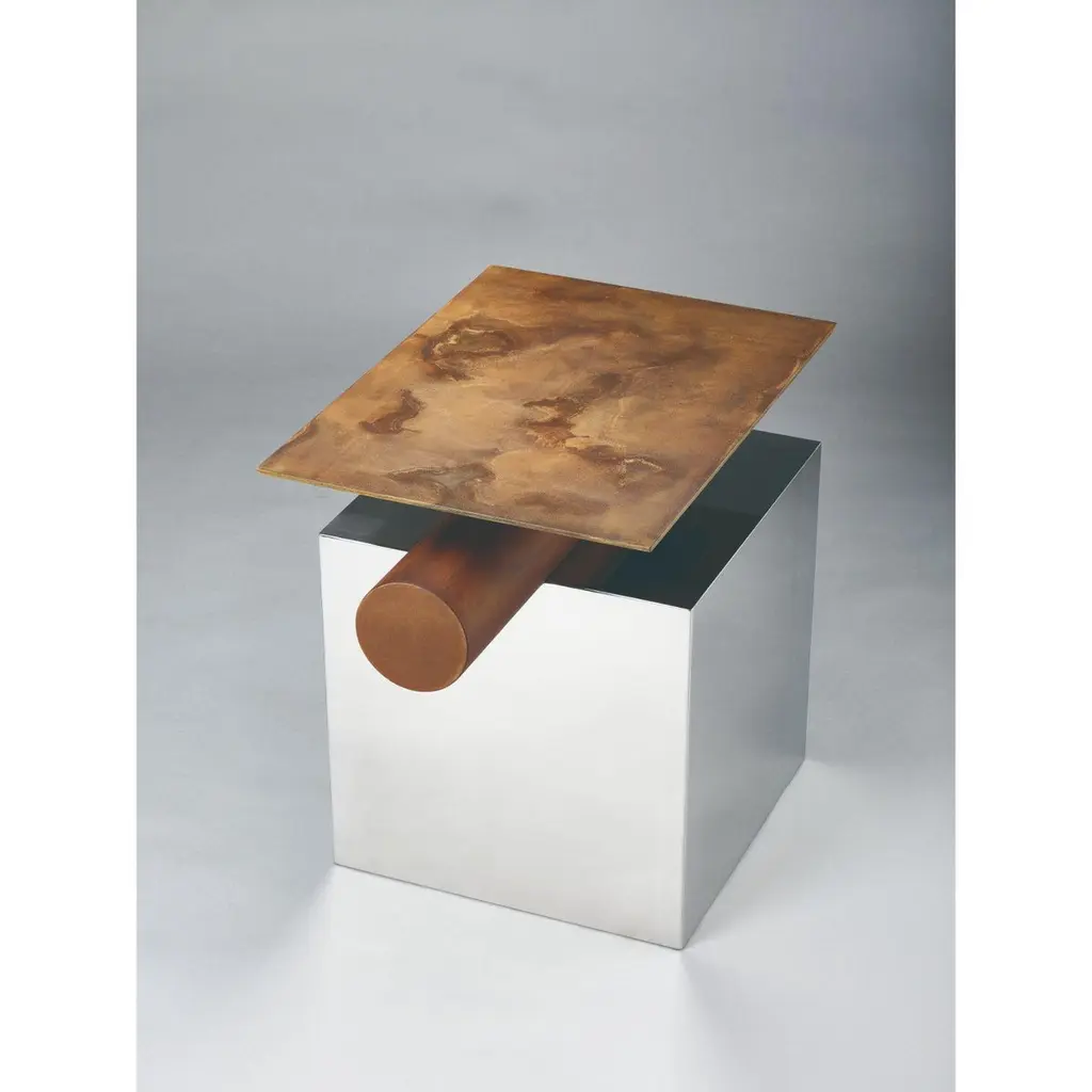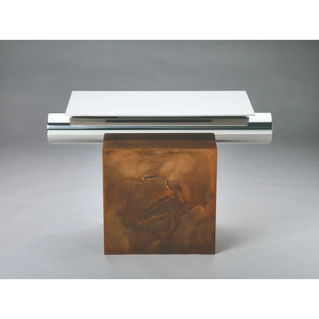 Gwol Side Table by Lee Jung HoonDimensions: D60 x W40 x H52cm Materials: Stainless steel, Iron Corrosion.This work is designed under the theme of coexistence between the past and the future. Time has relativity. The present future and the present become the past someday. Thus, the artist tries to express the past and future by utilizing the properties of the object. Objects have constancy that changes over time. It is an unchanging principle that the metal that used to glow loses its light and rusts over time.Using these attributes, the artist produced works in which the past and future coexist. The past supports the future, and the future supports the past and coexists with each other. In the end, this is all a circular element, which will be the reason why we love both the enterprising beauty of the future and the familiar beauty of the past.Lee Jung-hoon is a Korean craft and furniture designer who essentially draws inspiration from Korean heritage to create contemporary sculptural pieces that embody latent symbolism and double as practically usable objects.Tradition is a gene-like thing, which goes through evolution and degradation with the times. Although it is now a turbulent time in tradition,the unique gemstones inside of it remain unchanged. he wants to discover and explore these stones to find the formation thatencompasses tradition and modern times.He is working on finding new types of furniture and decorations under the theme of Korean tradition, and at the same time wants to designthe furniture that society needs today.