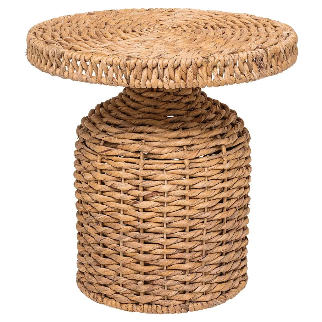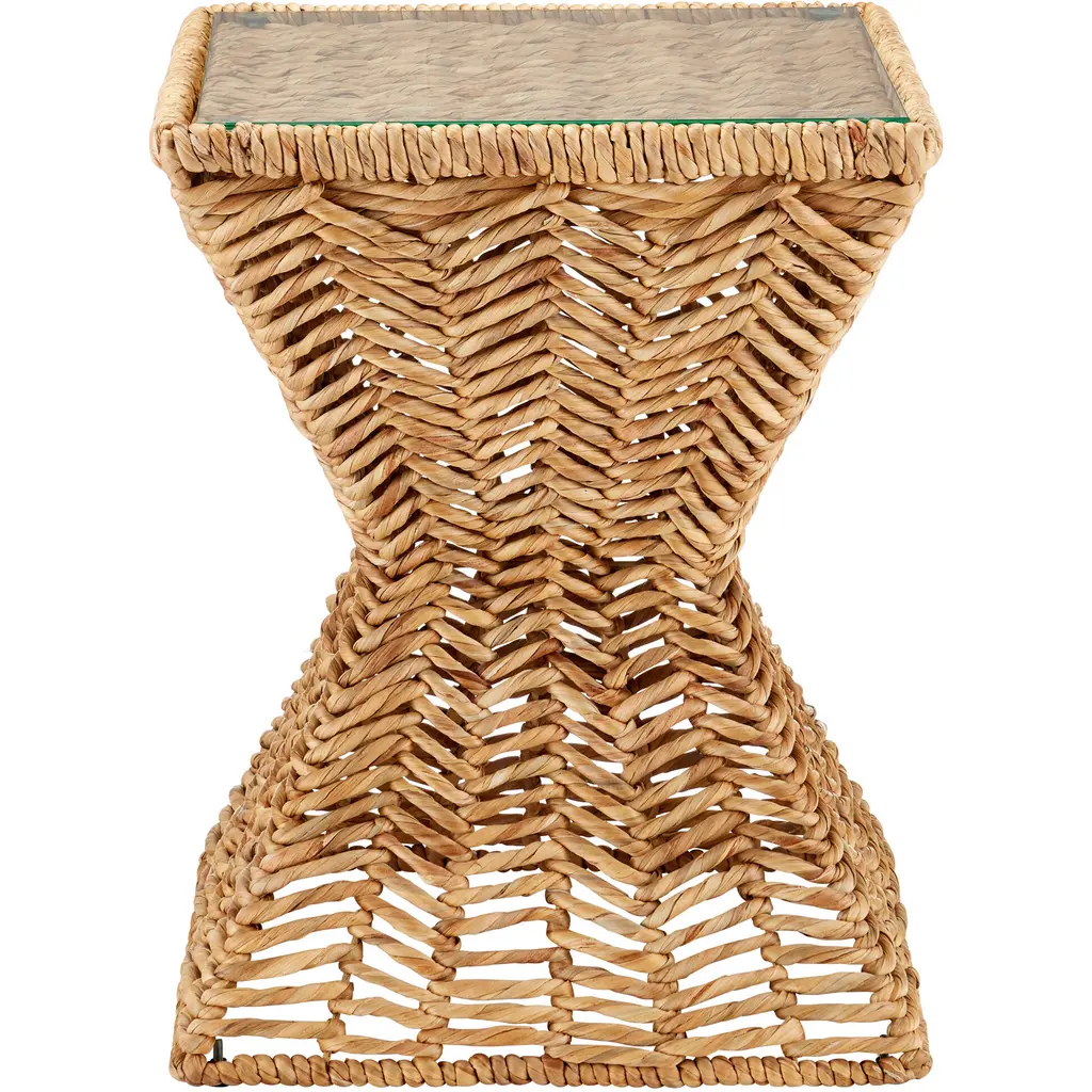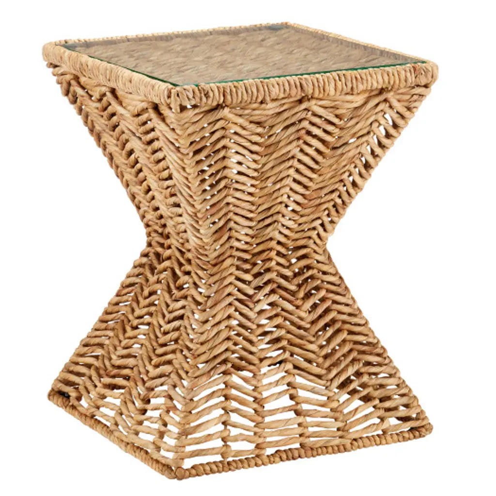 The Hadi Accent Table is a generously sized side table that fits squarely within a natural materials story, with beautiful water hyacinth rope that is wrapped around the metal frame in a sophisticated square hourglass shape. The dexterity required to create such a seamless weave makes this an artisanal creation. The inset top is made of tempered glass.