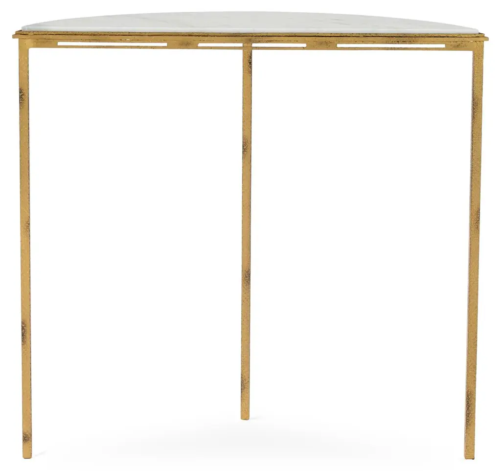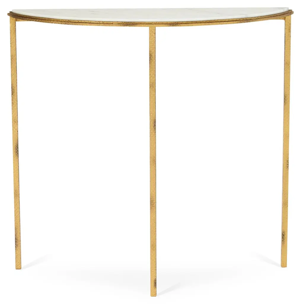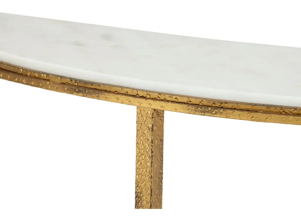 This demilune table appears so light it's almost floating. The gold finish of the hammered iron frame pairs beautifully with white marble top, bringing a sense of refinement and luxury to its surroundings.
