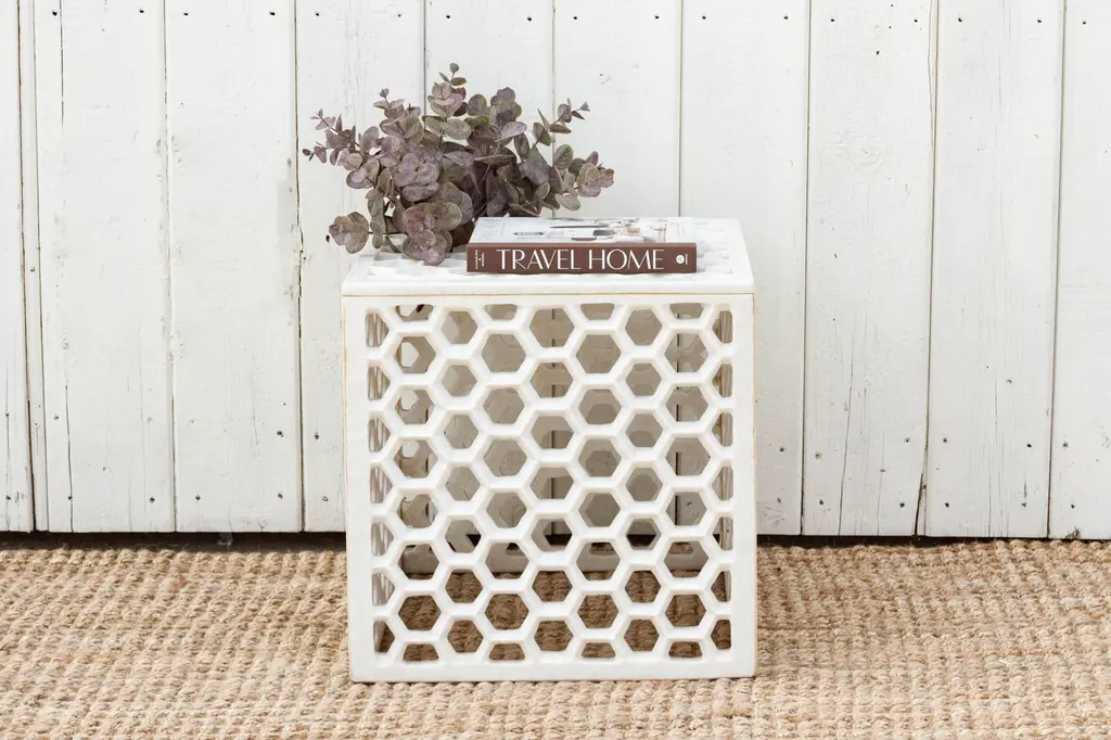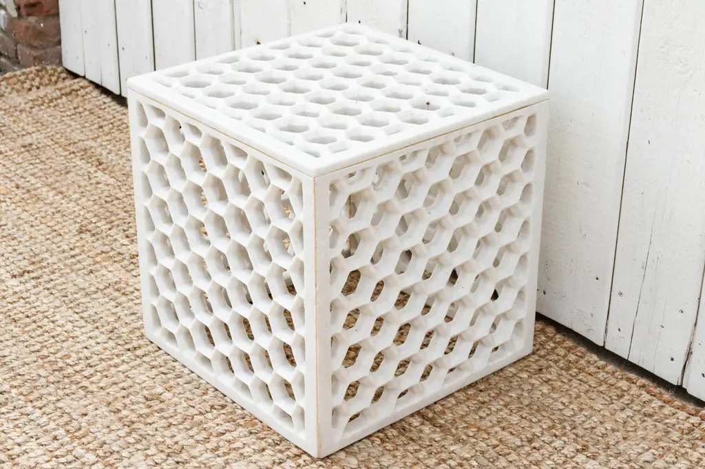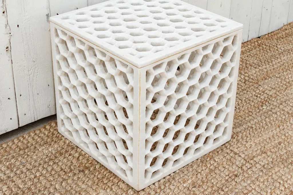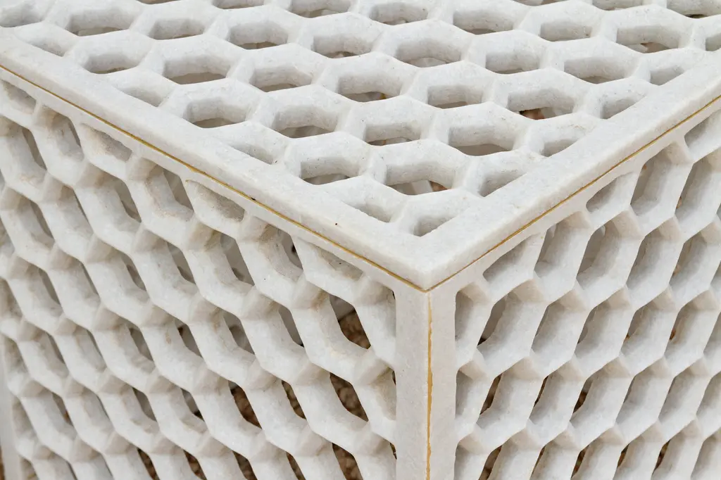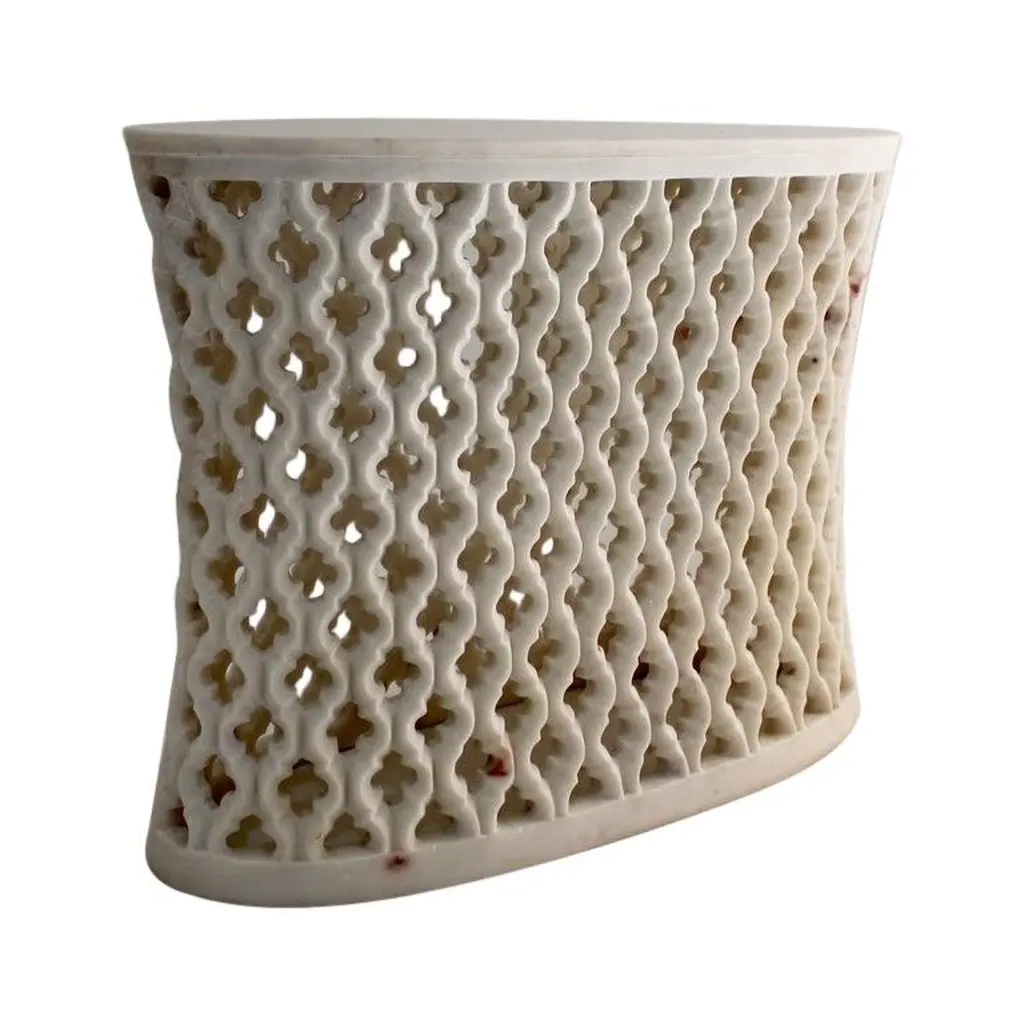 Modern meets Mughal with this captivating marble side table. Handcrafted from pristine marble, this piece draws inspiration from the intricate Jali window designs of 16th-century palaces. The base and top features a mesmerizing beehive geometric pattern, meticulously carved for a touch of timeless elegance.