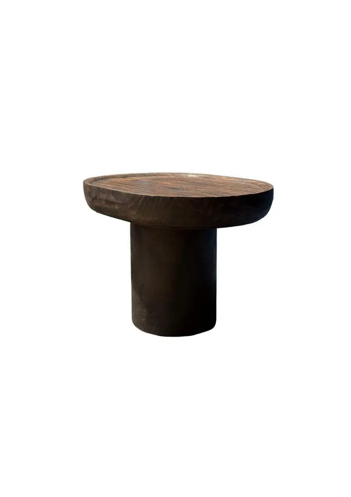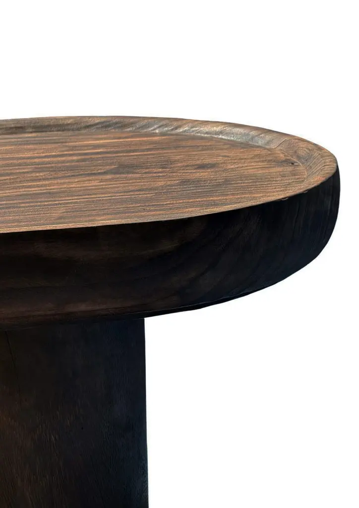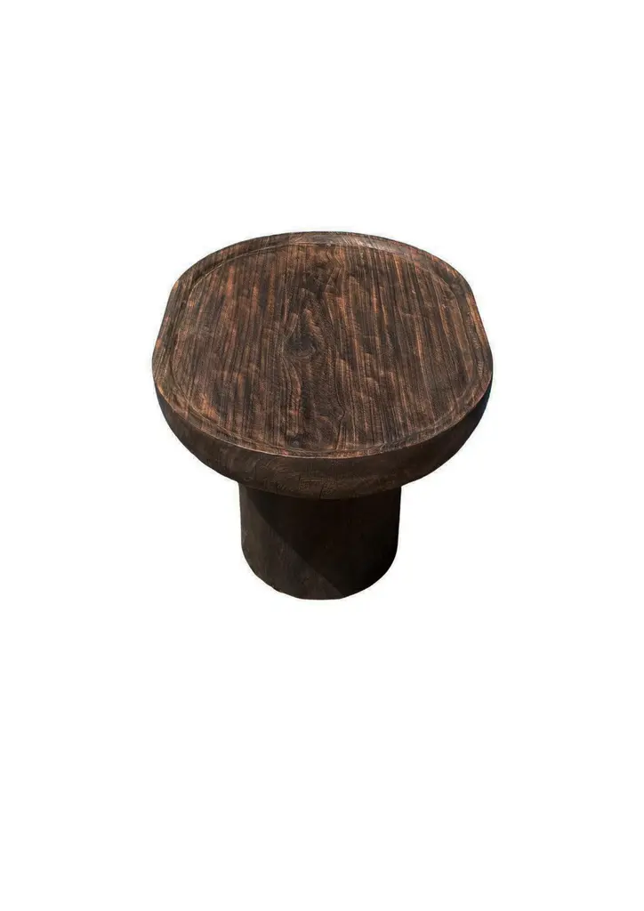 Introducing our exquisite hand-crafted mango wood side table, a perfect blend of elegance and artistry. The rich, warm tones of the mango wood enhance the organic beauty, while its smooth finish showcases the intricate details of the design. Ideal for any living space, this side table adds a touch of natural charm and sophistication, making it not just a functional piece but a statement of style. Whether placed beside a sofa or used as a nightstand, it effortlessly elevates your decor. Embrace the beauty of craftsmanship with this unique table. To achieve its dark brown "espresso" (resemblance to coffee) pigment the wood was burnt several times and finished with a clear coat.
