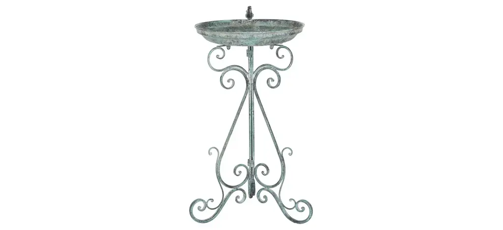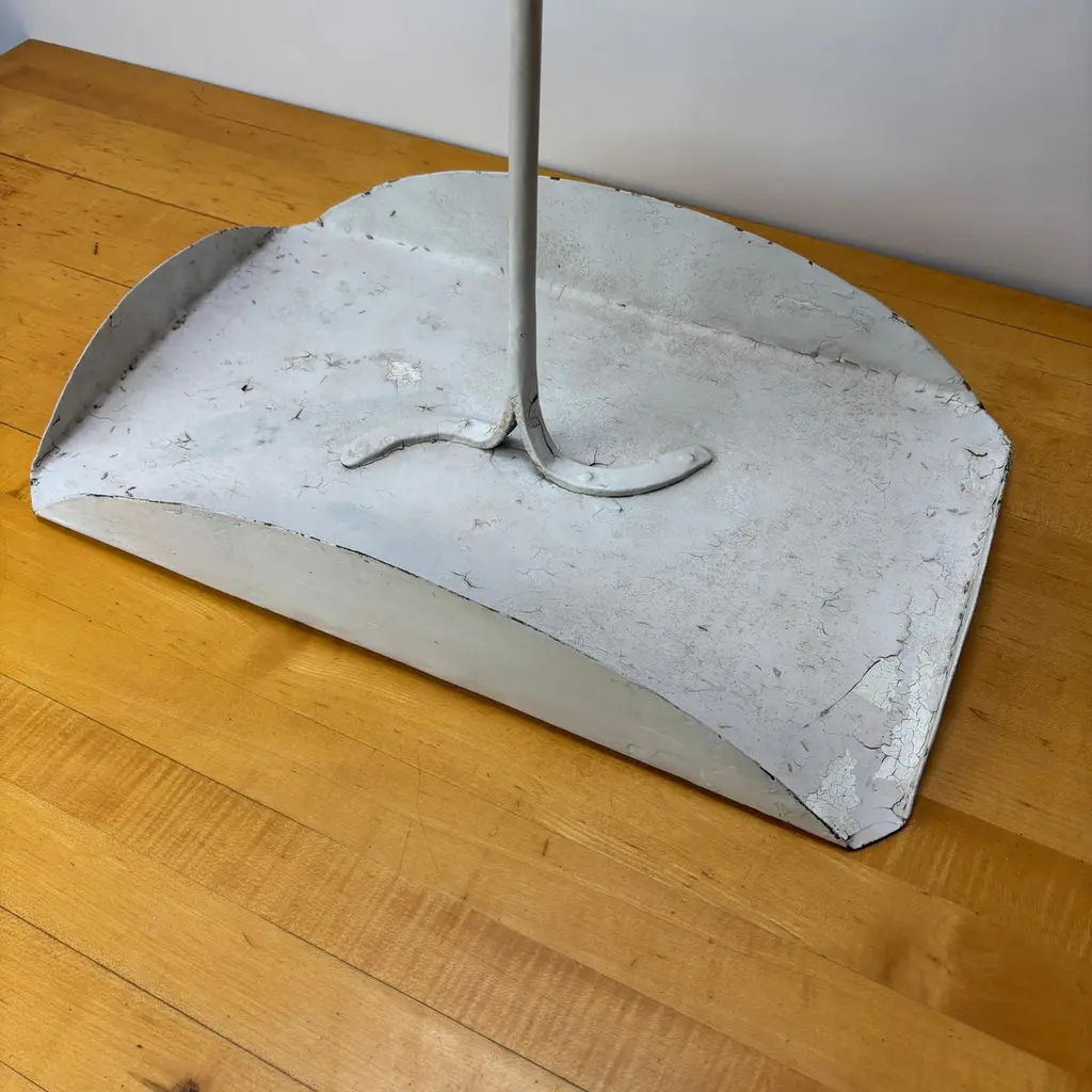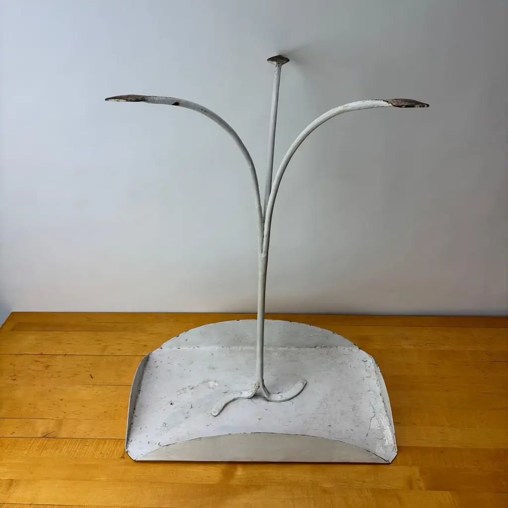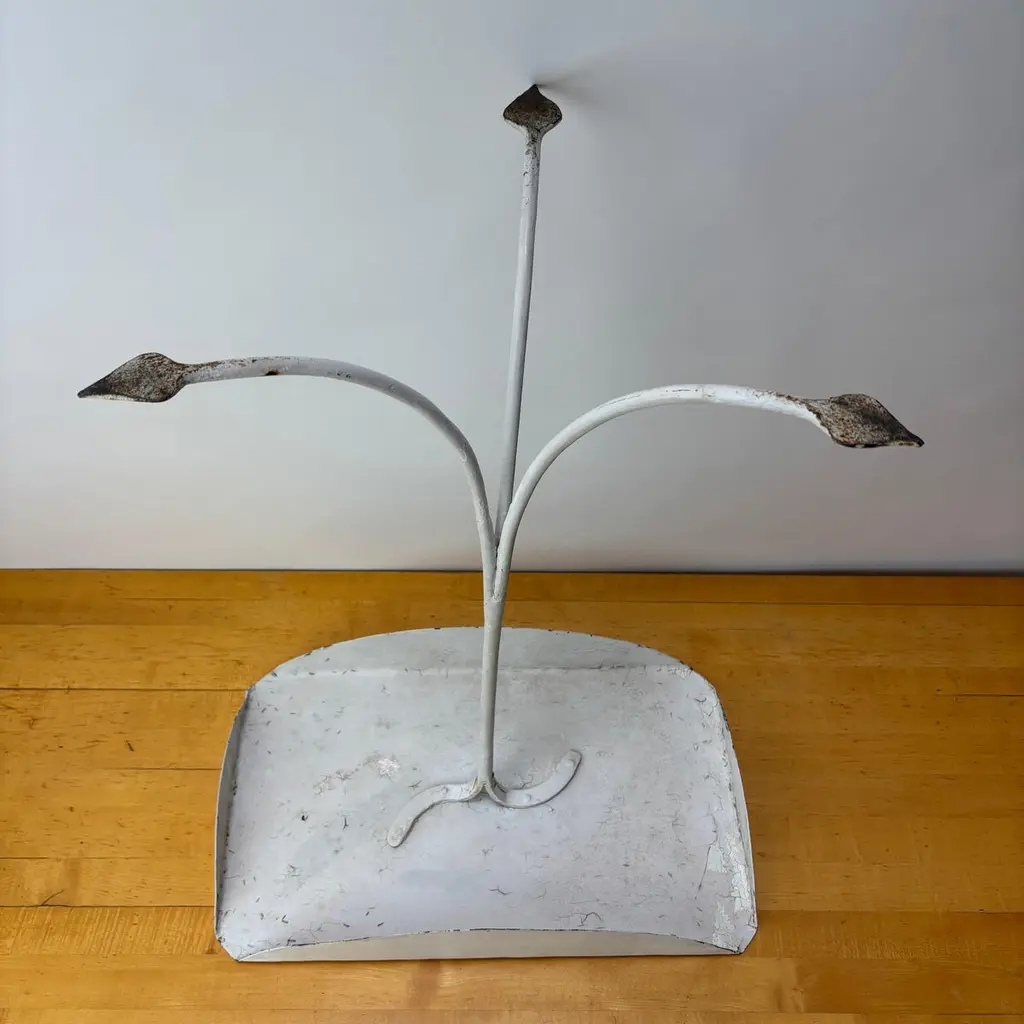 Hand forged garden table trip pod base with faux drape top.Forged details throughout, all feet are hammered into pointed leaf shapes the legs are attached mid height via a hammered weld.Great condition with many layers of white enamel.