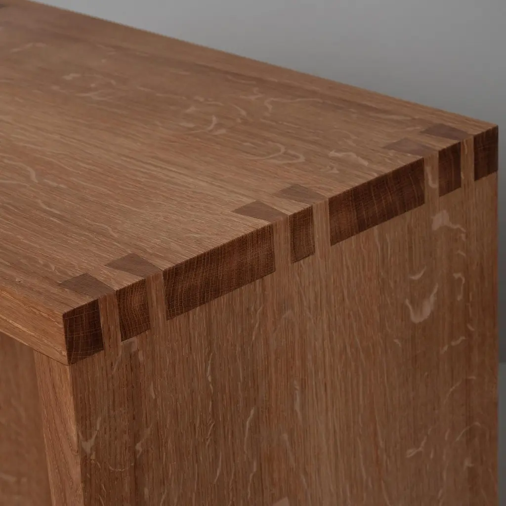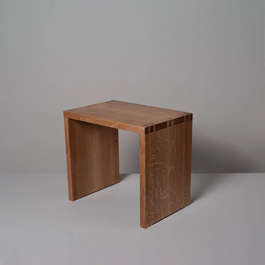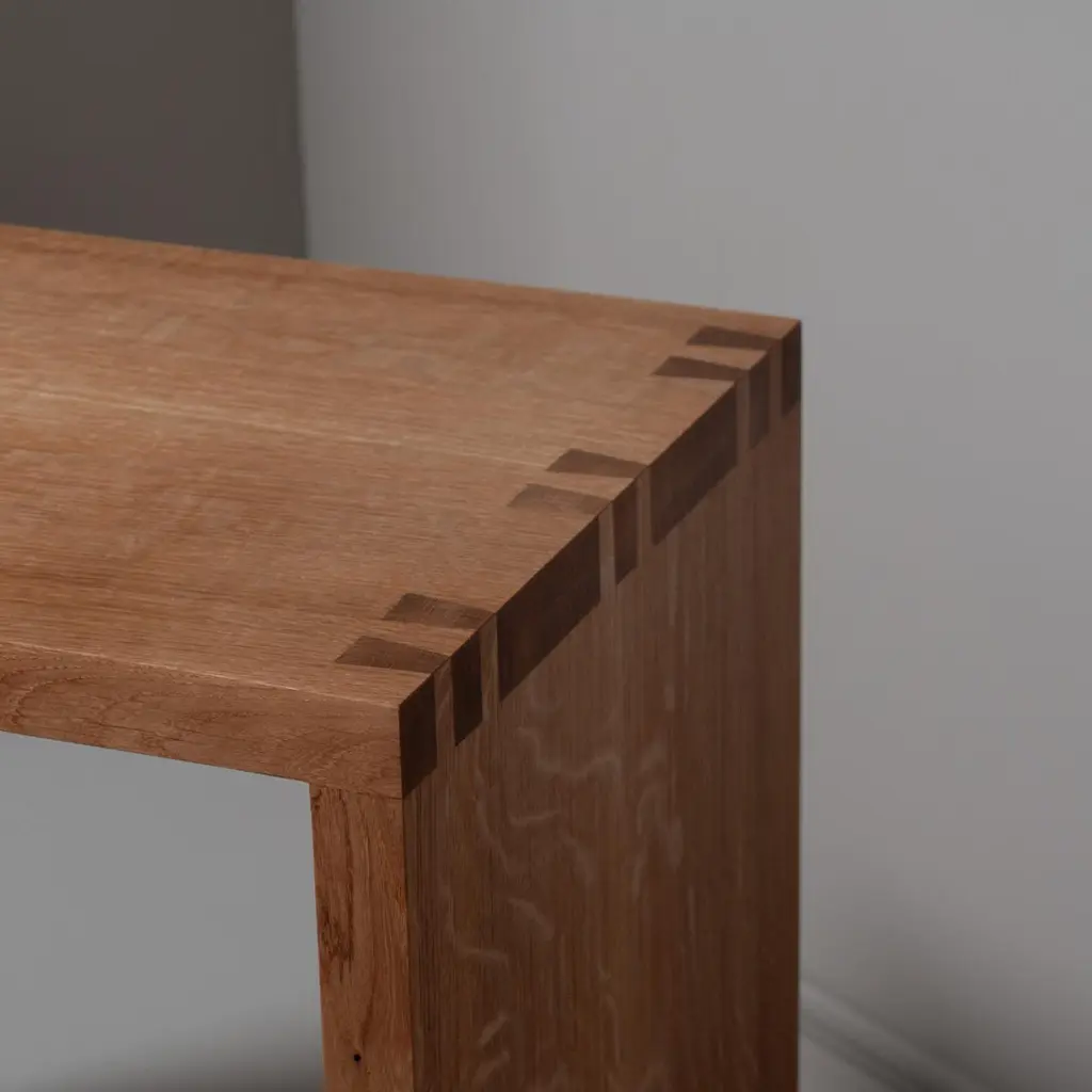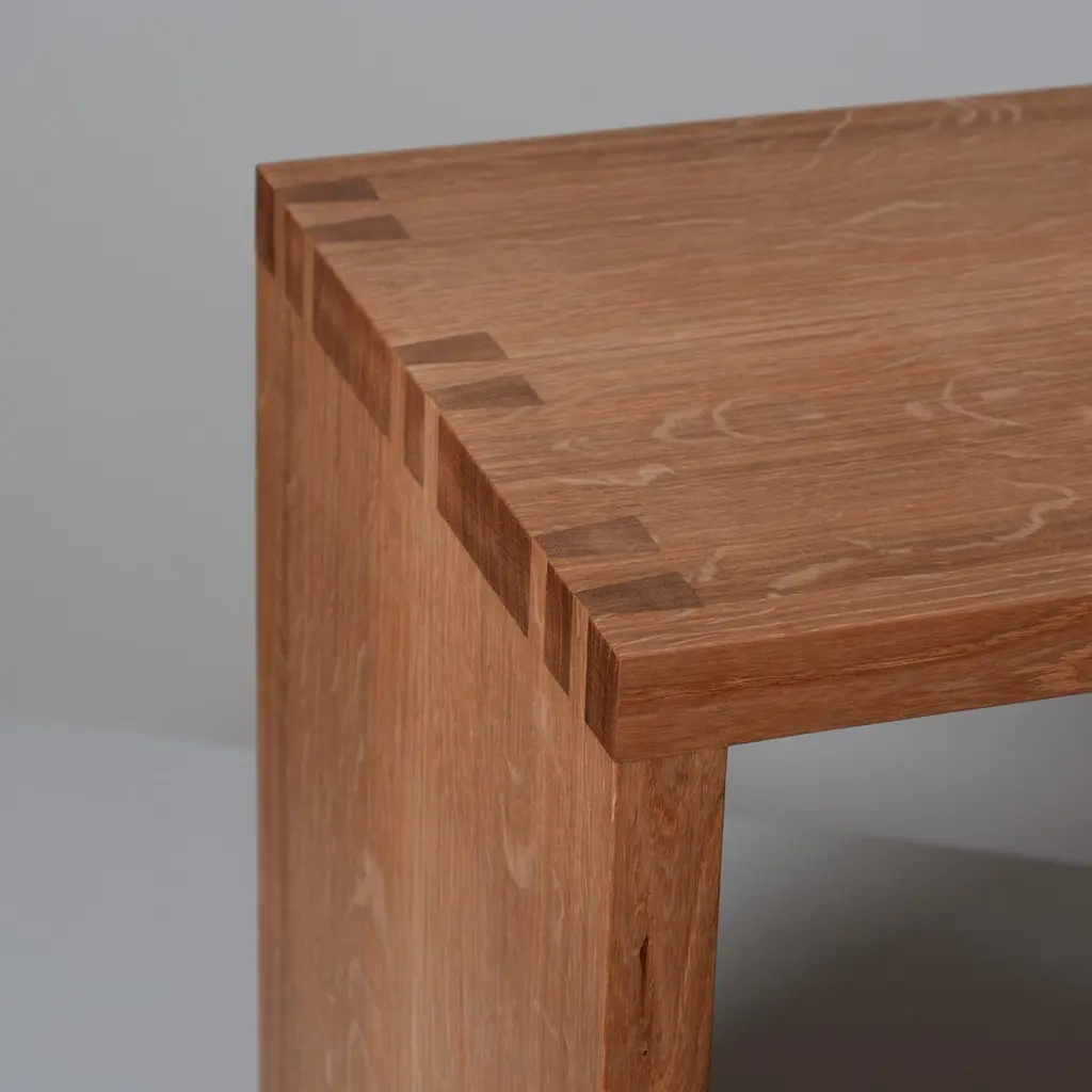 Our new twin dovetail utility night stand table. Designed and handcrafted in England using traditional furniture making techniques. A minimalist multi-function utility piece of furniture transformed with the use of the most beautiful English fully quartersawn oak and bold hand-cut oversized twin dovetail jointing. Finished in highly durable eco oils.A design drawing influences from early japanese minimal modernism.These are unique multi functioning pieces of furniture and are intended for use as side, end tables, night stands or stools. These are substantial and striking pieces of completely handmade furniture, built to last. Custom dimensions are available on request. We design unique and distinctive pieces of furniture – our main objective is combining the design alongside the natural beauty and properties of the raw materials.These timbers and materials are very carefully chosen for each specific design - maintaining our focus on the benefits, visual impact and strengths of what we use. Our regular use of English Quartersawn Oak is one case in point. It has been the beloved timber of fine furniture makers across the world for centuries. It is costly to produce but gives huge benefits and rewards such as its striking medullary rays and superb stability qualities. By utilising these wonderful and naturally occurring features with our contemporary designs we aim to continue creating some very distinct, tactile and idiosyncratic pieces.These are all completely handmade, in very small numbers, by our skilled craftspeople in England.