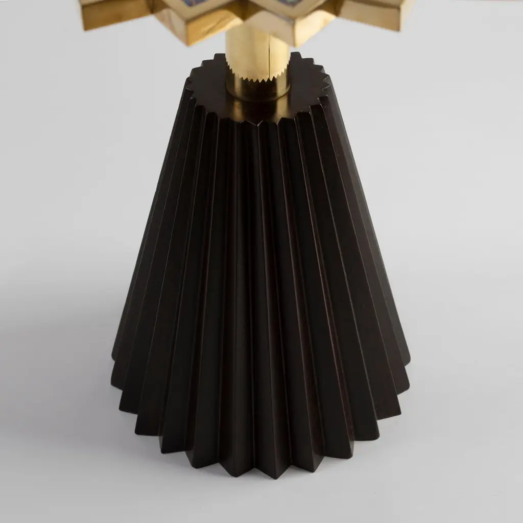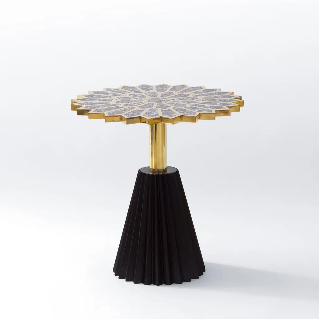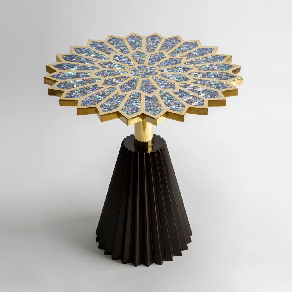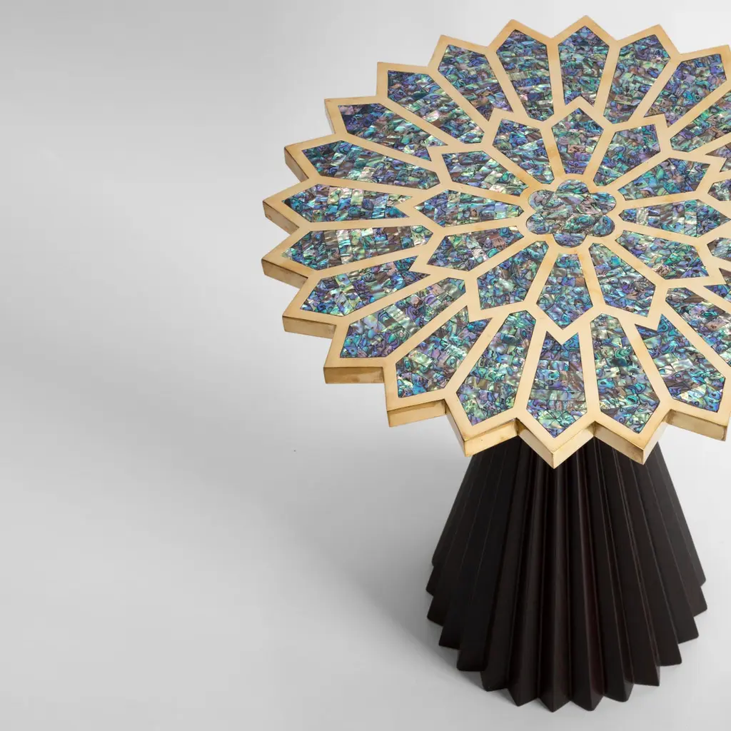 Handcrafted Flower-Shaped Rare Turquoise Mother Of Pearl Accent Table With Brass