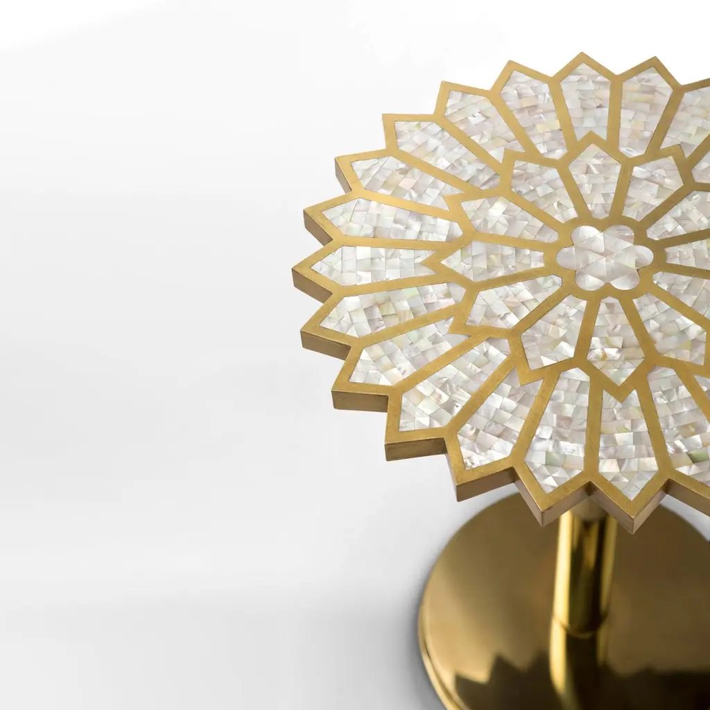 Rare Turquoise Mother of Pearl Accent Table Handcrafted into a Flower Brass Frame. Our Unique Turquoise handcrafted side table will never fail to impress you with its amazingly innovative design! It is made from beautiful rare turquoise mother-of-pearl inlayed within a brass flower design for ultimate creative refinement. If you are looking for an eccentric piece that combines both form and function, this accent table will add a merit of originality to your living area. Also available in original white mother-of-pearl.