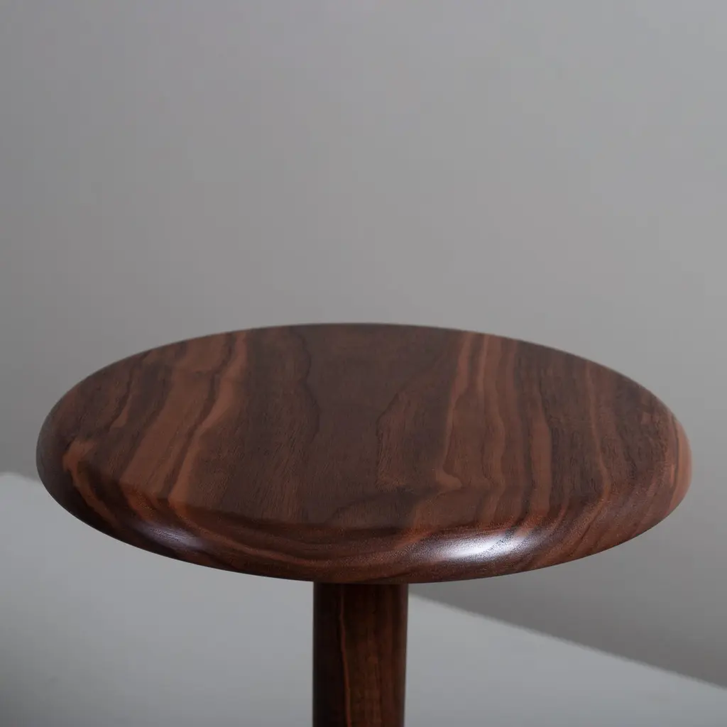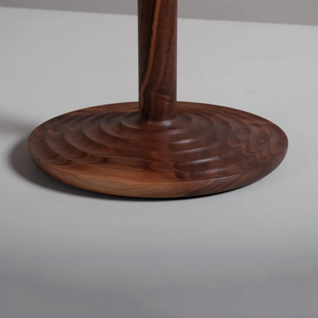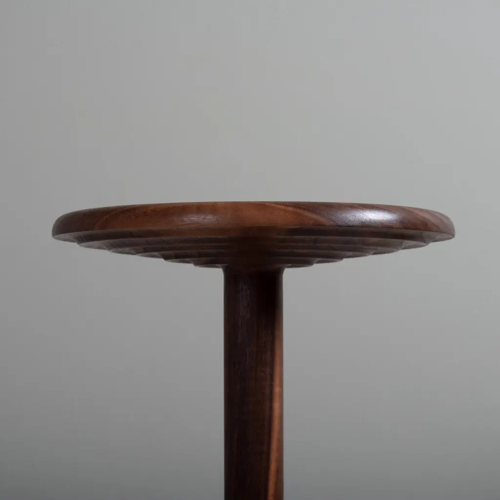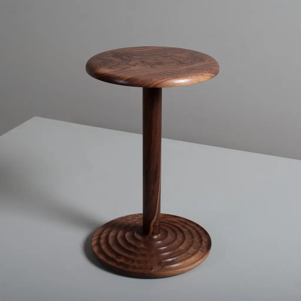 Beautifully turned and completely handcrafted walnut side table in a modernist design. This is a bespoke piece of the finest quality, handmade by our master craftsman in the UK using American black walnut. Rippled turning technique to both base and upper surface underside. Hand finished with very durable natural oils.We design bold and distinctive pieces of furniture – our main objective is combining the design alongside the natural beauty and properties of the raw materials.These timbers and materials are very carefully chosen for each specific design - maintaining our focus on the benefits, visual impact and strengths of what we use. By utilising these wonderful and naturally occurring features with our contemporary designs we aim to continue creating some very distinct, tactile and idiosyncratic pieces.These are all completely handmade, in very small numbers, by our skilled craftspeople in England.