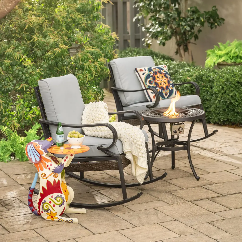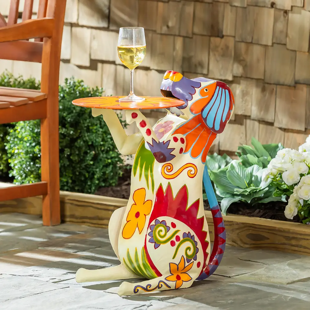 Our Folk Art Dog Table is sure to fetch a lot of attention. The bright, bold colors will grab the eye and man's best friend is your faithful servant.This dog has flat tabletop disc in his mouth (like a Frisbee!) that's ready to hold your drinks, snacks or even a plant. Use indoors or outside as a fun and functional piece that's sure to catch the eye and spark conversation. Made out of recycled metal with a vibrant painted finish, it's perfect for patio, porch, deck or sunroom. Handmade in Bali by local artisans - each is one-of-a-kind. Makes a great gift for dog lovers!