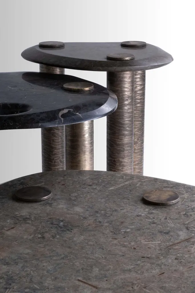 A handmade Hagstone side table in size medium, with textured brass bases & rare British marble stone top. A table collection from NOVOCASTRIAN in collaboration with Britannicus Stone, inspired by the simple perforated pebbles which have enchanted folk for centuries. For those lucky enough to discover one along our shores, these holed stones are said to protect against evil spirits and curses, or to provide insights into hidden realms through divination.Our reinterpretation pairs rare marbles, meticulously sourced from across the British Isles, with NOVOCASTRIAN’s signature sculpted metal finishes. Each stone is skilfully hand-carved to order. Each is truly one-of-a-kind. Each transcends mass production. A preservation of tradition, whilst pushing the boundaries of innovation. An exploration of treasure, British folklore and mysticism. A tangible link to more magical times. This table is made to order and ready to ship within 12 weeks! Please get in touch for details. Price excludes VAT.