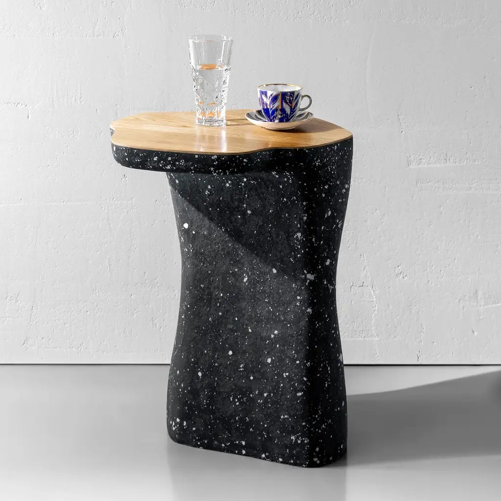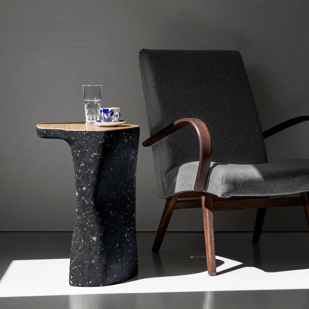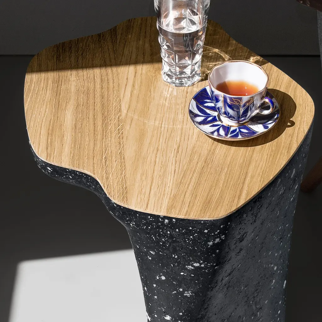 The table features a solid oak top paired with a base made from a custom blend of recycled paper, glue, paint, and filler – creating a sustainable yet visually striking form. Each piece is meticulously shaped by hand, showcasing the contrast between the warmth of wood and the raw texture of the sculptural base. The base mimics the look and feel of concrete while remaining lightweight and durable. The oak tabletop adds a natural touch of elegance, creating a perfect harmony between organic form and modern design. with its compact size and artistic silhouette, this side table is ideal for minimalist, modern, or wabi-sabi inspired interiors. Every piece is unique and one of a kind – made to be a conversation starter. The composite material is moisture-resistant and easy to maintain – dust can be wiped off with a damp cloth. Designed, crafted and built by Donatas Žukauskas MATERIALS: Solid oak (top), mixed material (base) FINISH: Tabletop is finished with a mix of food-safe oils for durability. The base is sealed with a matte varnish. DIMENSIONS: Length: 40 cm / 16” Width: 40 cm / 16” Height: 55 cm / 22” Weight: 11 kg / 24 lbs