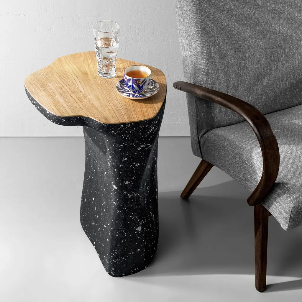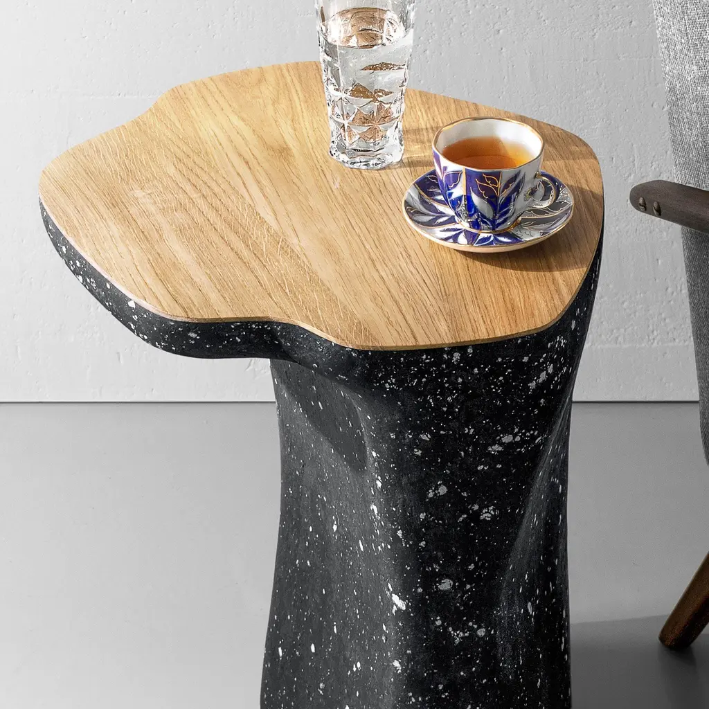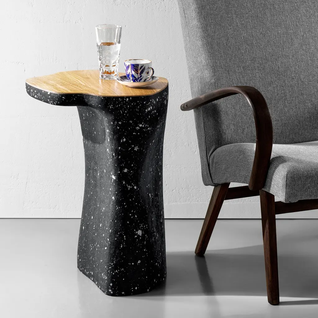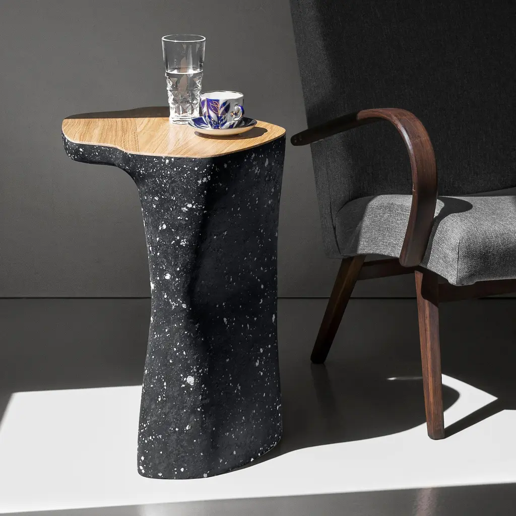 The table features a solid oak top paired with a base made from a custom blend of recycled paper, glue, paint, and filler – creating a sustainable yet visually striking form. Each piece is meticulously shaped by hand, showcasing the contrast between the warmth of wood and the raw texture of the sculptural base. The base mimics the look and feel of concrete while remaining lightweight and durable. The oak tabletop adds a natural touch of elegance, creating a perfect harmony between organic form and modern design. with its compact size and artistic silhouette, this side table is ideal for minimalist, modern, or wabi-sabi inspired interiors. Every piece is unique and one of a kind – made to be a conversation starter. The composite material is moisture-resistant and easy to maintain – dust can be wiped off with a damp cloth. Designed, crafted and built by Donatas Žukauskas MATERIALS: Solid oak (top), mixed material (base) FINISH: Tabletop is finished with a mix of food-safe oils for durability. The base is sealed with a matte varnish. DIMENSIONS: Length: 40 cm / 16” Width: 40 cm / 16” Height: 55 cm / 22” Weight: 11 kg / 24 lbs