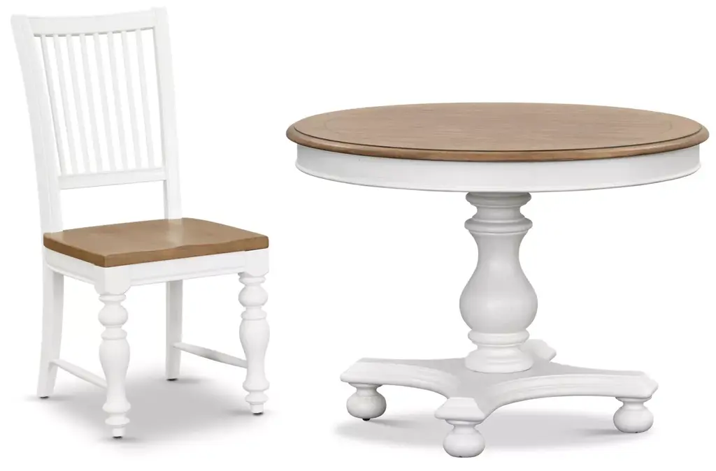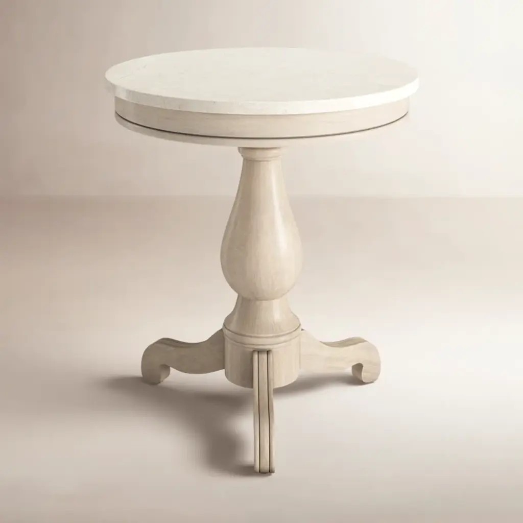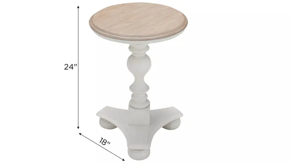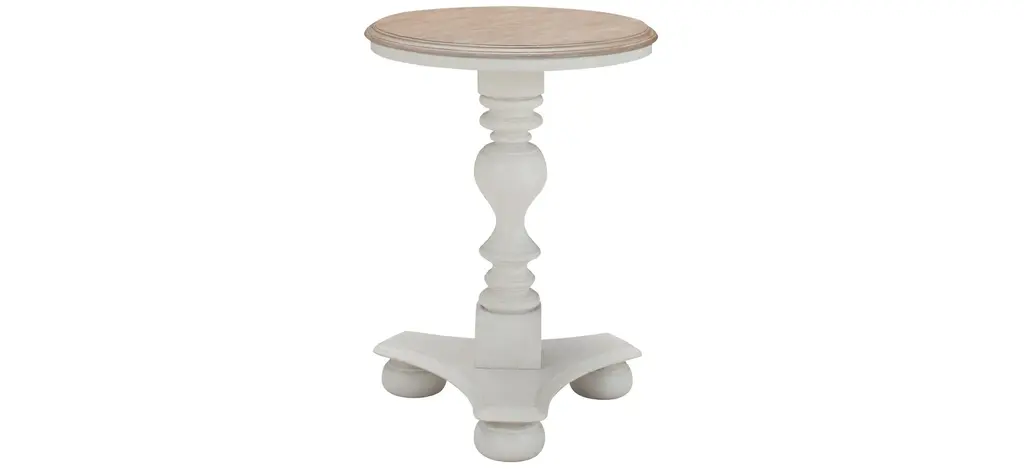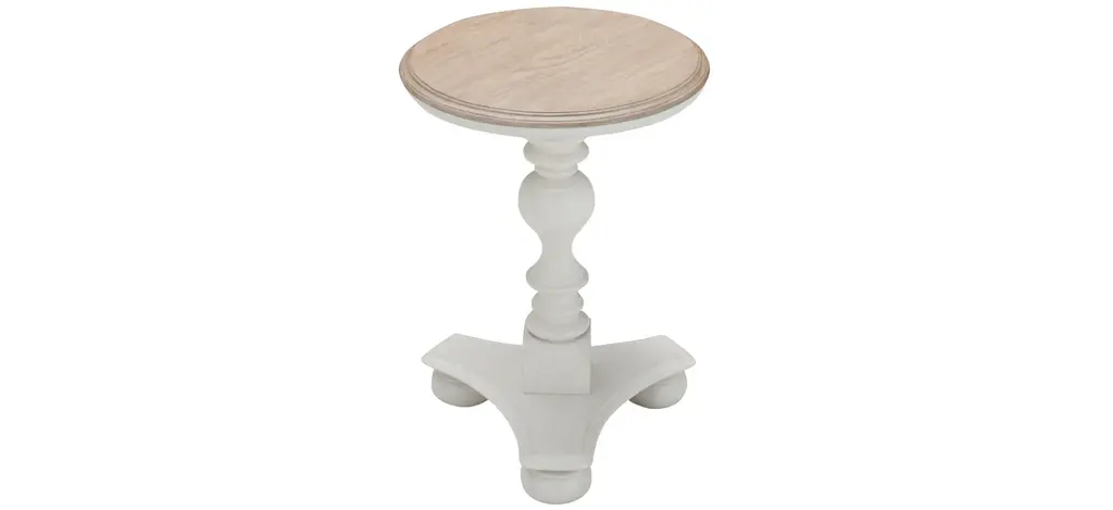 The Harcourt round end table makes itself perfectly at home at the end of a sofa or tucked in the corner as an accent piece with a pleasingly chunky silhouette complemented by a clean white frame and distressed oak top.