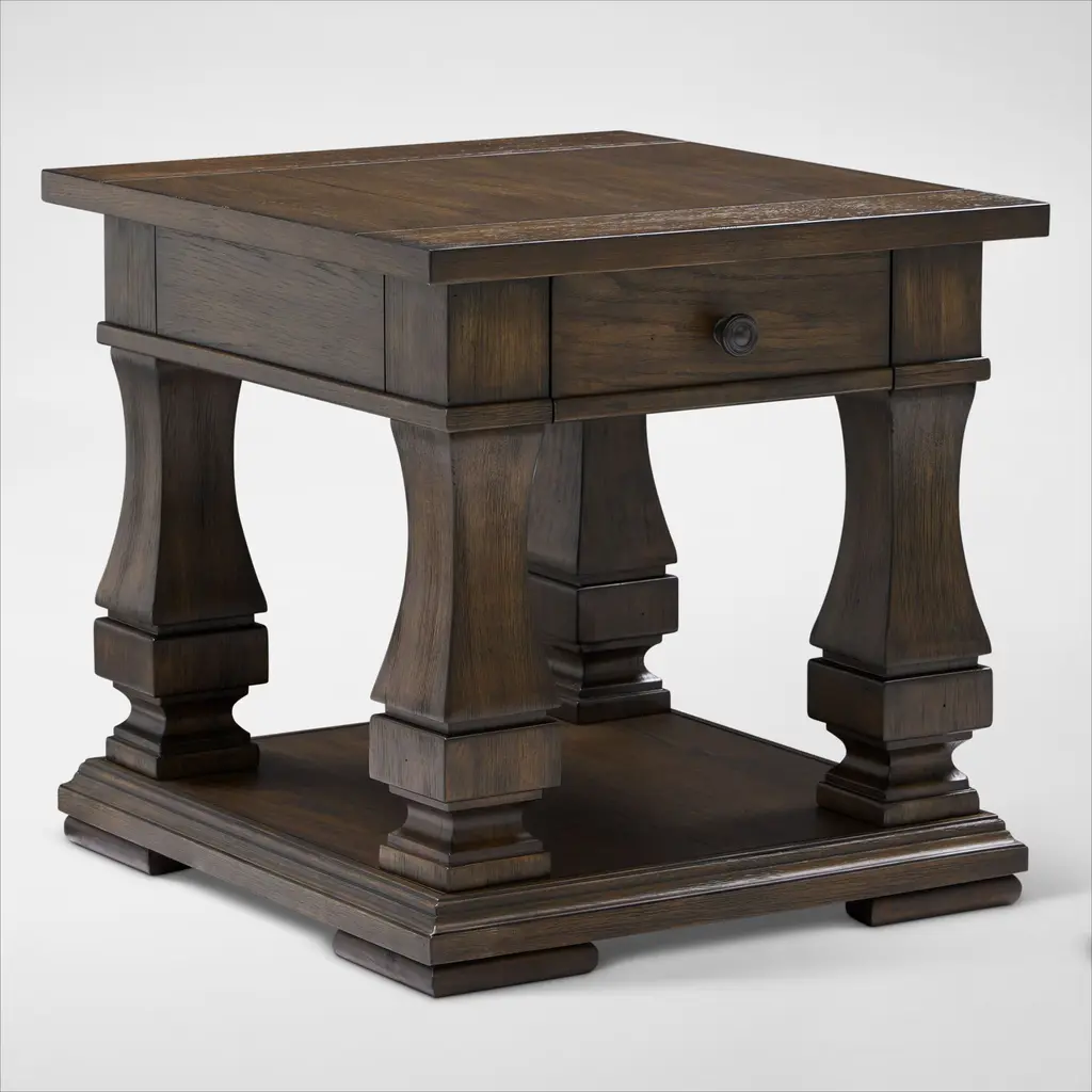 Our Harrington end table features a traditional design that is accentuated by a distressed, dusty taupe finish for an elevated look. One drawer and a fixed shelf provide the perfect storage solution for remotes and magazines.