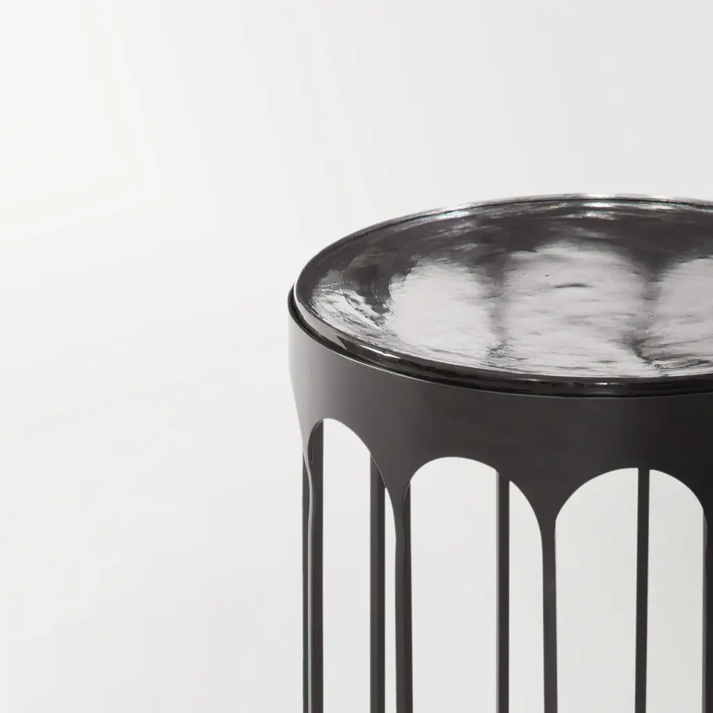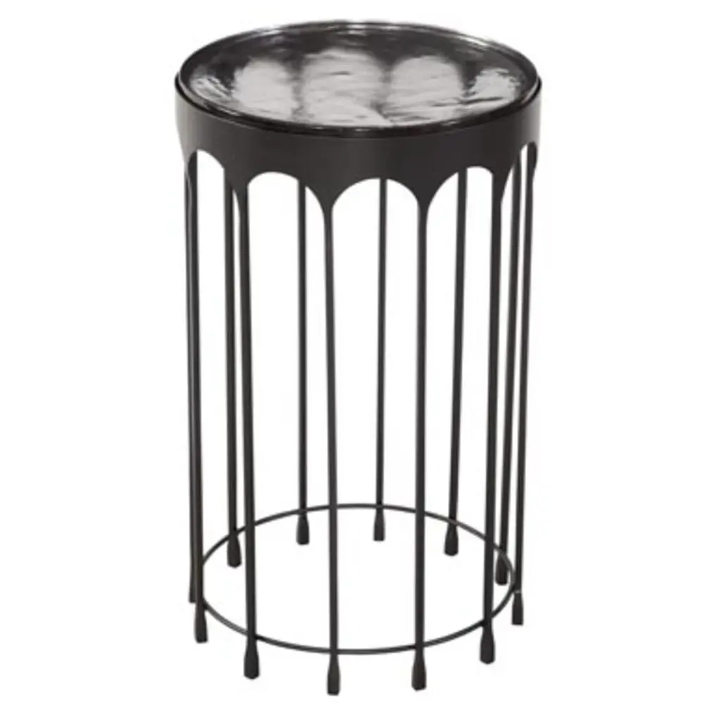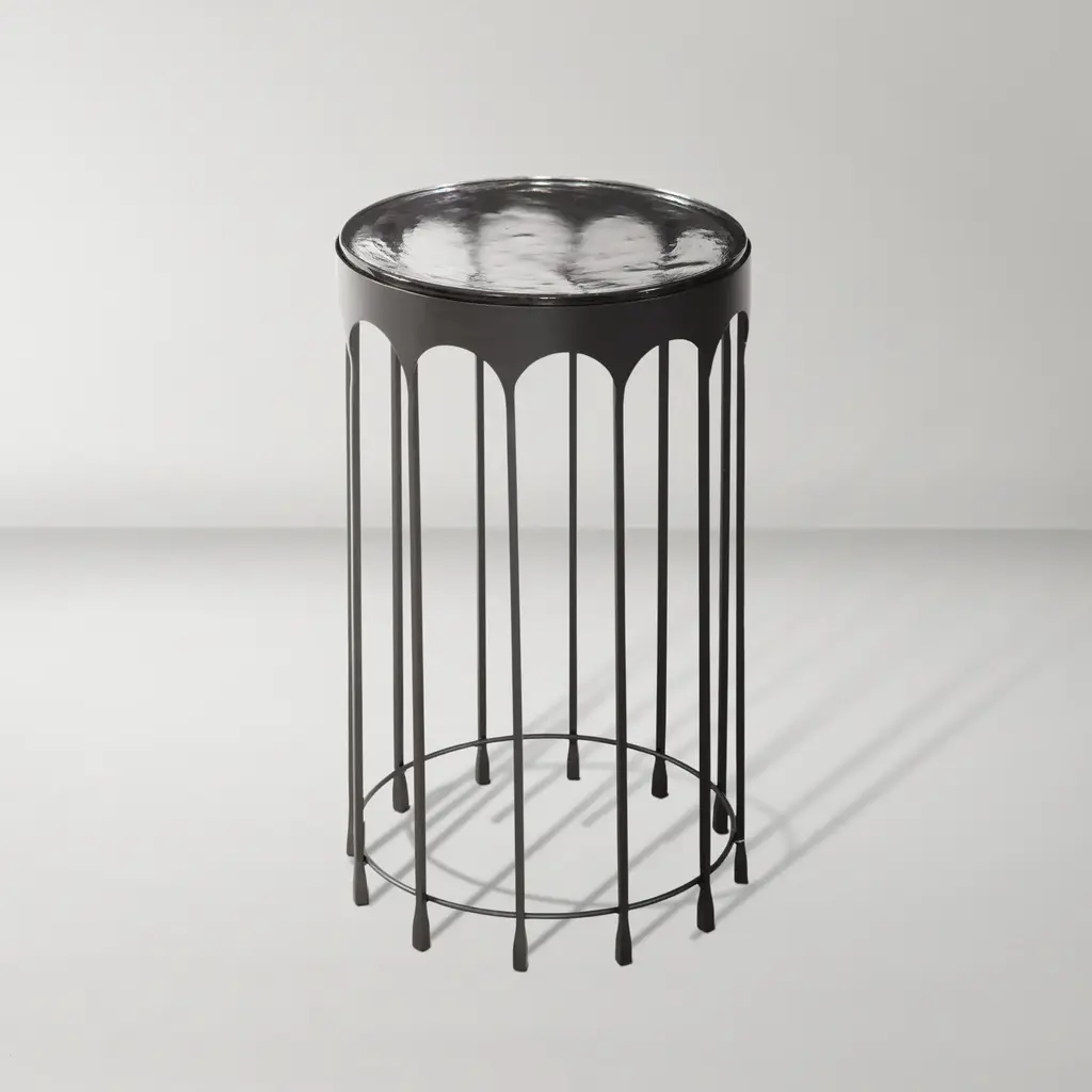 The Hartley Accent Table is a sleek blend of modern design and timeless materials. Its thick, round cast glass top pairs beautifully with the matte black iron base, complete with an elegant arched motif. Ideal for adding depth and function to any room.