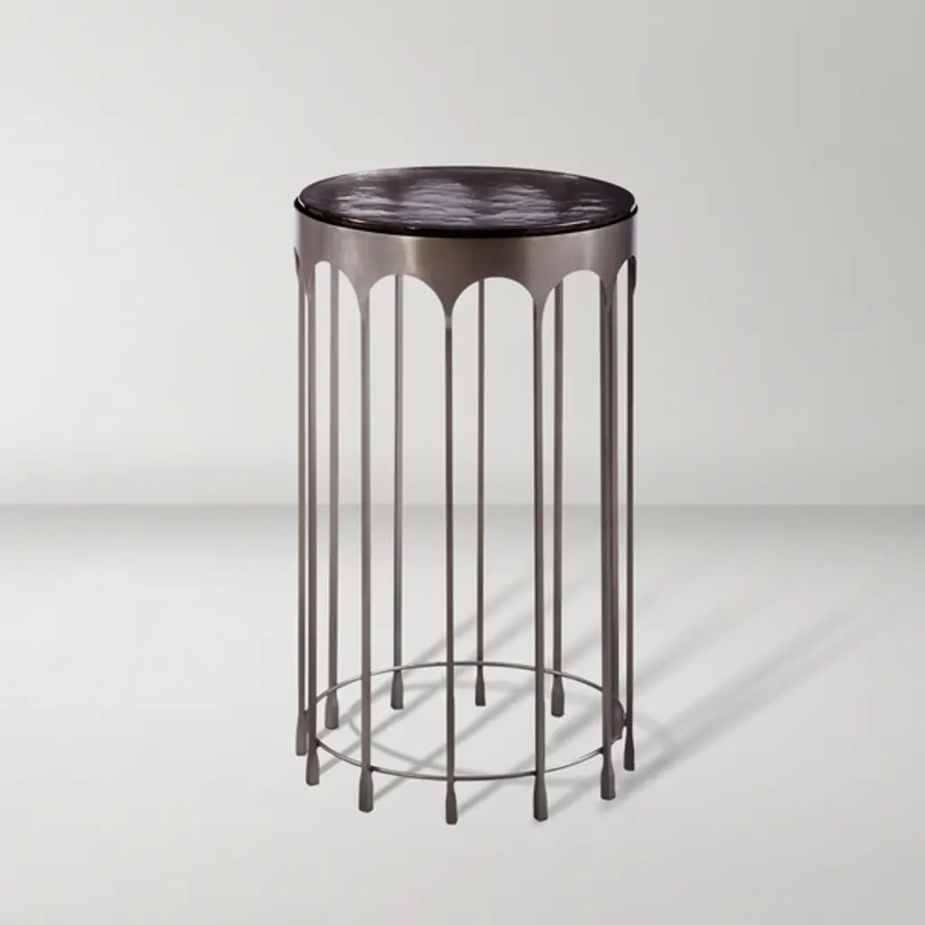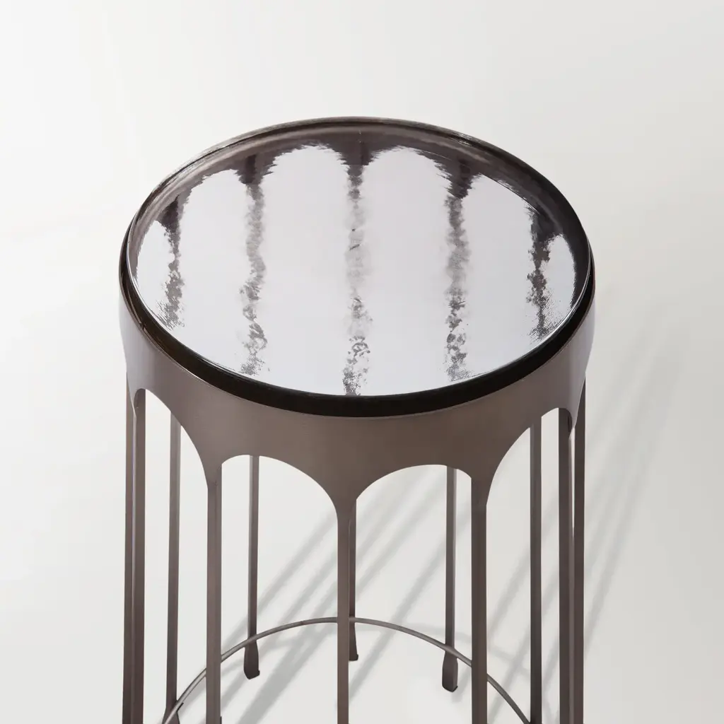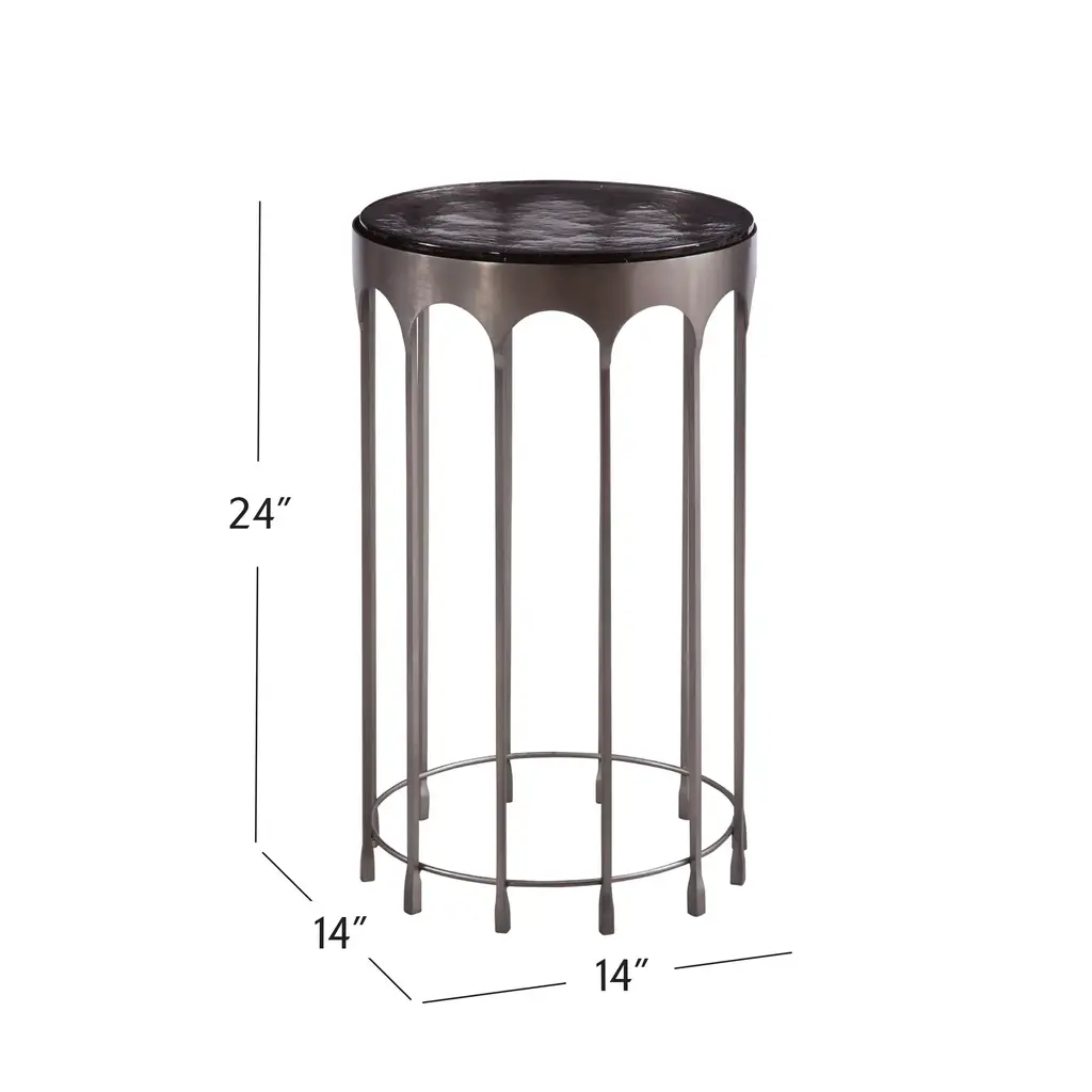 The Hartley Accent Table is a sleek blend of modern design and timeless materials. Its thick, round cast glass top pairs beautifully with the matte black iron base, complete with an elegant arched motif. Ideal for adding depth and function to any room.