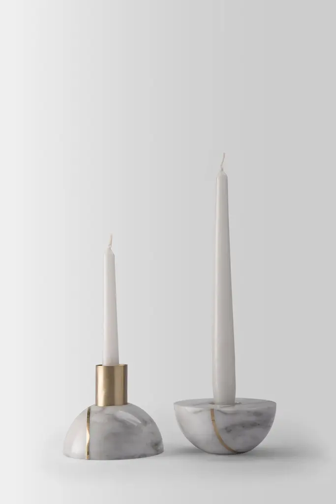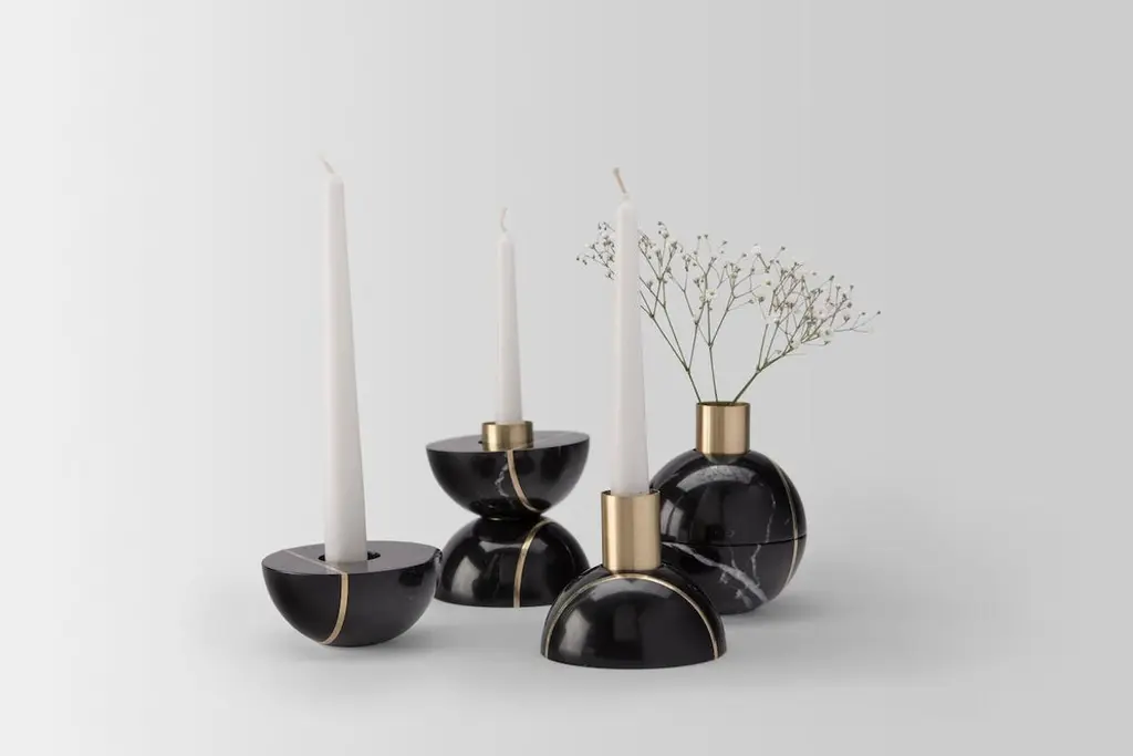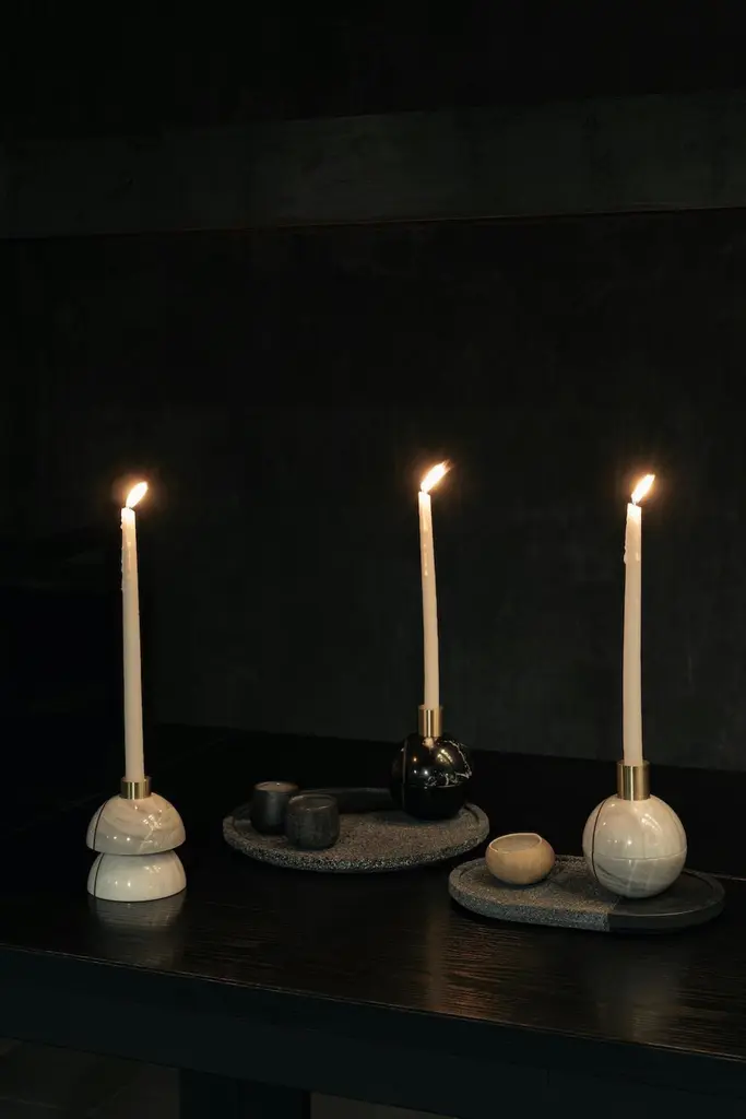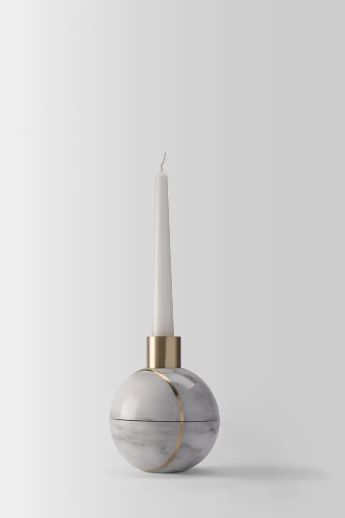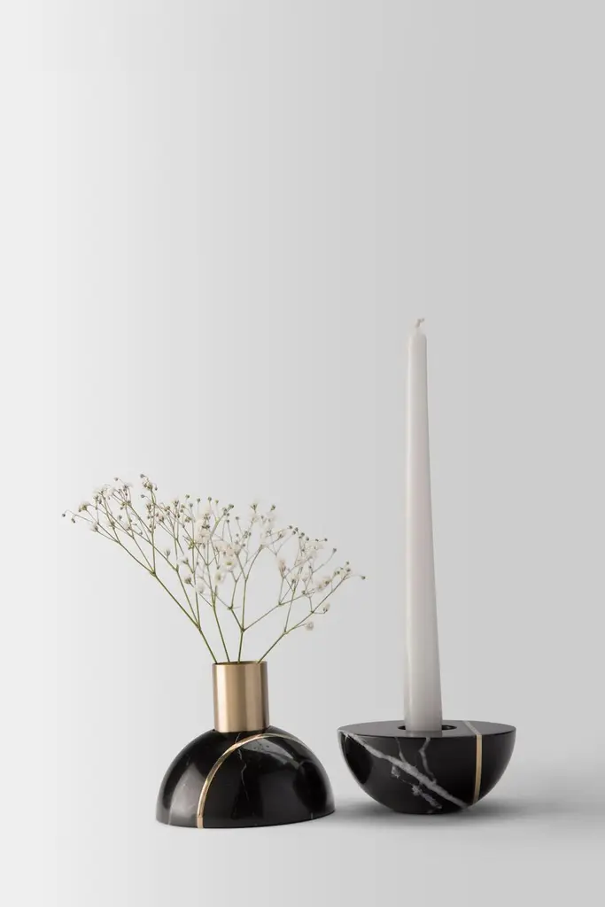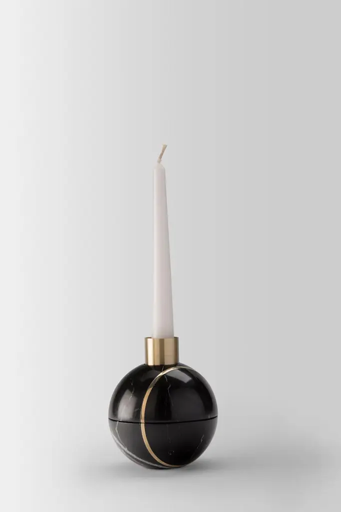 Hauri: In the Huichol Indian tradition, the “candle of life” that lights the luminous sky during the sacred pilgrimage to Wirikuta.A perfect handcrafted marble sphere, apparently a single piece, separates in two to reveal multiple possibilities. Whether as a candleholder, a vase for small flowers or a simple accent piece, Hauri brings its own golden light to a room, with an in-laid brass detail that brings out the rare, unrepeatable patterns of the marble. Hauri is available in black or white and includes a brass insert ring.Material: Black or White Marble and Brass.Measurements: 10 cm x 10 cm x 12 cm.