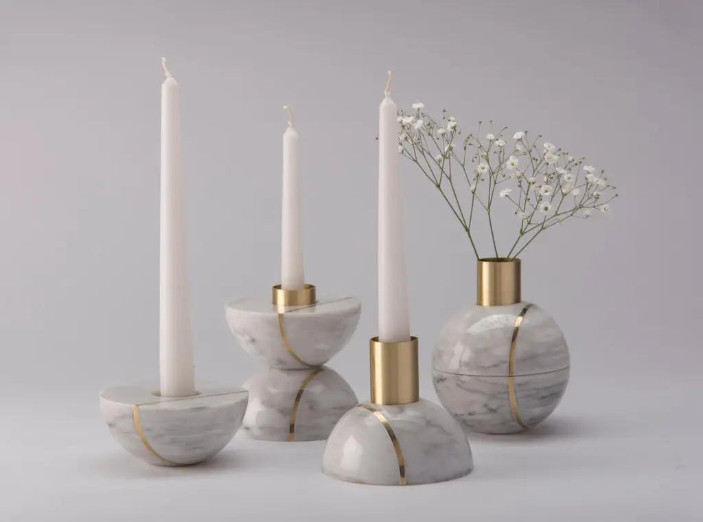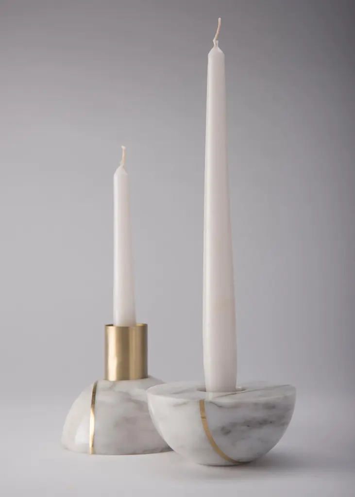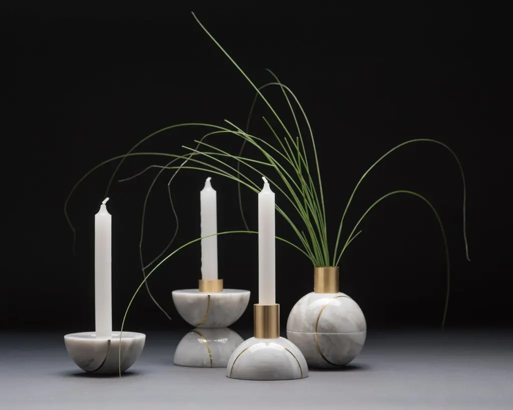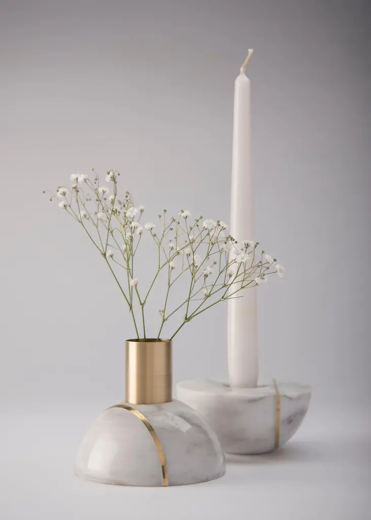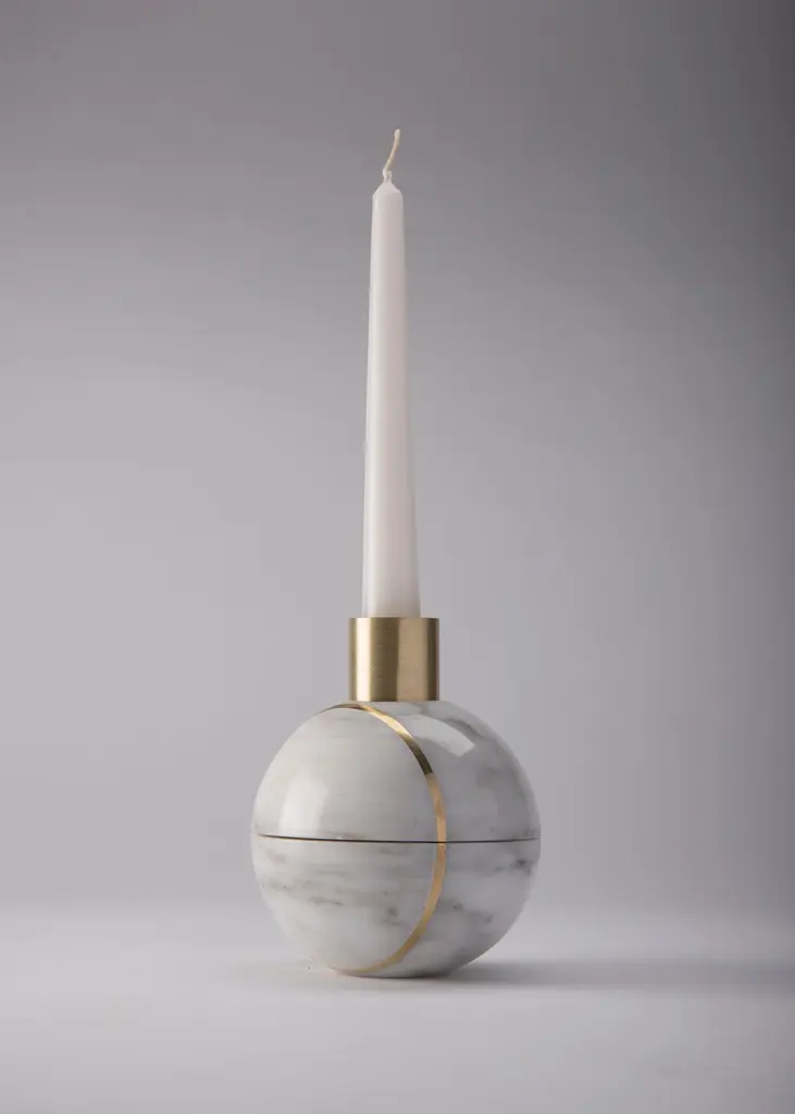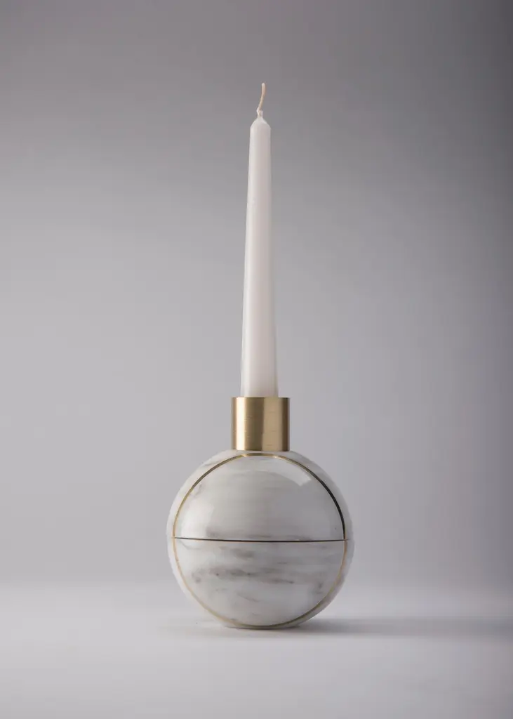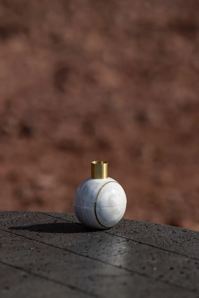 Hauri: In the Huichol Indian tradition, the “candle of life” that lights the luminous sky during the sacred pilgrimage to Wirikuta.A perfect handcrafted marble sphere, apparently a single piece, separates in two to reveal multiple possibilities. Whether as a candleholder, a vase for small flowers or a simple accent piece, Hauri brings its own golden light to a room, with an in-laid brass detail that brings out the rare, unrepeatable patterns of the marble. Hauri is available in black or white and includes a brass insert ring.Material: Black or White Marble and Brass.Measurements: 10 cm x 10 cm x 12 cm.