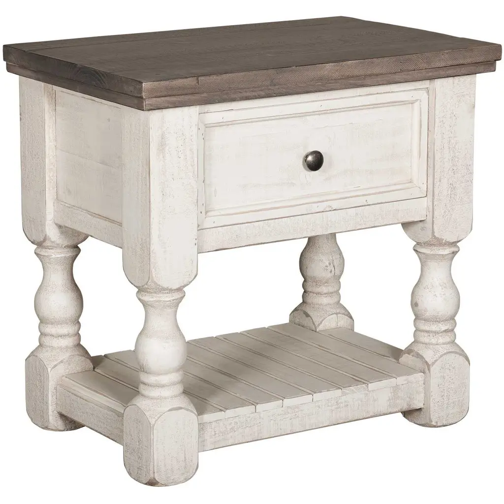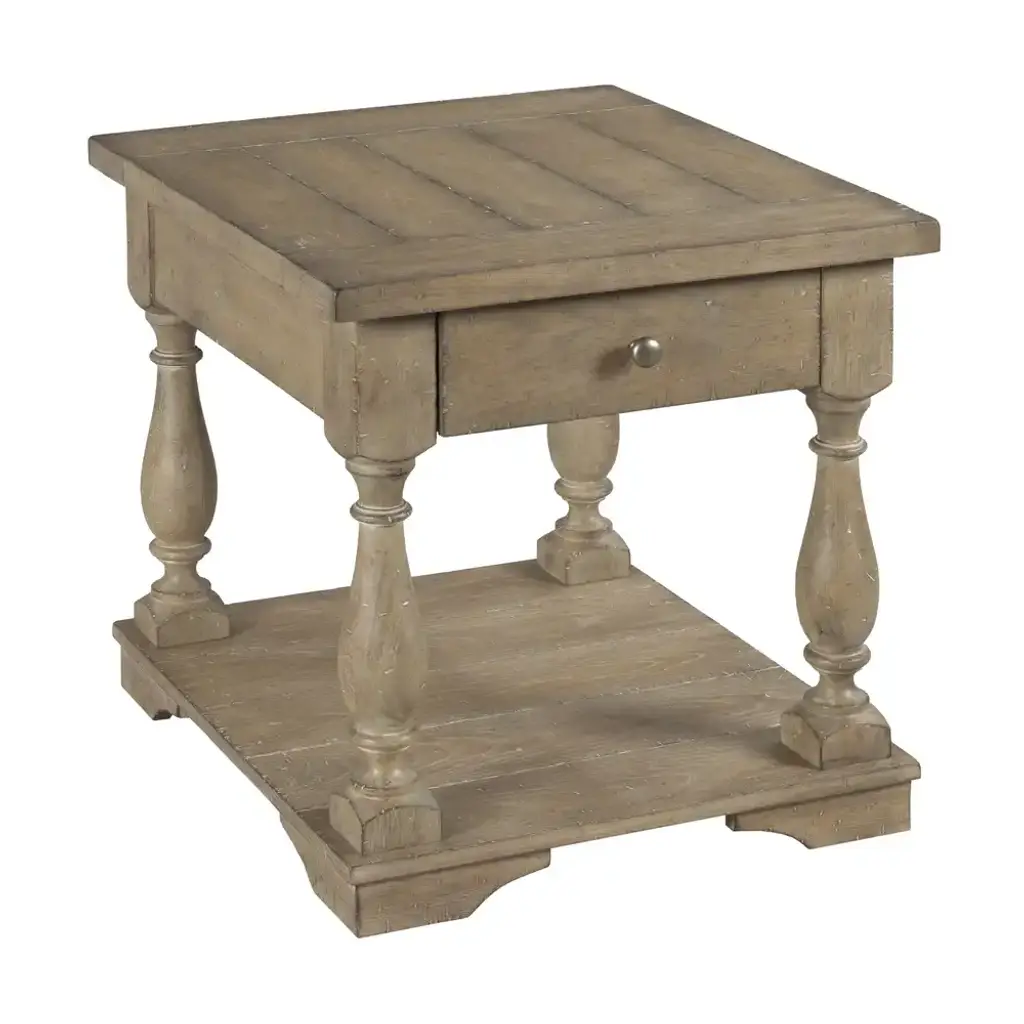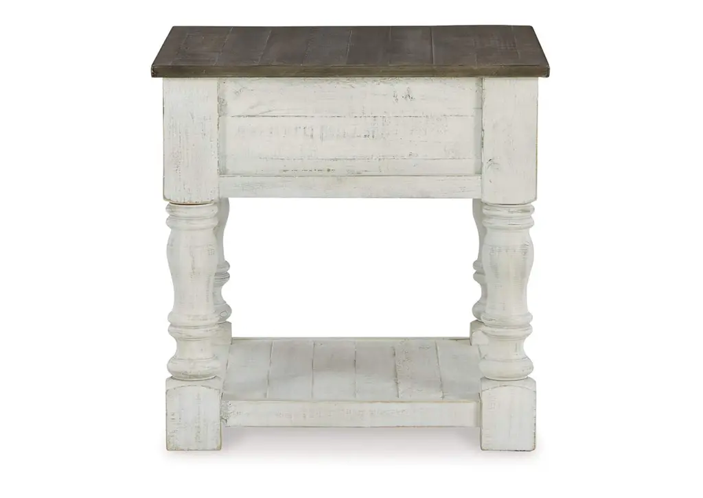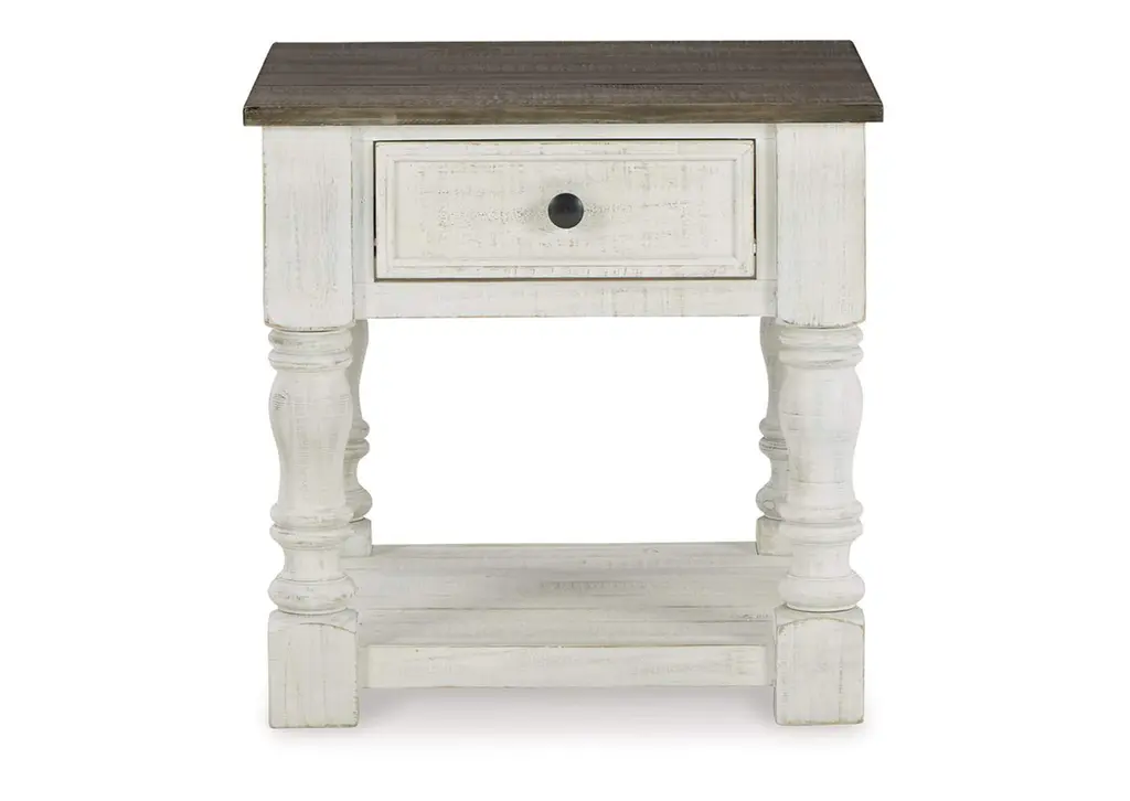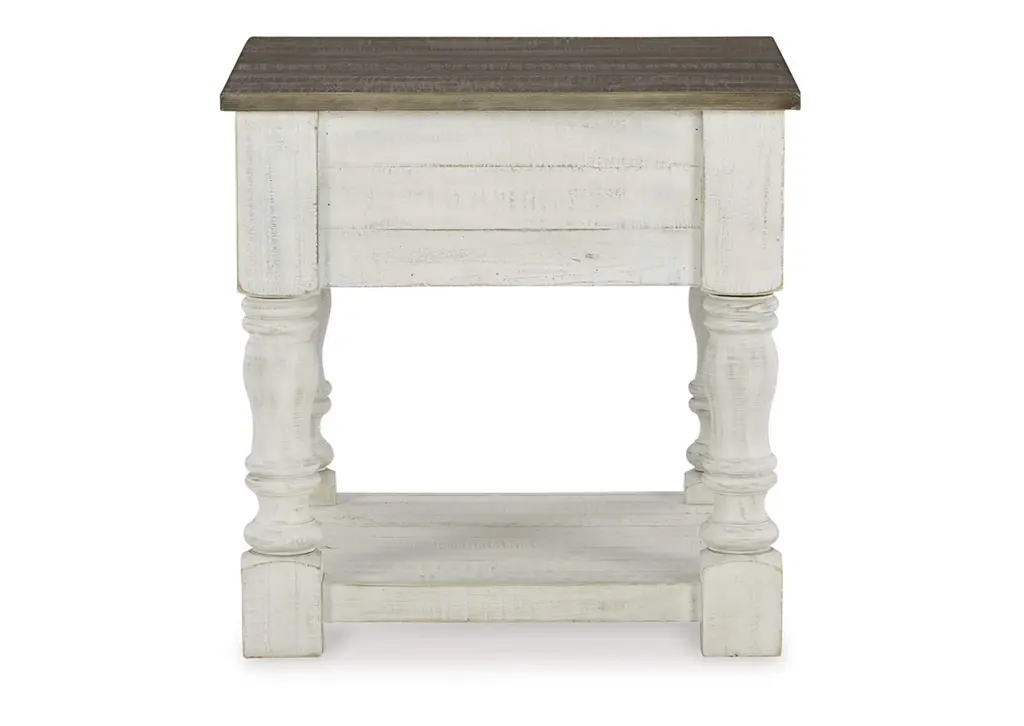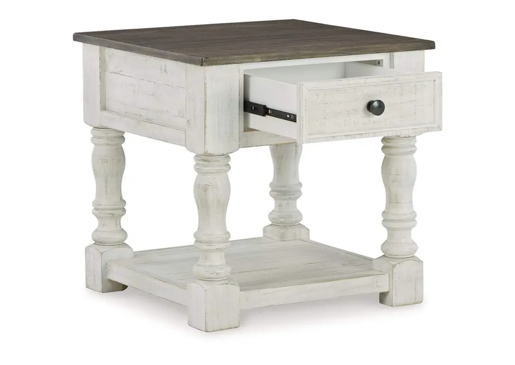 What a fresh interpretation of country classic style. Inspired by American farmhouse craftsmanship, but with an elevated sensibility, the Havalance square end table blends distinctive details such as turned post accents and raised drawer fronts for a substantial look that feels right at home. Those who appreciate rustic character should take note of the table’s thick crown moulding, beautified with a vintage two-tone finish. Robust legs lend a hearty, substantial feel ready to withstand the test of time. Weight 58.000 lbs. (26.1kgs.)