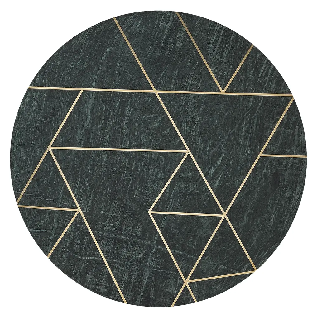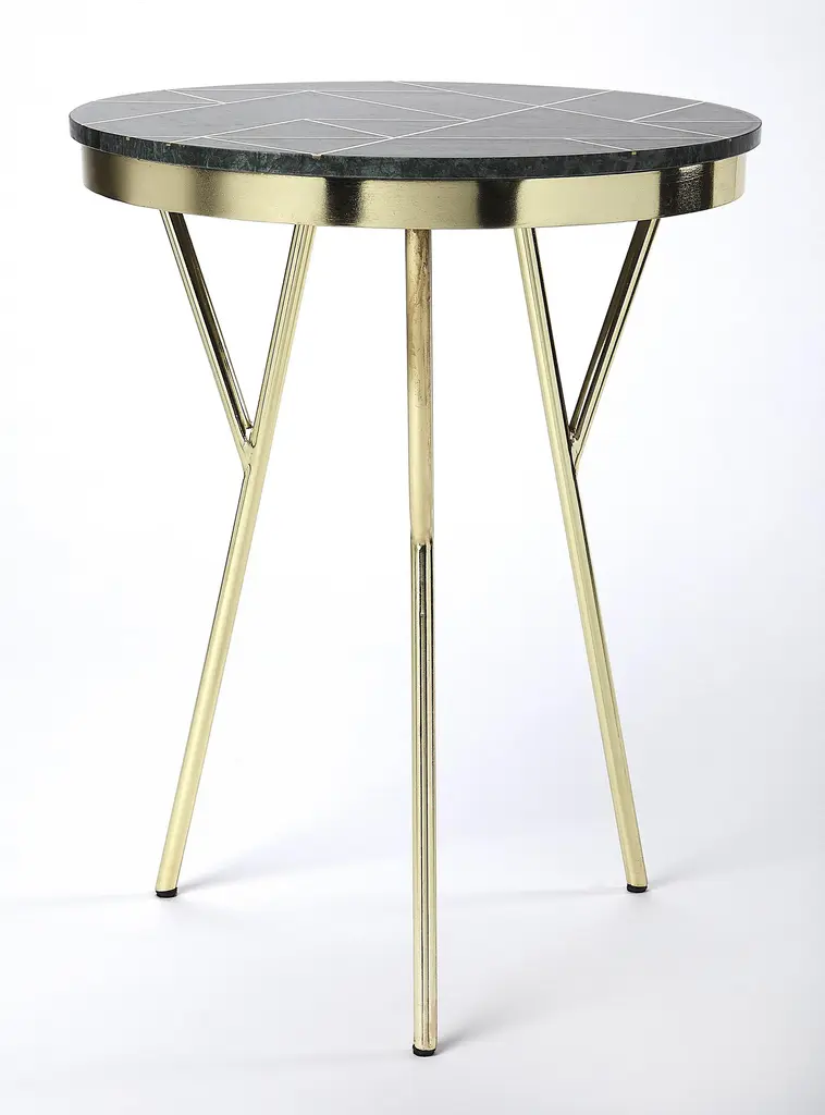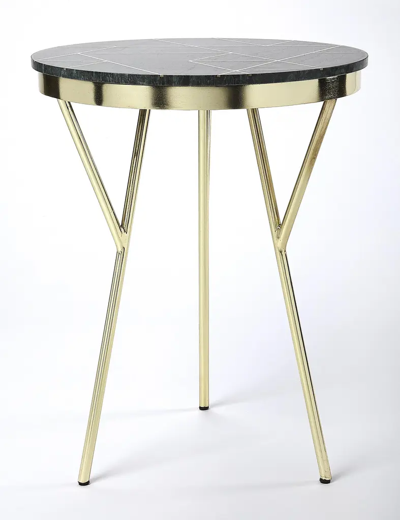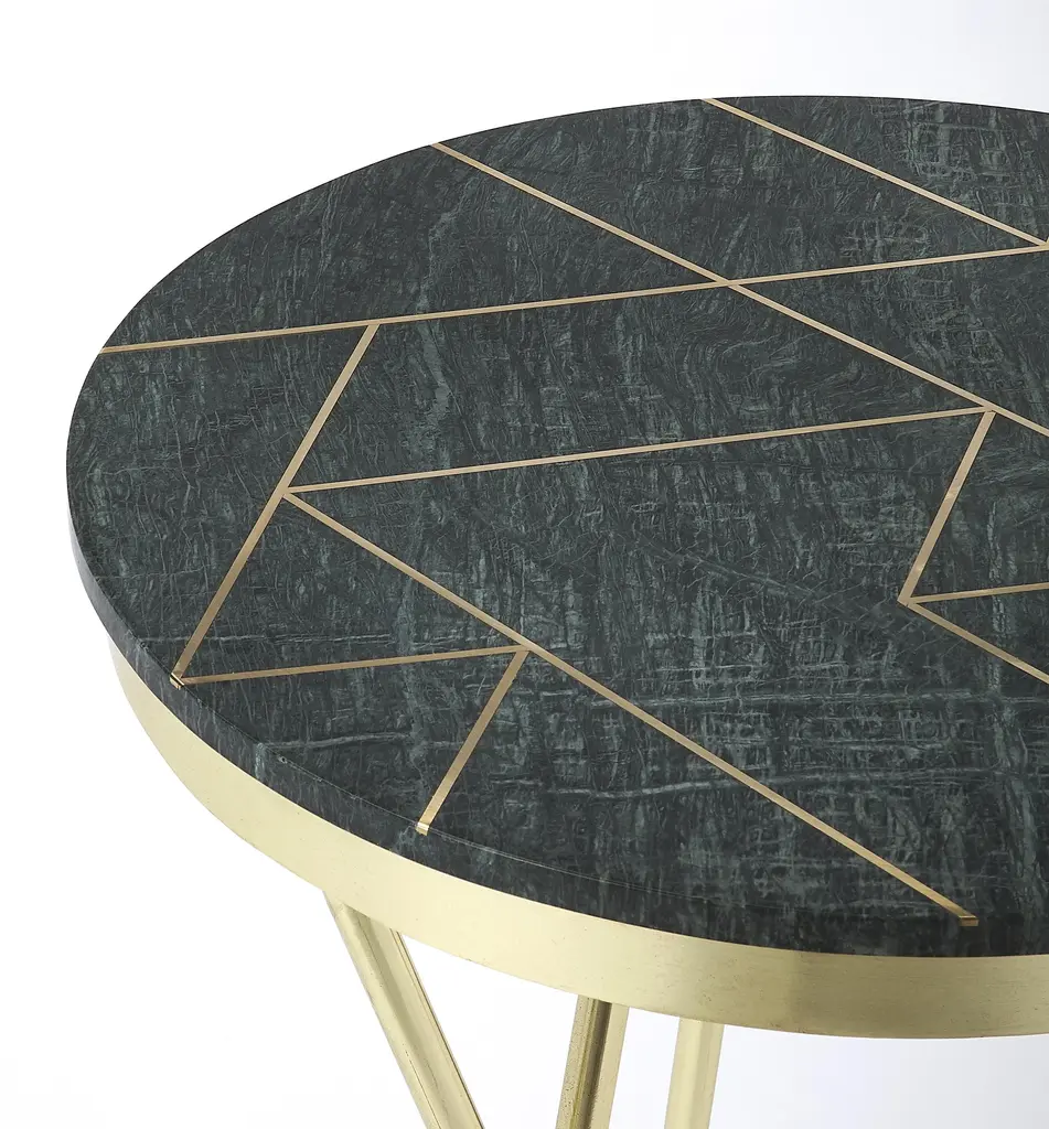 A beautiful contemporary design brings artwork onto your table top. The unique opportunity to display destinction while utilizing function can be yours. This green marble, contemporary design table top boasts an intricate yet modern appeal of brass inlay pattern design into the marble table top. The gold finish metal legs bring simplicity to the design yet lend to the distinction of this accent table. This table can stand alone and offer a beauty all of its own or paired with the additional collection style; twice the appeal. Durably Constructed With: Iron, Brass Finish, MDF,Marble, Brass Metal Inlay Design Product Construction Features: Finish Distressing Product Assembled Measurement & Weight: 23.5" H x 18.5" W x 18.5" D -- 25.0 lbs. 22 lbs. Suggested weight capacity Item Arrives: Needs Assembly Marble is a natural stone product and is known for its variation in color, carbon deposits and veining patterns. Variations in shade and markings are normal and can be expected with the natural materials used in the construction of this product. Due to the porous nature of marble, it is vulnerable to staining agents and high heat. Avoid placing hot or wet items on surface. Coasters recommended Photo may slightly differ from actual item in terms of color/finish due to the lighting during photo shoot or the monitor's display.
