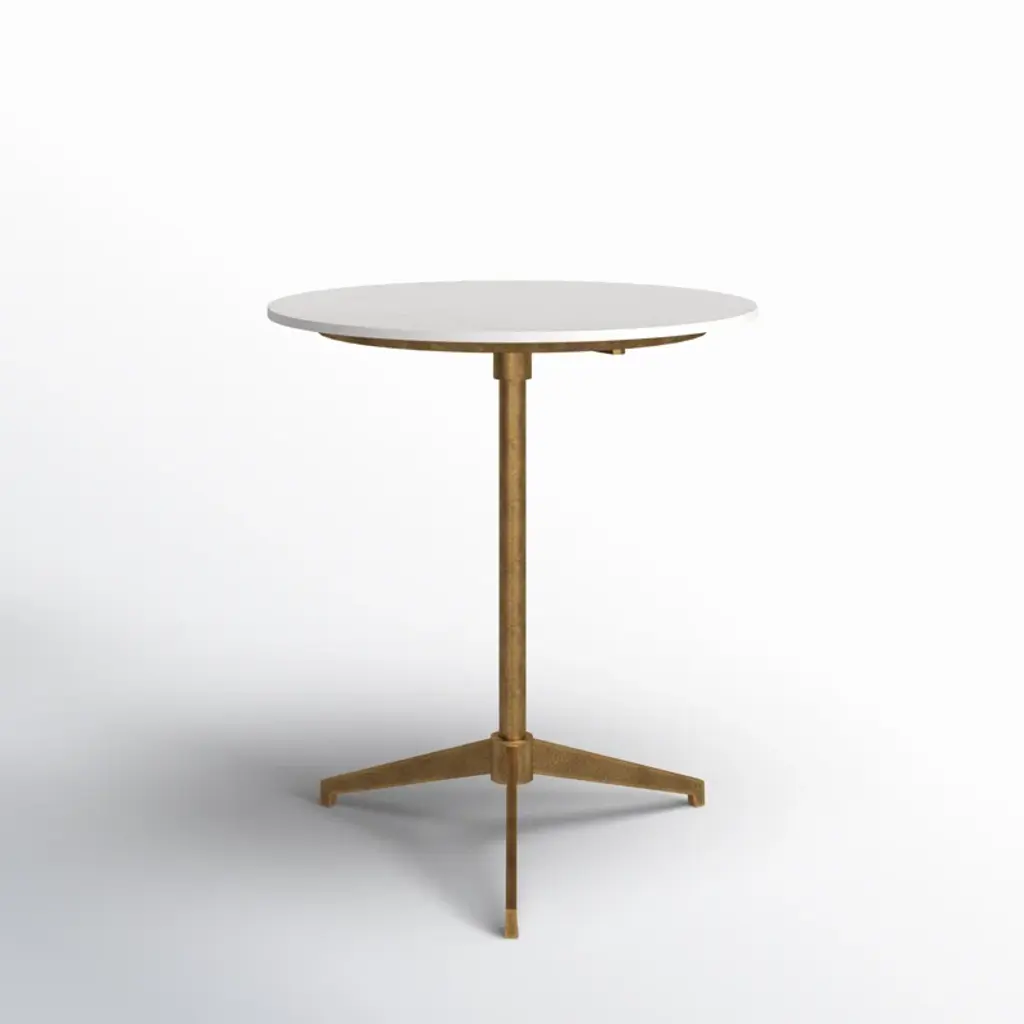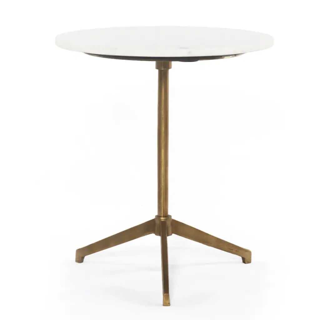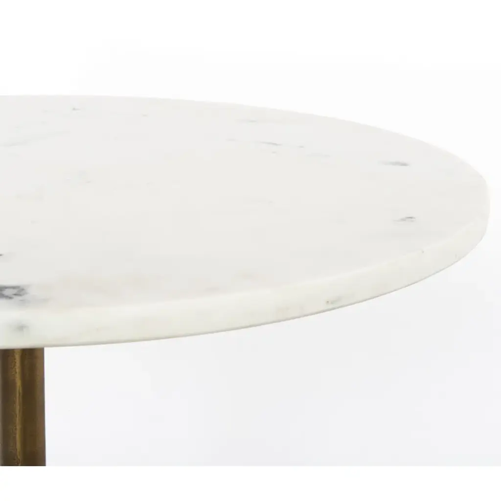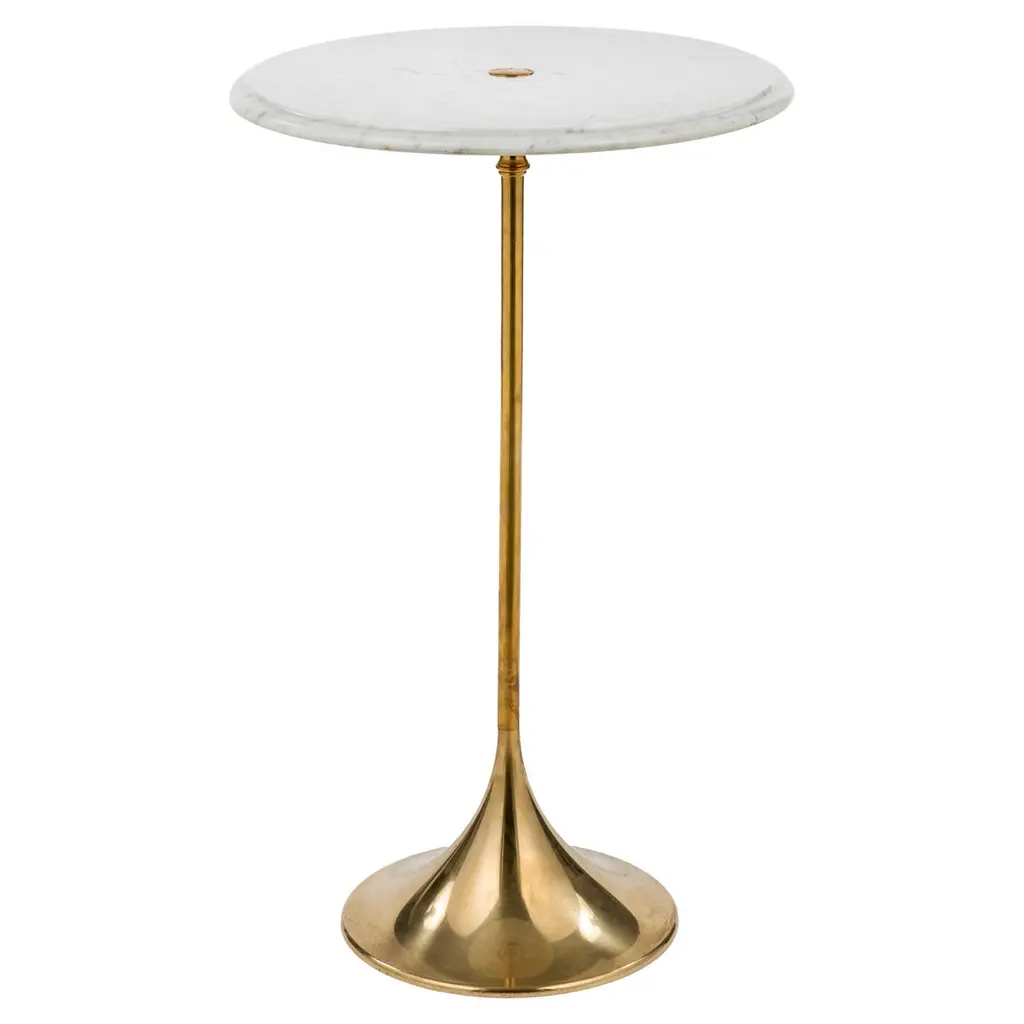Opposites do tend to attract. A leggy base in raw brass-finished aluminum plays up a refined, precisely shaped white marble top.
