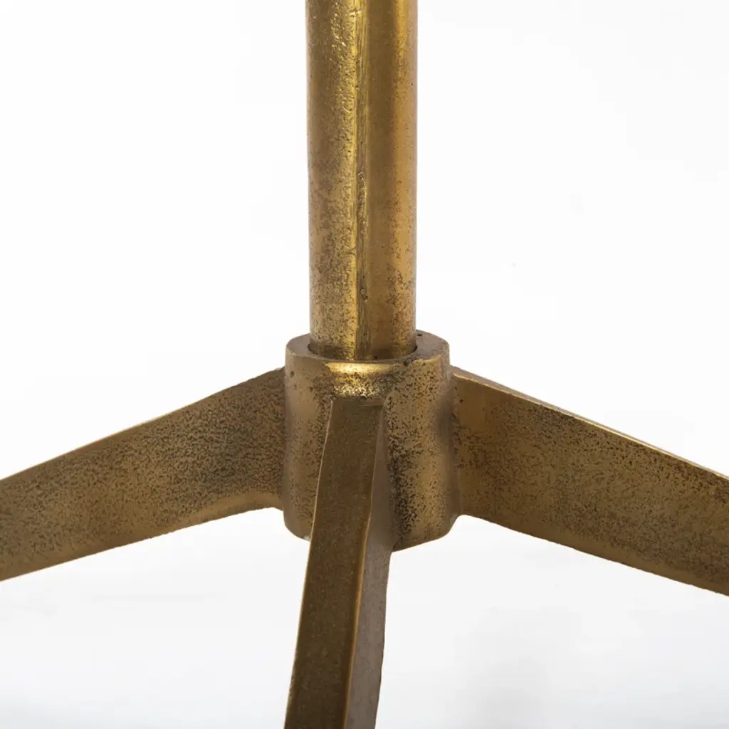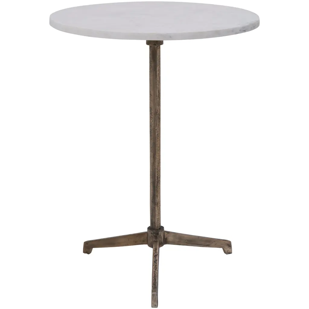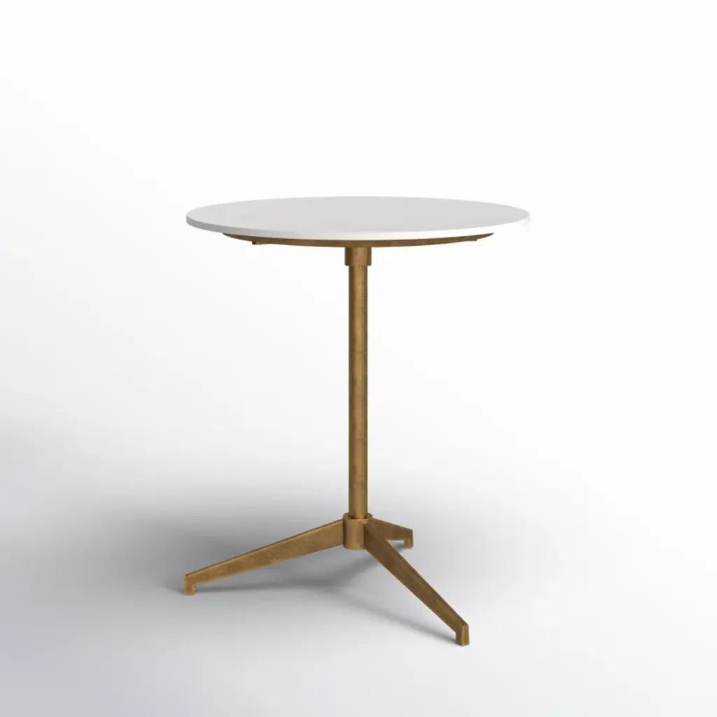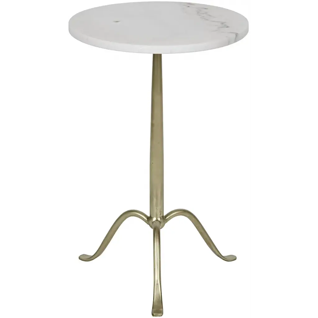 Opposites do tend to attract. A leggy base in raw brass-finished aluminum plays up a refined, precisely shaped white marble top.