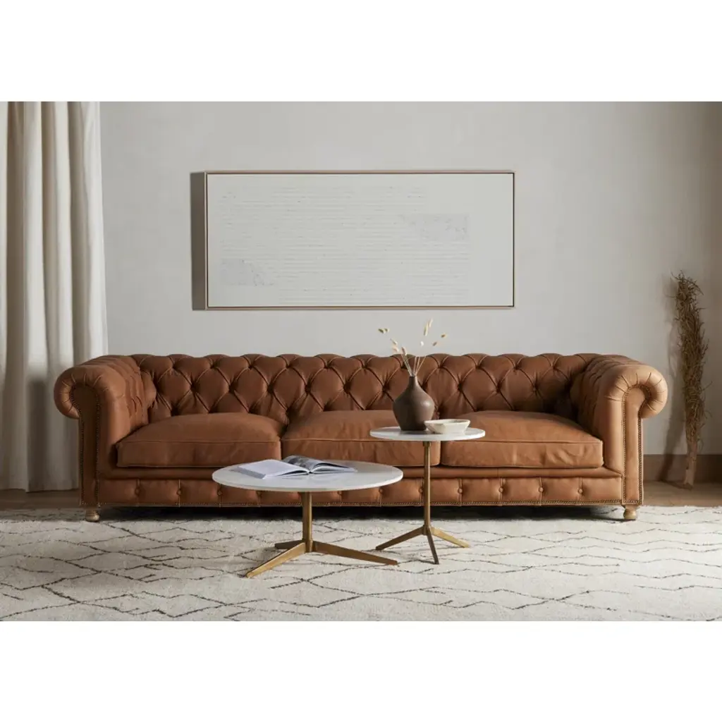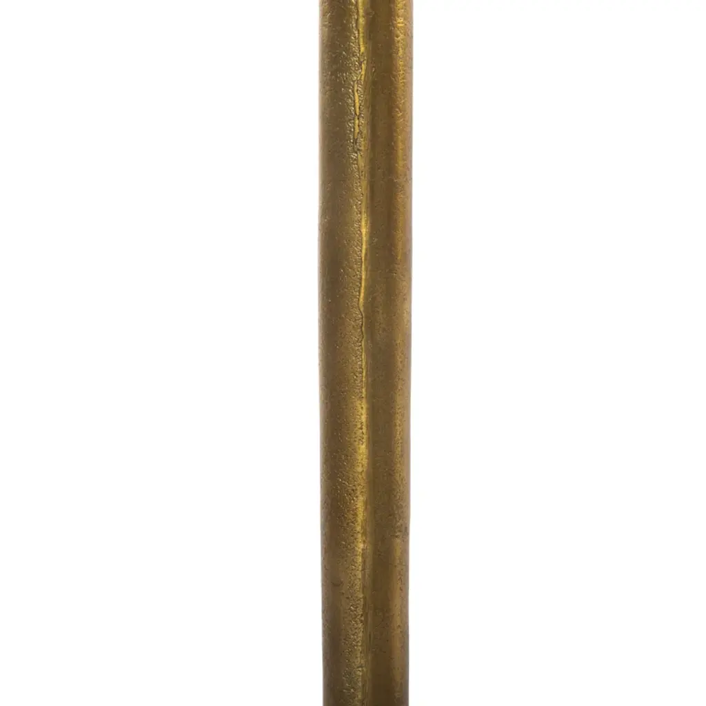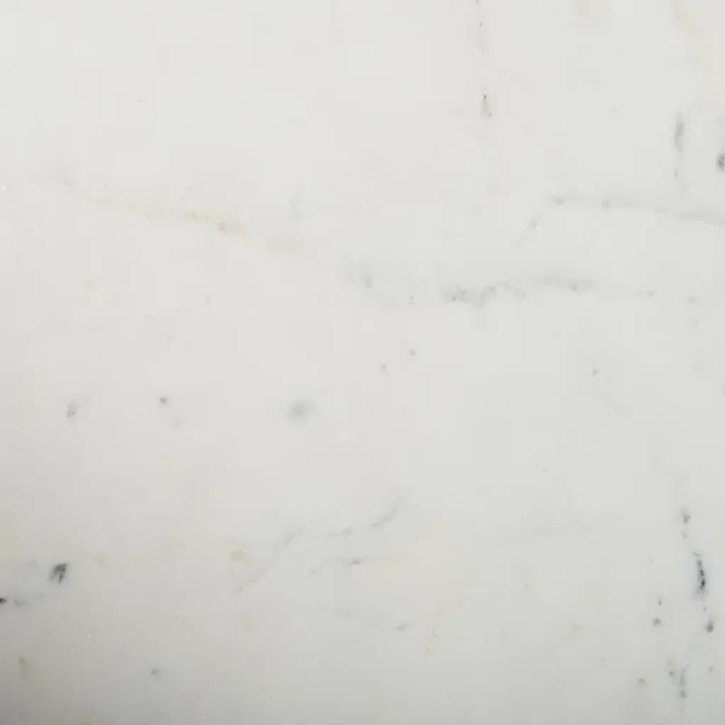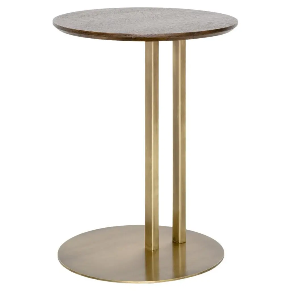 Opposites do tend to attract. A leggy base in raw brass-finished aluminum plays up a refined, precisely shaped white marble top.
