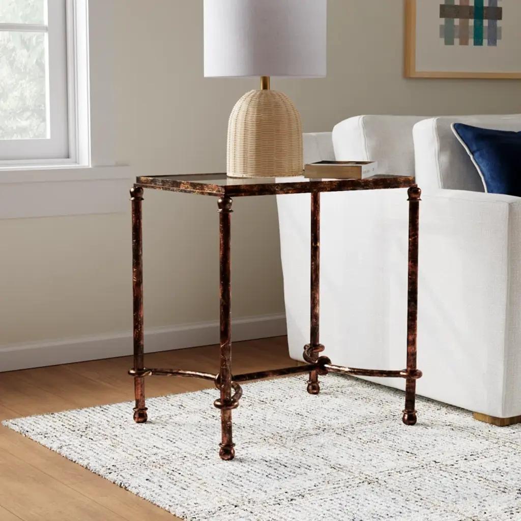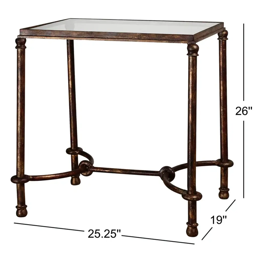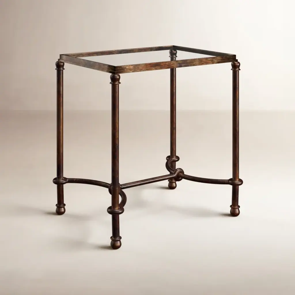 Inspired by ancient horse bridles, this accent table of forged iron is a blending of rings and curves finished in a rustic bronze patina. The top is made of clear, tempered glass and metal.