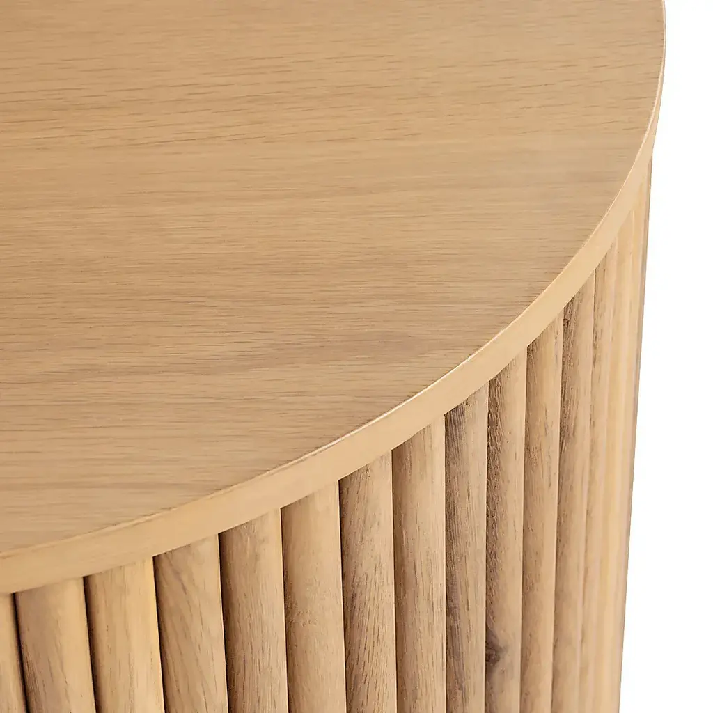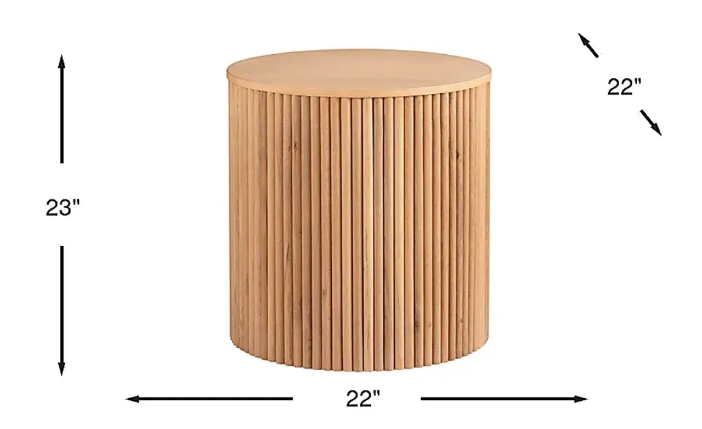 The serene spirit of nature comes to life in the Hendrik collection, where richly organic tones and textures ground your home in timeless warmth. Transitional in style, this round end table features oak veneers in a natural brown finish. The smooth, flat top offers ample surface space for styling, while the base is wrapped with vertical wooden slats that add depth and dimension.