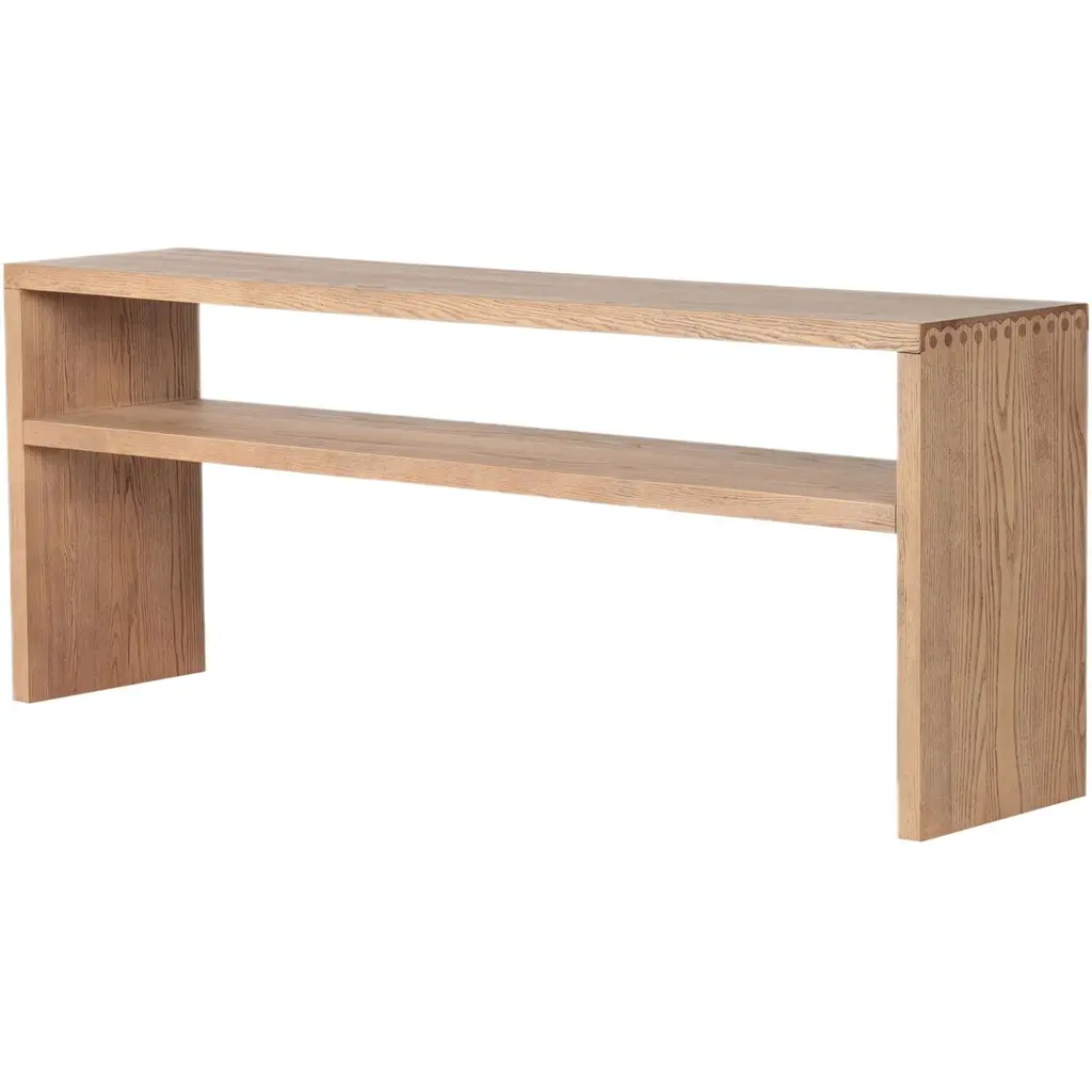 The Hendrix Console Table is a stunning addition to any living or media room, offering a sleek and open-style design that enhances the space with its clean lines. This console table is crafted with meticulous attention to detail, featuring a long and elegant form that provides ample surface area for display. The lower shelving offers additional storage, perfect for showcasing media, favorite books, and decorative items. Its versatile design ensures it complements a variety of interior styles, making it a timeless piece for your home.