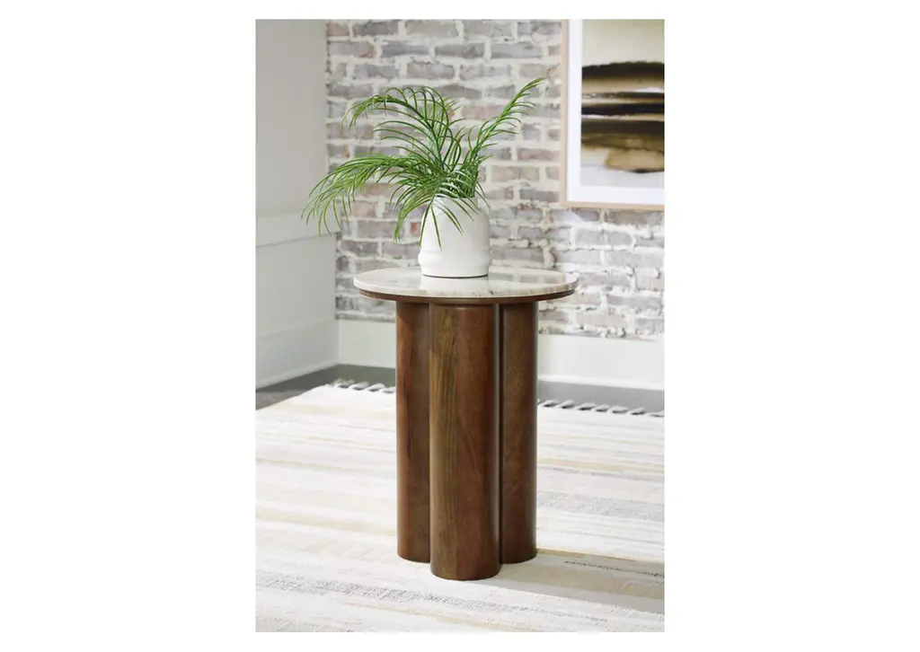 Simply elegant. The Henfield accent table combines the beauty of wood and stone, appealing to the luxurious but inviting vibe of your contemporary aesthetic. A beige marble top pairs with cylindrical legs in a brown finish, giving this refined piece an aura of welcoming warmth. It’s a homey take on highbrow design, balancing approachable character with your taste for elevated styling. Weight 46.000 lbs. (20.7kgs.)