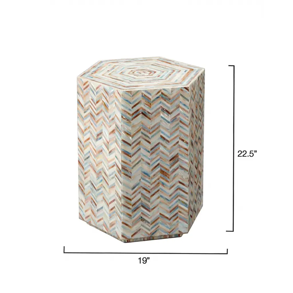 A jewel of the sea, Mother-of Pearl is a natural substance with rich luminescence, and each piece of it is unique. Small, multi-color strips of the iridescent material are carefully selected and expertly placed to create the intricate mosaics the cover every inch of these accent tables. Carefully contrasting their opulence with restraint, their geometrical shapes are kept deliberately simple. Place next to a neutral sofa or overstuffed chair to create a unique focal point to your room.